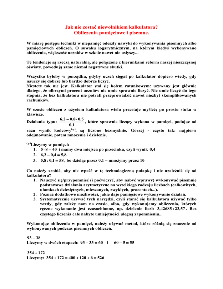 Jak nie zostać niewolnikiem kalkulatora? Obliczenia pamięciowe i pisemne. W miarę postępu techniki w niepamięć odeszły nawyki do wykonywania pisemnych albo pamięciowych obliczeń. O suwaku logarytmicznym, na którym kiedyś wykonywano obliczenia, większość uczniów w szkole nawet nie usłyszy... Te tendencje są rzeczą naturalną, ale połączone z kierunkami reform naszej nieszczęsnej oświaty, powodują same niemal negatywne skutki. Wszystko byłoby w porządku, gdyby uczeń sięgał po kalkulator dopiero wtedy, gdy nauczy się dobrze lub bardzo dobrze liczyć. Niestety tak nie jest. Kalkulator stał się kołem ratunkowym: używany jest głównie dlatego, że olbrzymi procent uczniów nie umie sprawnie liczyć. Nie umie liczyć do tego stopnia, że bez kalkulatora nie potrafi przeprowadzić nawet niezbyt skomplikowanych rachunków. W czasie obliczeń z użyciem kalkulatora wielu przestaje myśleć; po prostu stuka w klawisze. 6 , 2 − 0 ,8 ⋅ 0 ,5 Działania typu: , które sprawnie liczący wykona w pamięci, podając od 0,1 razu wynik końcowy(*), są liczone bezmyślnie. Gorzej - często tak: najpierw odejmowanie, potem mnożenie i dzielenie. ( ) * Liczymy w pamięci: 1. 5 ⋅ 8 = 40 i mamy dwa miejsca po przecinku, czyli wynik 0,4 2. 6,2 − 0,4 = 5,8 3. 5,8 : 0,1 = 58 , bo dzieląc przez 0,1 – mnożymy przez 10 Co należy zrobić, aby nie wpaść w tę technologiczną pułapkę i nie uzależnić się od kalkulatora? 1. Nauczyć się/przypomnieć (i poćwiczyć, aby nabyć wprawy) wykonywać pisemnie podstawowe działania arytmetyczne na wszelkiego rodzaju liczbach (całkowitych, ułamkach dziesiętnych, mieszanych, zwykłych, procentach...). 2. Poznać dodatkowe możliwości, jakie daje pamięciowe wykonywanie działań. 3. Systematycznie używać tych narzędzi, czyli starać się kalkulatora używać tylko wtedy, gdy zależy nam na czasie, albo, gdy wykonujemy obliczenia, których ręczne wykonanie jest czasochłonne, np. dzielenie liczb 3,42685 : 23,57 . Bez częstego liczenia całe nabyte umiejętności ulegną zapomnieniu... Wykonując obliczenia w pamięci, należy używać metod, które różnią się znacznie od wykonywanych podczas pisemnych obliczeń. 93 − 38 Liczymy w dwóch etapach: 93 − 33 = 60 i 354 + 172 Liczymy: 354 + 172 = 400 + 120 + 6 = 526 60 − 5 = 55 Można tu stosować różne techniki zależne od upodobań, lecz ich idea została w powyższych przykładach zilustrowana. Dużo większe możliwości liczenia pamięciowego daje mnożenie liczb. Przykłady. 1. 102 ⋅ 56 Licz tak: 100 ⋅ 56 = 5600 2 ⋅ 56 = 112 Razem: 5712 2. 25 ⋅ 73 Licz tak: 100 ⋅ 73 = 7300 25 ⋅ 73 to 4 razy mniej połowa z 7300 to 3650 połowa z 3650 to 1825 1 Dlaczego tak? Połowa z połowy to . W pamięci łatwiej podzielić przez 2, a przez 4 4 trudniej. 3. 992 Licz tak: 992 = 99 ⋅ 99 100 ⋅ 99 = 9900 1 ⋅ 99 = 99 9900 − 99 = 9801 4. 9 ⋅ 57 Licz tak: 10 ⋅ 57 = 570 1 ⋅ 57 = 57 570 − 57 = 513 5. 50 ⋅ 47 Licz tak: 100 ⋅ 47 = 4700 50 ⋅ 47 to połowa z 4700, czyli 2350 6. 15 ⋅ 62 Licz tak: 10 ⋅ 62 = 620 5 ⋅ 62 to połowa z 620, czyli 310. 620 + 310 = 930 Ogólnie: metodę dostosowujemy do mnożonych liczb. Warto ze względu na użyteczność (częste występowanie), nauczyć się mnożyć dwie liczby dwucyfrowe. Wyprowadzimy metodę takiego mnożenia. Mnożymy liczbę 10a + b przez 10x + y . (10a + b ) ⋅ (10x + y ) = 100ax + 10ay + 10bx + by = 100ax + 10 ⋅ (ay + bx) + by ax – to liczba setek wyniku, czyli jest to iloczyn cyfr dziesiątek obu liczb ay + bx - liczba dziesiątek wyniku to suma iloczynów cyfry dziesiątek jednej liczby przez cyfrę jedności drugiej by – liczba jedności wyniku (iloczyn cyfr jedności obu liczb) A teraz zastosujemy tą metodę mnożąc 48 ⋅ 56 : 1. Krok pierwszy: mnożymy cyfry jedności 8 ⋅ 6 = 48 Jedności mamy 8, a liczbę 4 zapamiętujemy (powiększy ona liczbę dziesiątek wyniku). Piszemy więc wynik mnożenia od tyłu: ...8 (i 4 pamiętamy). 2. Krok drugi: liczymy sumę iloczynów cyfry dziesiątek jednej liczby przez cyfrę jedności drugiej: 4 ⋅ 6 + 8 ⋅ 5 = 24 + 40 = 64 . 64 jest liczbą dziesiątek, ale z kroku pierwszego zostały nam jeszcze 4 dziesiątki, łącznie mamy 68 dziesiątek. Cyfrę 8 dopisujemy do wyniku: ...88, a liczbę 6 zapamiętujemy (powiększy ona liczbę setek wyniku). 3. Mnożymy cyfry dziesiątek: 4 ⋅ 5 = 20 i dodajemy zapamiętaną liczbę 6: 20 + 6 = 26 . Zapisujemy wynik: 2688. Jeszcze jeden przykład (bez opisu słownego): 37 ⋅ 29 = .....3 (pamiętamy 6) 37 ⋅ 29 = ....73 (pamiętamy 4) 37 ⋅ 29 = 1073 Dzielenie nie daje takich możliwości, jak mnożenie. Najczęściej wykonujemy je pisemnie, choć są wyjątki. Dobrym przykładem jest dzielenie przez liczby jednocyfrowe – tu piszemy wynik „z pamięci”. Przykład: 71487 : 9 71 dzielimy przez 9 i mamy pierwszą cyfrę wyniku: 7, bo 7 ⋅ 9 = 63 . Zapamiętujemy resztę z dzielenia: 71 − 63 = 8 . Do cyfry 8 „dopisujemy” w pamięci następną cyfrę dzielnej, czyli 4. Będziemy dzielić 84 przez 9: 9 i reszta 3. 9 dopisujemy do wyniku, mamy teraz 79, a do cyfry 3 „dopisujemy” 8. 38:9 daje 4 i resztę 2. Teraz wynik wygląda tak: 794, a do cyfry 2 „dopisujemy” 7. 27:9=3, czyli końcowy wynik: 7943. Taki ciąg czynności jest zwykłym dzieleniem pisemnym, ale piszemy sam wynik, a resztę obliczeń przeprowadzamy w pamięci. Pamiętajmy jednak, że wyjątków jest więcej. Dzielimy przez 20? To podzielmy przez 2, a potem przesuńmy przecinek o jedno miejsce w lewo (dzielenie przez 10). Dzielimy przez 50? To podzielmy przez 100, a potem pomnóżmy otrzymany wynik przez 2. I tak dalej, przykłady można mnożyć. Na koniec porozmawiamy nieco o obliczaniu pierwiastków. Można takie obliczenia przeprowadzać pisemnie, choć przydatna jest głównie umiejętność obliczania pierwiastka kwadratowego. Przed obliczeniem pierwiastka kwadratowego, np. 2237,29 „dzielimy” liczbę na dwucyfro