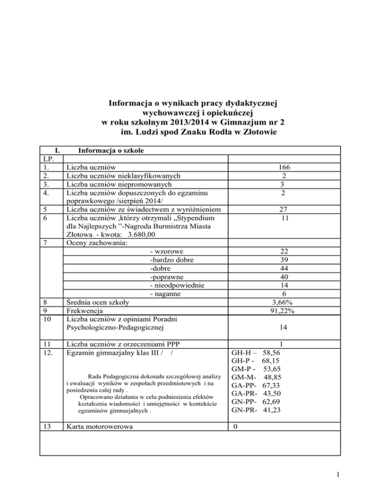 Informacja o wynikach pracy dydaktycznej wychowawczej i opiekuńczej w roku szkolnym 2013/2014 w Gimnazjum nr 2 im. Ludzi spod Znaku Rodła w Złotowie I. LP. 1. 2. 3. 4. 5 6 7 8 9 10 11 12. 13 Informacja o szkole Liczba uczniów Liczba uczniów nieklasyfikowanych Liczba uczniów niepromowanych Liczba uczniów dopuszczonych do egzaminu poprawkowego /sierpień 2014/ Liczba uczniów ze świadectwem z wyróżnieniem Liczba uczniów ,którzy otrzymali „Stypendium dla Najlepszych ”-Nagroda Burmistrza Miasta Złotowa - kwota: 3.680,00 Oceny zachowania: - wzorowe -bardzo dobre -dobre -poprawne - nieodpowiednie - naganne Średnia ocen szkoły Frekwencja Liczba uczniów z opiniami Poradni Psychologiczno-Pedagogicznej Liczba uczniów z orzeczeniami PPP Egzamin gimnazjalny klas III / / 166 2 3 2 27 11 22 39 44 40 14 6 3,66% 91,22% 14 Rada Pedagogiczna dokonała szczegółowej analizy i ewaluacji wyników w zespołach przedmiotowych i na posiedzeniu całej rady . Opracowano działania w celu podniesienia efektów kształcenia wiadomości i umiejętności w kontekście egzaminów gimnazjalnych . GH-H – GH-P GM-P GM-MGA-PPGA-PRGN-PPGN-PR- Karta motorowerowa 0 1 58,56 68,15 53,65 48,85 67,33 43,50 62,69 41,23 1 14 Osiągnięcia szkoły : Konkursy: 1. „Złota Żaba”- Fundacja EKOS / 9. / 1 uczeń -etap wojewódzki 2. „Globtroter e-szkoła /1/ 3. VI Olimpiada Ekologiczna / 3/ 4. „Świadomi na różowo”-k.plastyczny II miejsce 5. „Nie daj szns AIDS”k.plastyczny II miejsce 6.„Kartka w nowoczesnej szacie „- k.plastyczny , wyróżnienie 7. „Bądźmy zdrowi”- k.plastyczny /73ucz./ II miejsce ,wyróżnienie, 8 Festyn Ekonomii Społecznej- k.plastyczny II miejsce 9. Międzynarodowy Konkurs Matematyczny „Kangur” / 23/ 10. Olimpiada Wiedzy Archimedes / 18/ 11. „Pamięć o Powstaniu Wielkopolskim”-prezentacja /2/ 12. Konkurs Piosenki Tłumaczonej /2/ 13. Konkurs „Moja wizja Wielkiej Brytanii/2/ 14. Powiatowy Konkurs Bezpieczeństwa Ruchu Drogowego /3/ 15.”Najbliższe mi niemieckie słowo” 4 wyróżnienia 16. Warsztaty architektoniczne /1/ 17. „Rusz się „-k.fotograficzny /1/ II miejsce 18. I Powiatowy Konkurs o Pszczołach „/9/ III miejsce 19. Powiatowy Konkurs Ortograficzny w Jastrowiu (3) Konkursy organizowane w szkole: „ Salamandra „ -konkurs etap szkolny /19 / etap rej. / 26 / Organizacja etapu okręgowego/gościliśmy zespoły z kilku szkół- 26 ucz/ Konkurs Ortograficzny (11ucz.) „Najładniejszy stół wigilijny” –siedem klas „Laurka na Dzień Mamy” /4/ Konkursy przedmiotowe:/ 81 – 49% / chemia /7 ucz/ j.niemiecki / 4 ucz. / j.polski /10 / geografia / 7ucz./ matematyka / 22 / fizyka /6 / , biologia / 9 ucz./ j.angielski/8 / - e.rej. /1 / historia /7 / etap rej.1/ - / etap rejonowy / 1 / -3,04% etap wojewódzki / 1 / finalista/ - 0,6 % Święto Szkoły : 1. Wystawa IPN „Życie codzienne w okupowanej Wielkopolsce” cała szkoła + reprezentanci szkół + SP nr 2 2. Wykład IPN M.Podemski „Życie codzienne …. „ 3. 15-lecie Gimnazjum-gala 2 4.II Powiatowy Konkurs Wiedzy „Ludzie spod Znaku Rodła” III miejsce 5.Konkurs Plastyczny „Pozdrowienia ze Złotowszczyzny”/ I miejsce 5„Pozdrowienia ze Złotowszczyzny”- wydanie folderu Spotkania w Muzeum Ziemi Złotowskiej 1. „Obrzędy i tradycje bożonarodzeniowe na Krajnie” / 23 ucz./ 2. „Co i jak reklamowano w Złotowie przed wojną” /wystawa / (2 klasy) 3. Ludzie Spod Znaku Rodła – wykład 1a,b 4. „Peron I Powrót do Złotowa” film + spotkanie (6) 5. - „Noc Muzeów”- Maria Diduch (17) Warsztaty; 1. „Bohaterowie Krajny „ Zlot młodzieży w Górce Klasztornej –Łobżenica 6-7.09.13 / prezentacja 3 ucz. + 3 n-li / prof. M.Kokowski 2. „Norwid z Pasją „/ 12 kategorii /17 ucz. Miejska Biblioteka Publiczna 3. „Dobre maniery” – Magazyn Cafe / 20 ucz/ 4. Akademia dla Rodziców „Rodzic koordynatorem dalszej edukacji swojego dziecka „ / 82 osób/ 6. VIII Zakrzewski Sejmik Młodzieży „ W znaku Rodła nasza siła” (3) 7. „ Jak się uczyć” PPP kl.IIIa,b,c 8. Udział w projekcie „Świąteczna paczka dla polskiego kombatanta na KresachBoże Narodzenie 2013 „Stowarzyszenie Odra-Niemen” 9. Wirtualna wycieczka na Kresy – relacja z przekazania paczek „Stowarzyszenie Odra-Niemen” (cała szkoła) 10. Warsztaty plastyczne w ramach Euro Eco II miejsce Profilaktyka : 1. Spotkania z Powiatową Policją /wszystkie klasy/ 2. „Uzależnienia od marihuany ,telefonów i komputerów” Warsztaty profilaktyczne dla młodzieży (3kl.) 3. „ Jak nie ulegać presji mediów i rówieśników” (4 klasy) 4. „Stracone marzenia” spektakl 5. „Wyloguj się do życia” 6. „Nietykalni” spektakl profilaktyczny (3kl) Spotkania, prelekcje ,spektakle, kino, projekty szkolne ,wystawy.. „Kolędujmy Mu” pr. artystyczny dla SP nr 2 + Warsztaty Terapii Zajęciowej. (50) „Urodziny E.Jasiek-100 lat – wizyta w Zakrzewie „Spotkanie z planszówkami” 3 „Żywa lekcja historii „HUSARIA” (160) „Bitwa pod Grunwaldem” (replika obrazu-Starostwo) 7klas. Projekt „ Podniesienie jakości i dostępności usług publicznych w UM. (46 ucz.) „Złotów deja vu” – spotkanie autorskie z W.Pankiewiczem / 17/ - prezentacja hymnu, Projekt Kostka – udział młodzieży + poczet sztandarowy na mszy św. „ Saxohity- duet na klarnet i cztery saksofony „ Koncert /cała szkoła/ „Kolumbowie” -spektakl teatralny / 100 ucznów/ Piła Kino Helios /47ucz./ Piła Kino Helios / 45 ucz./ Piła Kino Helios „Naznaczeni” / 13 ucz/ Piła Kino Helios „Kamienie na szaniec” / 45 ucz/ Piła Kino Helios „Efekty specjalne w filmie –Persy Jackson” /45 ucz/ Piła Kino Helios „Epoka Lodowcowa” /47 ucz/ Badanie IBE - nauczyciele matematyki (2 ucz.) „Dziady” spektakl teatralny / 3 kl./ Wernisaż Alicji Modrak (23 ucz.) Zifon – Klub Fantastyki Hobbit” (130ucz.) / piątek –sobota/ Preorientacja zawodowa dla klas trzecich; - Spotkanie z pedagogiem PPPP (