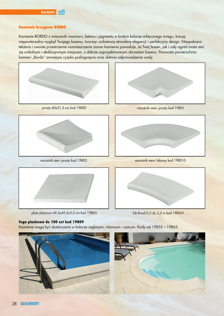 BASENY Kamienie brzegowe BORDO Kamienie BORDO z mieszanki marmuru, betonu i pigmentu w białym kolorze arktycznego śniegu, kreują niepowtarzalny wygląd Twojego basenu, tworząc unikatową atmosferę elegancji i perfekcyjny design. Niespokojna tekstura i swoiste przestrzenne rozmieszczenie ziaren kamienia powoduje, że Twój basen, jak i cały ogród może stać się unikalnym i ekskluzywnym miejscem, z dobrze zaprojektowanym obrzeżem basenu. Porowata powierzchnia kamieni „Bordo” zmniejsza ryzyko poślizgnięcia oraz ułatwia odprowadzenie wody. prosty 60x31,5 cm kod 19800 narożnik wew. prosty kod 19801 narożnik zew. prosty kod 19802 narożnik wew. łukowy kod 198010 płyta plażowa 49,5x49,5x3,5 cm kod 19803 łuk R=od 0,5 do 2,5 m kod 198041…. fuga piaskowa do 100 szt kod 19809 Kamienie mogą być dostarczone w kolorze ceglanym, różowym i szarym. Kody od 19855 – 19863. 28