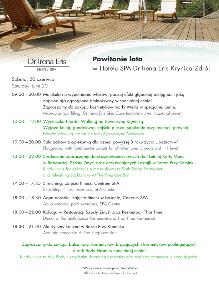 Powitanie lata w Hotelu SPA Dr Irena Eris Krynica Zdrój Sobota, 20 czerwca Saturday, June 20 09.00—20.00 Molekularne wypełnianie włosów, poczuj efekt głębokiej pielęgnacji jaką zapewniają egzogenne aminokwasy w specjalnej cenie! Zapraszamy do zakupu kosmetyków marki Wella w specjalnej cenie. Molecular hair filling, Dr Irena Eris Skin Care Institute invites in special price! 10.00—12.00 Wycieczka Nordic Walking na Jaworzynę Krynicką. Wyjazd koleją gondolową, zejście pieszo, spotkanie przy recepcji głównej Nordic Walking trip on the top of Jaworzyna Mountain 10.00—20.00 Sala zabaw z opiekunką dla dzieci powyżej 3 roku życia , poziom –1 Playground with hotel auntie awaits for children over 3 years old , -1 level 13.00—22.00 Serdecznie zapraszamy do skosztowania nowych dań Letniej Karty Menu w Restauracji Szósty Zmysł oraz orzeźwiających koktajli w Barze Przy Kominku Kindly invite for delicious summer dishes to Sixth Sense Restaurant and refreshing cocktails to At The Fireplace Bar 17.00—17.45 Stretching, zajęcia fitness, Centrum SPA Stretching, fitness exercises, SPA Centre 18.00—18.30 Aqua aerobic, zajęcia fitness w basenie, Centrum SPA Aqua aerobic, pool exercises, SPA Centre 18.00—22.00 Kolacja w Restauracji Szósty Zmysł oraz Restauracji Thai Time Dinner at the Sixth Sense Restaurant and Thai Time Restaurant 18.30—21.30 Akustyczny koncert w Barze Przy Kominku Acoustic concert in At The Fireplace Bar Zapraszamy do zakupu balsamów, kosmetyków brązujących i kosmetyków peelingujących z serii Body Fiesta w specjalnej cenie! Kindly invite to buy Body Fiesta balm, bronzing cosmetics and peeleng cosmetics in special price! Wszystkie animacje są bezpłatne! All the activities are free of charge!