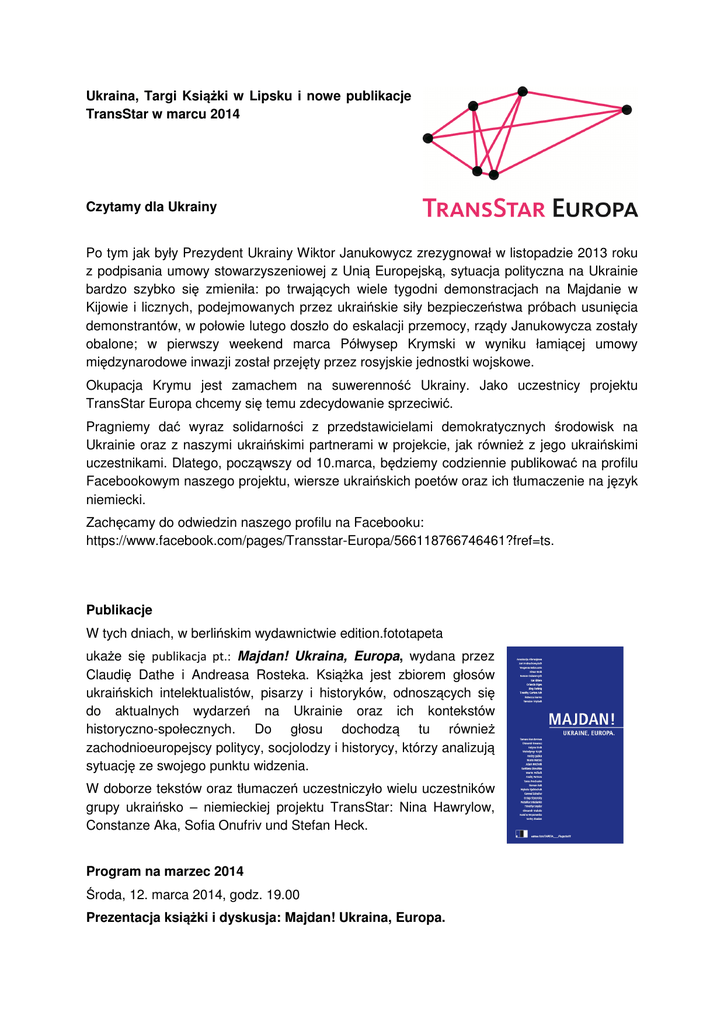 Ukraina, Targi Książki w Lipsku i nowe publikacje TransStar w marcu 2014 Czytamy dla Ukrainy Po tym jak były Prezydent Ukrainy Wiktor Janukowycz zrezygnował w listopadzie 2013 roku z podpisania umowy stowarzyszeniowej z Unią Europejską, sytuacja polityczna na Ukrainie bardzo szybko się zmieniła: po trwających wiele tygodni demonstracjach na Majdanie w Kijowie i licznych, podejmowanych przez ukraińskie siły bezpieczeństwa próbach usunięcia demonstrantów, w połowie lutego doszło do eskalacji przemocy, rządy Janukowycza zostały obalone; w pierwszy weekend marca Półwysep Krymski w wyniku łamiącej umowy międzynarodowe inwazji został przejęty przez rosyjskie jednostki wojskowe. Okupacja Krymu jest zamachem na suwerenność Ukrainy. Jako uczestnicy projektu TransStar Europa chcemy się temu zdecydowanie sprzeciwić. Pragniemy dać wyraz solidarności z przedstawicielami demokratycznych środowisk na Ukrainie oraz z naszymi ukraińskimi partnerami w projekcie, jak również z jego ukraińskimi uczestnikami. Dlatego, począwszy od 10.marca, będziemy codziennie publikować na profilu Facebookowym naszego projektu, wiersze ukraińskich poetów oraz ich tłumaczenie na język niemiecki. Zachęcamy do odwiedzin naszego profilu na Facebooku: https://www.facebook.com/pages/Transstar-Europa/566118766746461?fref=ts. Publikacje W tych dniach, w berlińskim wydawnictwie edition.fototapeta ukaże się publikacja pt.: Majdan! Ukraina, Europa, wydana przez Claudię Dathe i Andreasa Rosteka. Książka jest zbiorem głosów ukraińskich intelektualistów, pisarzy i historyków, odnoszących się do aktualnych wydarzeń na Ukrainie oraz ich kontekstów historyczno-społecznych. Do głosu dochodzą tu również zachodnioeuropejscy politycy, socjolodzy i historycy, którzy analizują sytuację ze swojego punktu widzenia. W doborze tekstów oraz tłumaczeń uczestniczyło wielu uczestników grupy ukraińsko – niemieckiej projektu TransStar: Nina Hawrylow, Constanze Aka, Sofia Onufriv und Stefan Heck. Program na marzec 2014 Środa, 12. marca 2014, godz. 19.00 Prezentacja książki i dyskusja: Majdan! Ukraina, Europa. Pisarz Juri Andruchowycz stwierdził lapidarnie: „Kiedy opowiadamy się na Europą, chodzi również o naszą niezależność. O prawa człowieka oraz o wolność. To nie są tylko piękne słowa, to jest cała prawda…” Naoczni świadkowie, pisarze, poeci i intelektualiści z Ukrainy zebrali swoje teksty, aby stworzyć z nich „Historyczny obraz chwili obecnej”. Ta napisana w bardzo krótkim czasie książka, prezentuje osobiste przeżycia autorów tekstów, a ponadto zawiera opisy warunków życia na Ukrainie, które zostały ukazane na tle wybranych aspektów z historii tego państwa. W centrum dyskusji z trzema autorami niniejszego tomu znajdzie się aktualna sytuacja na Ukrainie, związana z okupacją Krymu przez Rosję. Nie zabraknie w niej również odniesień do stosunków ukraińsko – rosyjskich. Wieczór autorski z Andrijem Ljubką (pisarz, Warszawa/Ushgorod), Yevgenią Belorusets, (pisarka i fotograf, Kijew/Berlin), Andrijem Portnovem, (historyk, Berlin/Dnipropetrowsk) i Kyrylem Savinem, (przedstawiciel Fundacji Heinricha Bölla Heinrich-Böll-Stiftung, Kijów) Prowadzący: Walter Kaufmann, Fundacja Heinricha Bölla Heinrich-Böll-Stiftung, Berlin Miejsce: Heinrich-Böll-Stiftung, Schumannstr. 8, 10117 Berlin Wydarzenia podczas Targów Książki w Lipsku 13. – 16. marca 2014 Od 13 do 16 marca uczestnicy europejskiego projektu TransStar Europa będą czytać teksty współczesnych pisarzy, których akcja usytuowana jest w dzisiejszej Europie. Są to historie o tożsamości, braku ojczyzny, wykorzenieniu, obcości, nowym początku, oraz o granicach – ich przesuwaniu i przekraczaniu. Czwartek, 13. marca, godz. 15.00– 16.00 Spotkanie z uczestnikami projektu TransStar na stoisku chorwackim (I) - surrealizm Magda Wlostowska i Katharina Kowarczyk zaprezentują fragmeny utworów: Die Rückkehr des alten Warans autorstwa Michaela Ajvaza (Czechy) w tłumaczeniu Katki Ringesovej Der 2-Gigabyte-Stick, autorem tekstu jest Jurij Izdryk (Ukraina) a autorką przekładu Constanze Aka Bestiarium Tomasza Różyckiego (Polska) w tłumaczeniu Marleny Breuer Balladynen und Romanzen Ignacego Karpowicza (Polska) w przekładzie Kathariny Kowarczyk Miejsce: stoisko Chorwackiego Ministerstwa Kultury, hala 4, D 402 Piątek, 14. marca, godz. 14.00– 15.00 Prezentacja książki i dyskusja: Majdan! Ukraina, Europa Ukraińscy pisarze Serhij Zhadan (Charków) i Oksana Forostyna (Kijów) zaprezentują tom Majdan! Ukraina, Europa oraz poprowadzą duskusję na temat aktualnej sytuacji na Ukrainie. Spotkanie z pisarzem Serhijem Zhadanem, Charków (Ukraina) oraz pisarką i socjolożką Oxaną Forostyną, Kijów (Ukraina). Prowadzący: Claudia Dathe, europejski projekt TransStar Europa (Tybinga) Miejsce: Stoisko ukraińskich wydawnictw i Lwowskich Targów Książki, hala 4 E 506 Piątek, 14. marca, godz. 15.00 – 16.00 Spotkanie z uczestnikami projektu TransStar na stoisku chorwackim (II) – historia Europy jako historia rodzinna Sofia Onufriv, Maja Konstantinović i Martina Lisa zaprezentują fragmenty utworów: Zinandali autorstwa Myroslawa Dotschyneza (Ukraina) w tłumaczeniu Niny Hawrylow Scheiß doch auf die tausend Dinar autorstwa Borisa Dežulovića (Chorwacja) w tłumaczeniu Maji Konstantinović Die Deutschen. Geografie eines Verlustes tłumaczeniu Martiny Lisy autorstwa Jakuba Katalpa( Czechy) w Miejsce: stoisko Chorwackiego Ministerstwa Kultury, hala 4, D 402 Sobota, 15. marca, godz. 15.00 – 16.00 Spotkanie z uczestnikami projektu TransStar na stoisku chorwackim (III) – historia Europy jako historia pamięci Franziska Mazi i Maja Konstantinović zaprezentują fragmenty utworów: Die Teekanne mit dem chinesischen Kaiser autorstwa Dzwinki Matijasch (Ukraina) w tłumaczeniu Constanze Aka Gulasz z turula Krzysztofa Vargi (Polska) w tłumaczeniu Melanie Foik Rosen Stanji Hra