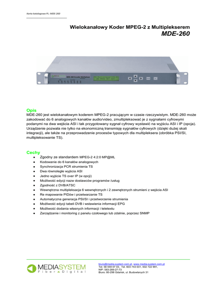 Karta katalogowa PL: MDE-260 ___________________________ Wielokanałowy Koder MPEG-2 z Multiplekserem MDE-260 MDE-260 Encoder Multiplexer Opis MDE-260 jest wielokanałowym koderem MPEG-2 pracującym w czasie rzeczywistym. MDE-260 może zakodować do 6 analogowych kanałów audio/video, zmultipleksować je z sygnałami cyfrowymi podanymi na dwa wejścia ASI i tak przygotowany sygnał cyfrowy wystawić na wyjściu ASI i IP (opcja). Urządzenie pozwala nie tylko na ekonomiczną transmisję sygnałów cyfrowych (dzięki dużej skali integracji), ale także na przeprowadzenie procesów typowych dla multipleksera (obróbka PSI/SI, multipleksowanie TS). Cechy Zgodny ze standardem MPEG-2 4:2:0 MP@ML Kodowanie do 6 kanałów analogowych Synchronizacja PCR strumienia TS Dwa równoległe wyjścia ASI Jedno wyjście TS over IP (w opcji) Możliwość edycji nazw dostawców programów /usług Zgodność z DVB/ATSC Wewnętrzna multipleksacja 6 wewnętrznych i 2 zewnętrznych strumieni z wejścia ASI Re mapowanie PIDów i przetwarzanie TS Automatyczna generacja PSI/SI i przetworzenie strumienia Możliwość edycji tabeli DVB i wstawienia informacji EPG Możliwość dodania własnych informacji i teletextu Zarządzanie i monitoring z panelu czołowego lub zdalnie, poprzez SNMP _______________________________________________________________________ [email protected], www.media-system.com.pl Tel. 58 559 07 03, Tel. 603 743 031, 502 722 991, NIP: 583-289-27-73 Biuro: 80-298 Gdańsk, ul. Budowlanych 31 Karta katalogowa PL: MDE-260 ___________________________ Parametry techniczne WEJŚCIA Analog VIDEO Ilość Złącza Format video 6 wejść (composite) BNC PAL /NTSC Analog AUDIO Ilość Złącza 6 niezależnych Cinch L, Cinch P (RCA) Strumień transportowy TS Ilość wejść Złącza Port RS 232 Długość pakietów wejściowych Impedancja wejściowa Wejściowa szybkość bitów 2 x ASI BNC Tak, 1szt. 188 lub 204 75Ω do 100Mbps Liczba PID na wejście Max 600 Liczba PMT na wejście Max 100 KODOWANIE VIDEO / AUDIO Kodowanie video 4:2:0 MP@ML Struktura GOP (grupa obrazów) I, IP, IPB, IPBB Rozmiar GOP Szybkość bitowa video Kodowanie audio Szybkość bitowa audio Tryb audio 6-96 1-15Mbps MPEG-1 poziom II 64-384kbps Stereo, joint stereo, dwa kanały, mono WYJŚCIE PO MULTIPLEKSACJI Ilość Impedancja Długość pakietów wyjściowych 2 x ASI 75Ω 188 lub 204 TS over IP 1 (w opcji) Szybkość bitowa do 80Mbps Ilość PIDów na wyjściu do 600 Ilość PMT na wyjściu do 100 Standard TS DVB/ATSC _______________________________________________________________________ [email protected], www.media-system.com.pl Tel. 58 559 07 03, Tel. 603 743 031, 502 722 991, NIP: 583-289-27-73 Biuro: 80-298 Gdańsk, ul. Budowlanych 31 Karta katalogowa PL: MDE-260 ___________________________ STEROWANIE I MONITOROWANIE Lokalnie Pełne zarządzanie z panelu czołowego z wykorzystaniem wyświetlacza LCD i klawiszy funkcyjnych Zdalne Oprogramowanie do zarządzania poprzez sieć; dostęp Ethernet 10/100 poprzez RJ45 POZOSTAŁE Zasilanie Napięcie zasilania AC 100-250V, 50/60Hz Pobór mocy Max 50W Wymiary Standard obudowy 19” / 1U Rozmiar obudowy 44 x 430 x 335 mm (opakowanie: 210 x 580 x 570mm) Waga 4,5 kg netto Przykład typowej aplikacji MDE-260 Widok panelu tylnego _______________________________________________________________________ [email protected], www.media-system.com.pl Tel. 58 559 07 03, Tel. 603 743 031, 502 722 991, NIP: 583-289-27-73 Biuro: 80-298 Gdańsk, ul. Budowlanych 31