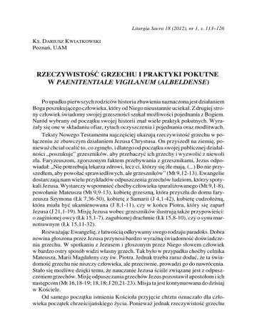 Liturgia Sacra 18 (2012), nr 1, s. 113–126 KS. DARIUSZ KWIATKOWSKI Poznań, UAM RZECZYWISTOŚĆ GRZECHU I PRAKTYKI POKUTNE W PAENITENTIALE VIGILANUM (ALBELDENSE) Po upadku pierwszych rodziców historia zbawienia naznaczona jest działaniem Boga poszukującego człowieka, który od Niego nieustannie uciekał. Z drugiej strony człowiek świadomy swojej grzeszności szukał możliwości pojednania z Bogiem. Naród wybrany od początku swojej historii znał wiele praktyk pokutnych. Wyrażały się one w składaniu ofiar, rytach oczyszczenia i pojednania oraz modlitwach. Teksty Nowego Testamentu najczęściej ukazują rzeczywistość grzechu w połączeniu ze zbawczym działaniem Jezusa Chrystusa. On przyszedł na ziemię, ponieważ chciał ocalić to, co zginęło, i dlatego od początku swojej publicznej działalności „poszukuje” grzeszników, aby przebaczyć ich grzechy i wyzwolić z niewoli zła. Faryzeuszom, zgorszonym faktem przebywania z grzesznikami, Jezus odpowiadał: „Nie potrzebują lekarza zdrowi, lecz ci, którzy się źle mają. (...) Bo nie przyszedłem, aby powołać sprawiedliwych, ale grzeszników” (Mt 9,12-13). Ewangelie dostarczają nam wielu przykładów odpuszczenia grzechów ludziom, którzy spotykali Jezusa. Wystarczy wspomnieć choćby człowieka sparaliżowanego (Mt 9,1-8), powołanie Mateusza (Mt 9,9-13), kobietę grzeszną, która przyszła do domu faryzeusza Szymona (Łk 7,36-50), kobietę z Samarii (J 4,1-42), kobietę cudzołożną, która miała być ukamienowana (J 8,1-11), czy w końcu Piotra, który się zaparł Jezusa (J 21,1-19). Misję Jezusa wobec grzeszników ilustrują także przypowieści: o zaginionej owcy (Łk 15,1-7), zagubionej drachmie (Łk 15,8-10), czy o synu marnotrawnym (Łk 15,11-32). Rozważając Ewangelię, z łatwością odkrywamy swego rodzaju paradoks. Dobra nowina głoszona przez Jezusa przynosi bardzo wyraźną świadomość doświadczenia grzechu. W spotkaniu z Jezusem i głoszonym przez Niego słowem człowiek w bardzo ostry sposób widzi własny grzech. Tak było w przypadku choćby celnika Mateusza, Marii Magdaleny czy św. Piotra. Jednak trzeba zaraz dodać, że ta świadomość grzechu nie niszczy człowieka, ale przeciwnie, prowadzi go do nawrócenia. Stało się możliwe dzięki temu, że nauczanie Jezusa ściśle związane jest z odpuszczeniem grzechów. Misję odpuszczania grzechów Jezus pozostawił apostołom i ich następcom (Mt 16,18-19; 18,18; J 20,21-23). Misja ta jest kontynuowana do dzisiaj w Kościele. Od samego początku istnienia Kościoła przyjęcie chrztu oznaczało dla człowieka początek chrześcijańskiego życia. Ponieważ jednak rzeczywistość grzechu 114 KS. DARIUSZ KWIATKOWSKI nie była obca człowiekowi także po chrzcie, życie chrześcijanina stawało się procesem nieustannego nawracania się. W związku z tym we wspólnotach chrześcijańskich od początku istniały określone praktyki pokutne, poprzez które człowiek doznawał oczyszczenia z grzechu. Praktyki te na przestrzeni wieków były bardzo zróżnicowane i zależały od ciężkości popełnionego grzechu. W niniejszym artykule chcemy przyjrzeć się rozumieniu grzechu oraz praktykom pokutnym w najstarszej hiszpańskiej księdze pokutnej zatytułowanej: Księga Pokutna Vigilanum z miasta Albeda – Paenitentiale Vigilanum (Albeldense). Penitencjały są ściśle związane z nową formą pokuty, która narodziła się na Wyspach Brytyjskich w V i VI w. W tamtych rejonach Kościół nie znał pokuty kanonicznej, stosowanej w Rzymie i w Kościele zachodnim, ale od początku praktykował pokutę indywidualną i powtarzalną. W pierwszej części artykułu przybliżona zostanie ta forma pokuty. W trosce o poprawność stosowania tej formy pokuty oraz uniknięcie nadużyć powstawały księgi pokutne zwane penitencjałami. Te księgi są mało znane w literaturze polskiej. W drugiej części artykułu zostanie przedstawiony katalog grzechów i taryf pokutnych, które trzeba było wypełnić, aby uzyskać rozgrzeszenie na podstawie penitencjału Vigilanum. 1. Narodziny pokuty taryfikowanej Praktykowana w Kościele pokuta instytucjonalna, która była niepowtarzalna i często bardzo surowa, doprowadziła do pewnego kryzysu pokuty. Jednym z przejawów tego kryzysu był fakt odkładania pokuty na ostatnie lata życia. Również taki sposób sprawowania pokuty był uciążliwy dla biskupów, którzy przyjmowali do stanu pokutników i udzielali rozgrzeszenia. Od VI w. chrześcijaństwo przyjmowały całe narody i biskupi nie byli w stanie dotrzeć do wszystkich ludzi, którzy pragnęliby podjąć pokutę1. Rozwiązanie tej trudnej sytuacji przyszło z Kościoła w Irlandii i Wielkiej Brytanii. W Kościele irlandzkim, który z racji odległości nie miał zbyt wielu kontaktów z Rzymem, praktykowano zupełnie inny sposób pokuty. Zakonnicy przebywający w klasztorach wyznawali swoje grzechy kapłanom lub niekapłanom i od nich otrzymywali pokutę. Po jej odbyciu wracali do kapłanów, aby otrzymać rozgrzeszenie. W tych regionach wcale nie znano pokuty publicznej. Korzystano ze spowiedzi wielokrotnie i zależnie od potrzeby. W przypadku wyznawania win przed osobą, która nie była kapłanem, nie można było mówić o spowiedzi sakramentalnej2. 1 Por. S. CZERWIK, Wprowadzenie do odnowionej liturgii pokuty i pojednania, w: A. SKOWRONEK, S. CZERWIK, M. CZAJKOWSKI (red.), Sakrament pokuty. Teologia. Liturgia. Pismo Święte, Katowice 1980, s. 165–166. 2 Por. B. NADOLSKI, Liturgika, t. III: Sakramenty, sakramentalia, błogosławieństwa, Poznań 1992, s. 96. RZECZYWISTOŚĆ GRZECHU I PRAKTYKI POKUTNE W PAENITENTIALE VIGILANUM 115 Kościół irlandzki ustalał zadośćuczynienie za grzechy według wyznaczonych pokut za określone grzechy. Można powiedzieć, że za konkretny grzech istniała pewna „taryfa” pokutna. Dlatego ten sposób sprawowania pokuty nazywał się w historii „pokutą taryfikowaną”. Ta forma pokuty sprawiła odej