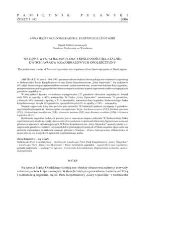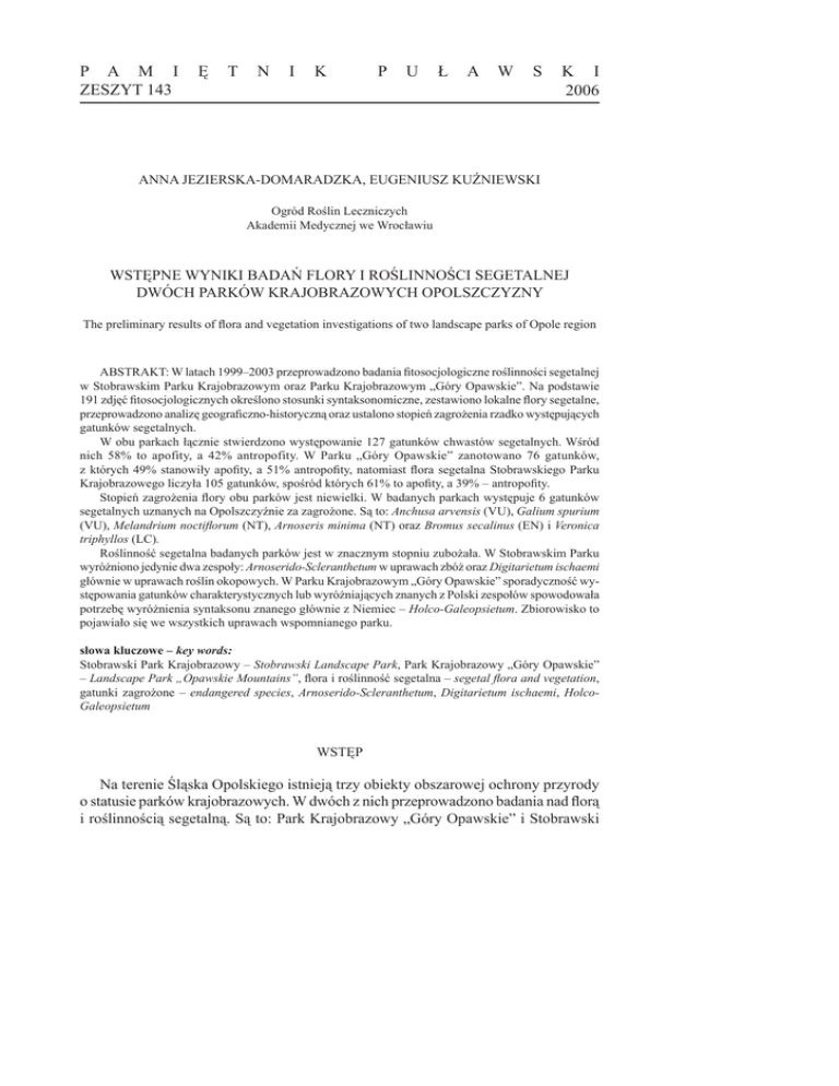 P A M I ZESZYT 143 Ę T N I K P U Ł A W S K I 2006 ANNA JEZIERSKA-DOMARADZKA, EUGENIUSZ KUŹNIEWSKI Ogród Roślin Leczniczych Akademii Medycznej we Wrocławiu WSTĘPNE WYNIKI BADAŃ FLORY I ROŚLINNOŚCI SEGETALNEJ DWÓCH PARKÓW KRAJOBRAZOWYCH OPOLSZCZYZNY The preliminary results of flora and vegetation investigations of two landscape parks of Opole region ABSTRAKT: W latach 1999–2003 przeprowadzono badania fitosocjologiczne roślinności segetalnej w Stobrawskim Parku Krajobrazowym oraz Parku Krajobrazowym „Góry Opawskie”. Na podstawie 191 zdjęć fitosocjologicznych określono stosunki syntaksonomiczne, zestawiono lokalne flory segetalne, przeprowadzono analizę geograficzno-historyczną oraz ustalono stopień zagrożenia rzadko występujących gatunków segetalnych. W obu parkach łącznie stwierdzono występowanie 127 gatunków chwastów segetalnych. Wśród nich 58% to apofity, a 42% antropofity. W Parku „Góry Opawskie” zanotowano 76 gatunków, z których 49% stanowiły apofity, a 51% antropofity, natomiast flora segetalna Stobrawskiego Parku Krajobrazowego liczyła 105 gatunków, spośród których 61% to apofity, a 39% – antropofity. Stopień zagrożenia flory obu parków jest niewielki. W badanych parkach występuje 6 gatunków segetalnych uznanych na Opolszczyźnie za zagrożone. Są to: Anchusa arvensis (VU), Galium spurium (VU), Melandrium noctiflorum (NT), Arnoseris minima (NT) oraz Bromus secalinus (EN) i Veronica triphyllos (LC). Roślinność segetalna badanych parków jest w znacznym stopniu zubożała. W Stobrawskim Parku wyróżniono jedynie dwa zespoły: Arnoserido-Scleranthetum w uprawach zbóż oraz Digitarietum ischaemi głównie w uprawach roślin okopowych. W Parku Krajobrazowym „Góry Opawskie” sporadyczność występowania gatunków charakterystycznych lub wyróżniających znanych z Polski zespołów spowodowała potrzebę wyróżnienia syntaksonu znanego głównie z Niemiec – Holco-Galeopsietum. Zbiorowisko to pojawiało się we wszystkich uprawach wspomnianego parku. słowa kluczowe – key words: Stobrawski Park Krajobrazowy – Stobrawski Landscape Park, Park Krajobrazowy „Góry Opawskie” – Landscape Park „Opawskie Mountains”, flora i roślinność segetalna – segetal flora and vegetation, gatunki zagrożone – endangered species, Arnoserido-Scleranthetum, Digitarietum ischaemi, HolcoGaleopsietum. WSTĘP Na terenie Śląska Opolskiego istnieją trzy obiekty obszarowej ochrony przyrody o statusie parków krajobrazowych. W dwóch z nich przeprowadzono badania nad florą i roślinnością segetalną. Są to: Park Krajobrazowy „Góry Opawskie” i Stobrawski 76 Ogród Roślin Leczniczych – Akademia Medyczna we Wrocławiu [2] Park Krajobrazowy. Pierwszy z nich powstał w roku 1988 na powierzchni 4 625 ha, drugi w roku 1999 i zajmuje obszar 52 637 ha. W obu przeważają lasy, a powierzchnia użytków rolnych nie przekracza 30% powierzchni parków (4, 7). Celem przeprowadzonych badań było sformułowanie odpowiedzi na pytania, czy flora i roślinność tych dwóch obszarów chronionych różni się od pozostałej części województwa opolskiego i województw sąsiednich oraz czy wśród występujących gatunków są takie, które mają status wymierających lub zagrożonych wymarciem. MATERIAŁ I METODY Stobrawski Park Krajobrazowy znajduje się na Równinie Opolskiej 318.57 (12). Pod względem klimatycznym jest to najcieplejszy fragment województwa opolskiego i jeden z cieplejszych w Polsce. Średnia temperatura roczna wynosi 8,5oC, a ilość opadów rocznych – około 650 mm (4). Gleby pól, na których przeprowadzono badania, należą do dwóch kompleksów rolniczej przydatności: żytniego słabego (na glebach brunatnych wyługowanych, wytworzonych z piasków słabo gliniastych zalegających średnio głęboko na piasku luźnym) oraz kompleksu żytniego dobrego (na glebach płowych, wytworzonych z piasków gliniastych lekkich zalegających płytko na piasku luźnym); (17). Park Krajobrazowy „Góry Opawskie” leży w północnej części mezoregionu Góry Opawskie 332.63 (12). Pod względem klimatycznym jest on podobny do innych obszarów górskich, chociaż najwyższe wzniesienie (Biskupia Kopa) wynosi zaledwie 890 m n.p.m. Średnia temperatura roczna to 6,5oC (24), a roczna ilość opadów – około 850 mm (3). Mimo dość dużej mozaiki gleb, przeważają brunatne gleby gliniaste, powstałe ze skał metamorficznych (6) i tworzą pszenny górski kompleks rolniczej przydatności (22). Na terenie omawianych parków krajobrazowych w latach 1999–2003 wykonano 191 zdjęć fitosocjologicznych metodą Braun-Blanqueta (23). W Stobrawskim Parku liczba zdjęć wynosiła 135, a reprezentowały one następujące uprawy: zboża ozime (żyto i pszenżyto) 62 zdjęcia, zboża jare (owies, pszenica, jęczmień i mieszanki) 25, łubin 13, ziemniaki 35 zdjęć. W Parku „Góry Opawskie” wykonano 56 zdjęć: 28 w zbożach ozimych (pszenica, jęczmień), 10 w zbożach jarych (pszenica, jęczmień), 8 w rzepaku oraz 10 w uprawie okopowych (ziemniak, buraki). Materiały te były podstawą analizy flory i roślinności. Wyróżniając grupy synantropijne posłużono się geograficzno-historyczną klasyfikacją Kornasia (13, 14). Klasyfikację syntaksonomiczną przyjęto za Matuszkiewiczem (18) i Kuźniewskim (16). Stopień zagrożenia gatunków segetalnych ustalono według Nowaka i Spałka (20). Nomenklaturę gatunków roślin naczyniowych podano za Mirkiem i in. (19). [3] Wstępne wyniki badań flory i roślinności segetalnej... – A. Jezierska-Domaradzka i in. 77 WYNIKI I DYSKUSJA Na polach uprawnych w dwóch parkach krajobrazowych Opolszczyzny zanotowano w okresie badań występowanie 127 gatunków segetalnych. Wśród nich 58% to apofity, a 42% – antropofity (tab. 1). Wyniki te są podobne do wyników uzyskanych przez autorów (10) dla pól uprawnych północno-zachodniej części powiatu opolskiego oraz wyników Anioł-K