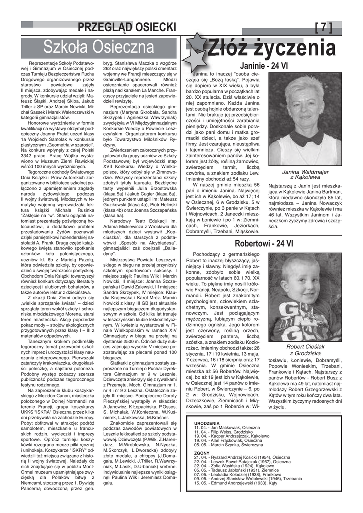 PRZEGLĄD OSIECKI Szkoła Osieczna Reprezentacje Szkoły Podstawowej i Gimnazjum w Osiecznej podczas Turnieju Bezpieczeństwa Ruchu Drogowego organizowanego przez starostwo powiatowe zajęły II miejsca, zdobywając medale i nagrody. W konkursie udział wzięli: Mateusz Śląski, Andrzej Skiba, Jakub Triller z SP oraz Marcin Nowicki, Michał Sassek i Marek Walenczewski w kategorii gimnazjalistów. Honorowe wyróżnienie w formie kwalifikacji na wystawę otrzymał podopieczny Joanny Prałat uczeń klasy 1a Wojciech Samolak w konkursie plastycznym „Geometria w szarości”. Na konkurs wpłynęły z całej Polski 3342 prace. Pracę Wojtka wystawiono w Muzeum Ziemi Rawickiej wśród 100 innych wyróżnionych. Tegoroczne obchody Światowego Dnia Książki i Praw Autorskich zorganizowane w bibliotece szkolnej połączono z upamiętnieniem zagłady narodu żydowskiego podczas II wojny światowej. Młodszych w tematykę wojenną wprowadzała lektura książki Michała Rusinka "Zaklęcie na "w". Starsi oglądali natomiast prezentację poświęconą holocaustowi, a dodatkowo problem prześladowania Żydów poznawali dzięki pamiętnikowi holenderskiej nastolatki A. Frank. Drugą część książkowego święta stanowiło spotkanie członków koła polonistycznego, uczniów kl. 6b z Mariolą Pazołą, która odwiedziła szkołę, by opowiedzieć o swojej twórczości poetyckiej. Obchodom Dnia Książki towarzyszył również konkurs dotyczący literatury dziecięcej i ulubionych bohaterów, a także autorów lektur z dzieciństwa. Z okazji Dnia Ziemi odbyło się „wielkie sprzątanie świata” – dzieci sprzątały teren wokół szkoły i schroniska młodzieżowego Morena, starsi teren miasteczka. Akcję poprzedził pokaz mody – strojów ekologicznych przygotowanych przez klasy I – III z materiałów odpadowych. Tanecznym krokiem podkreśliły tegoroczny temat przewodni szkolnych imprez i uroczystości klasy nauczania zintegrowanego. Pierwszaki zatańczyły krakowiaczka, drugoklasiści poleczkę, a najstarsi poloneza. Podobny występ zobaczy szersza publiczność podczas tegorocznego festynu rodzinnego. Na zaproszenie klubu koszykarskiego z Mezidon-Canon, miasteczka położonego w Dolnej Normandii na terenie Francji, grupa koszykarzy UKKS "ISKRA" Osieczna przez kilka dni przebywała na zachodzie Europy. Pobyt obfitował w atrakcje: podróż samolotem, mieszkanie u francuskich rodzin, wycieczki i imprezy sportowe. Oprócz turnieju koszykówki rozegrano mecze piłki ręcznej i unihokeja. Koszykarze "ISKRY" odwiedzili też miejsca związane z historią II wojny światowej. Należały do nich znajdujące się w pobliżu MontOrmel muzeum upamiętniające zwycięską dla Polaków bitwę z Niemcami, stoczoną przez 1. Dywizję Pancerną dowodzoną przez gen. bryg. Stanisława Maczka o wzgórze 262 oraz największy polski cmentarz wojenny we Francji mieszczący się w Grainville-Langannerie. Młodzi osiecznianie spacerowali również plażą nad kanałem La Manche. Francuscy przyjaciele na jesień zapowiedzieli rewizytę. Reprezentacja osieckiego gimnazjum (Martyna Skrobała, Sandra Skrzypek i Agnieszka Wawrzyniak) zwyciężyła w VI Międzygimnazjalnym Konkursie Wiedzy o Powiecie Leszczyńskim. Organizatorem konkursu było Towarzystwo Miłośników Rydzyny. Zwieńczeniem całorocznych przygotowań dla grupy uczniów ze Szkoły Podstawowej był wojewódzki etap XVII Konkursu Wiedzy o Wielkopolsce, który odbył się w Zimnowodzie. Wszyscy reprezentanci szkoły zdobyli tytuły laureata. Bezbłędne testy wypełnili Julia Brzostowska (klasa 5a) i Jakub Cugier (klasa 6a), jednym punktem ustąpili im: Mateusz Guzikowski (klasa 4a), Piotr Heliński (klasa 4b) oraz Joanna Szczepańska (klasa 5a). Narodowy Teatr Edukacji im. Adama Mickiewicza z Wrocławia dla młodszych dzieci wystawił „Kopciuszka”, dla starszych z podstawówki „Sposób na Alcybiadesa”, gimnazjaliści zaś obejrzeli „Balladynę”. Mistrzostwa Powiatu Leszczyńskiego w biegu na przełaj przyniosły szkolnym sportowcom sukcesy. I miejsce zajęli: Paulina Wilk i Marcin Nowicki, II miejsce: Joanna Szczepańska i Dawid Zalewski, III miejsce: Sandra Skrzypek, IV miejsce: Klaudia Krajewska i Karol Mróz. Marcin Nowicki z klasy III GB jest aktualnie najlepszym biegaczem długodystansowym w szkole. Od kilku lat trenuje w leszczyńskim klubie lekkoatletycznym. W kwietniu wystartował w Finale Wielkopolskim w ramach XIV Gimnazjady w biegu na przełaj na dystansie 2500 m. Odniósł duży sukces zajmując wysokie V miejsce pozostawiając za plecami ponad 100 biegaczy. Siatkarki z gimnazjum zostały zaproszone na Turniej o Puchar Dyrektora Gimnazjum nr 9 w Lesznie. Dziewczęta zmierzyły się z rywalkami z Przemętu, Moch, Gimnazjum nr 1, nr 4 i nr 9 z Leszna. Ostatecznie zajęły III miejsce. Podopieczne Doroty Pieczyńskiej wystąpiły w składzie: A.Janowicz, K Łopacińska, P.Osses, S. Michalak, W.Konieczna, W.Kuśnierek, L.Jankowska, M.Kraśner. Znakomicie zaprezentowali się podczas zawodów powiatowych w Lesznie lekkoatleci ze szkoły podstawowej. Dziewczęta (P.Wilk, Z.Harendarz, M.Wróblewska, N.Nyczka, M.Skorczyk, L.Dworacka) zdobyły złote medale, a chłopcy (J.Domagała, M.Lewicki, J.Triller, R.Wawrzyniak, M.Lasik, D.Urbaniak) srebrne. Indywidualnie najlepsze wyniki osiągnęli Paulina Wilk i Jeremiasz Domagała. [7] Złóż życzenia Janinie - 24 VI Janina to inaczej “osoba ciesząca się „Bożą łaską”. Pojawia się dopiero w XIX wieku, a była bardzo popularna w początkach lat 20. XX stulecia. Dziś właściwie o niej zapomniano. Każda Janina jest osobą hojnie obdarzoną talentami. Nie brakuje jej przedsiębiorczości i umiejętności zarabiania pieniędzy. Doskonale sobie poradzi jako pani domu i matka gromadki dzieci, a także jako szef firmy. Jest czarująca, nieustępliwa i tajemnicza. Cieszy się wielkim zainteresowaniem panów. Jej kolorem jest żółty, rośliną żarnowiec, zwierzęciem termit, liczbą c