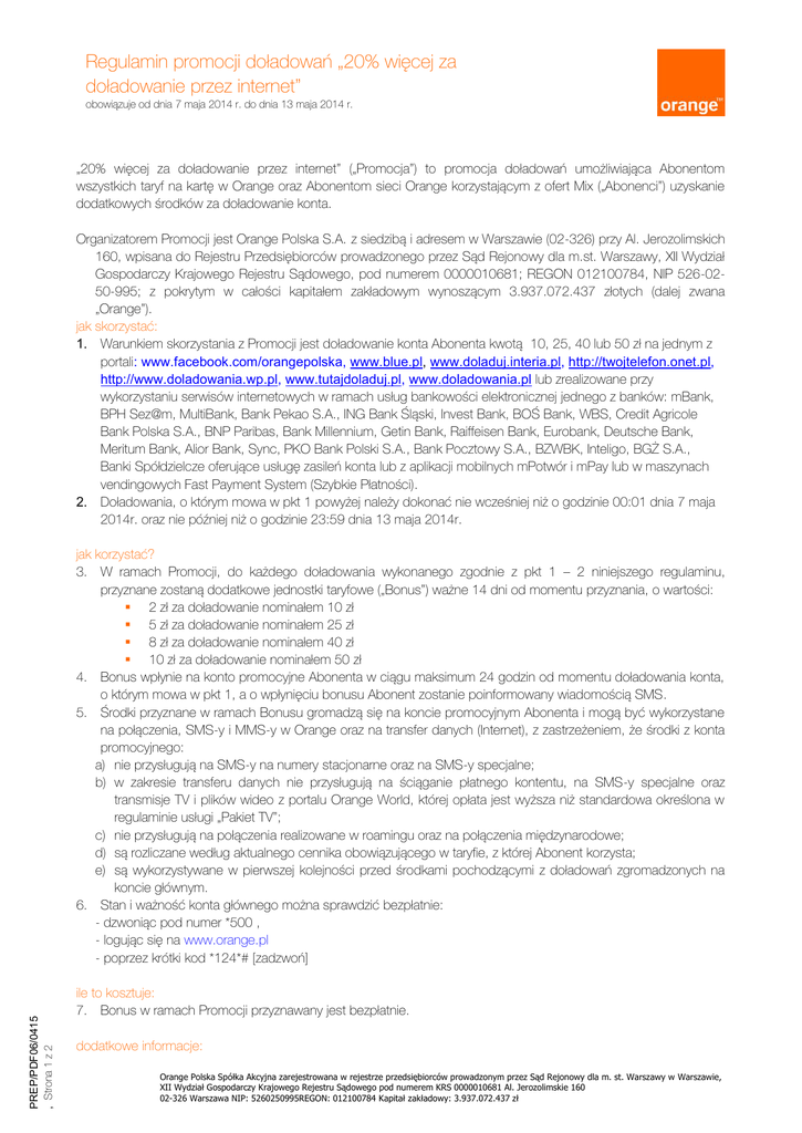 Regulamin promocji doładowań „20% więcej za doładowanie przez internet” obowiązuje od dnia 7 maja 2014 r. do dnia 13 maja 2014 r. „20% więcej za doładowanie przez internet” („Promocja”) to promocja doładowań umożliwiająca Abonentom wszystkich taryf na kartę w Orange oraz Abonentom sieci Orange korzystającym z ofert Mix („Abonenci”) uzyskanie dodatkowych środków za doładowanie konta. Organizatorem Promocji jest Orange Polska S.A. z siedzibą i adresem w Warszawie (02-326) przy Al. Jerozolimskich 160, wpisana do Rejestru Przedsiębiorców prowadzonego przez Sąd Rejonowy dla m.st. Warszawy, XII Wydział Gospodarczy Krajowego Rejestru Sądowego, pod numerem 0000010681; REGON 012100784, NIP 526-0250-995; z pokrytym w całości kapitałem zakładowym wynoszącym 3.937.072.437 złotych (dalej zwana „Orange”). jak skorzystać: 1. Warunkiem skorzystania z Promocji jest doładowanie konta Abonenta kwotą 10, 25, 40 lub 50 zł na jednym z portali: www.facebook.com/orangepolska, www.blue.pl, www.doladuj.interia.pl, http://twojtelefon.onet.pl, http://www.doladowania.wp.pl, www.tutajdoladuj.pl, www.doladowania.pl lub zrealizowane przy wykorzystaniu serwisów internetowych w ramach usług bankowości elektronicznej jednego z banków: mBank, BPH Sez@m, MultiBank, Bank Pekao S.A., ING Bank Śląski, Invest Bank, BOŚ Bank, WBS, Credit Agricole Bank Polska S.A., BNP Paribas, Bank Millennium, Getin Bank, Raiffeisen Bank, Eurobank, Deutsche Bank, Meritum Bank, Alior Bank, Sync, PKO Bank Polski S.A., Bank Pocztowy S.A., BZWBK, Inteligo, BGŻ S.A., Banki Spółdzielcze oferujące usługę zasileń konta lub z aplikacji mobilnych mPotwór i mPay lub w maszynach vendingowych Fast Payment System (Szybkie Płatności). 2. Doładowania, o którym mowa w pkt 1 powyżej należy dokonać nie wcześniej niż o godzinie 00:01 dnia 7 maja 2014r. oraz nie później niż o godzinie 23:59 dnia 13 maja 2014r. PREP/PDF06/0415 , Strona 1 z 2 jak korzystać? 3. W ramach Promocji, do każdego doładowania wykonanego zgodnie z pkt 1 – 2 niniejszego regulaminu, przyznane zostaną dodatkowe jednostki taryfowe („Bonus”) ważne 14 dni od momentu przyznania, o wartości: 2 zł za doładowanie nominałem 10 zł 5 zł za doładowanie nominałem 25 zł 8 zł za doładowanie nominałem 40 zł 10 zł za doładowanie nominałem 50 zł 4. Bonus wpłynie na konto promocyjne Abonenta w ciągu maksimum 24 godzin od momentu doładowania konta, o którym mowa w pkt 1, a o wpłynięciu bonusu Abonent zostanie poinformowany wiadomością SMS. 5. Środki przyznane w ramach Bonusu gromadzą się na koncie promocyjnym Abonenta i mogą być wykorzystane na połączenia, SMS-y i MMS-y w Orange oraz na transfer danych (Internet), z zastrzeżeniem, że środki z konta promocyjnego: a) nie przysługują na SMS-y na numery stacjonarne oraz na SMS-y specjalne; b) w zakresie transferu danych nie przysługują na ściąganie płatnego kontentu, na SMS-y specjalne oraz transmisje TV i plików wideo z portalu Orange World, której opłata jest wyższa niż standardowa określona w regulaminie usługi „Pakiet TV”; c) nie przysługują na połączenia realizowane w roamingu oraz na połączenia międzynarodowe; d) są rozliczane według aktualnego cennika obowiązującego w taryfie, z której Abonent korzysta; e) są wykorzystywane w pierwszej kolejności przed środkami pochodzącymi z doładowań zgromadzonych na koncie głównym. 6. Stan i ważność konta głównego można sprawdzić bezpłatnie: - dzwoniąc pod numer *500 , - logując się na www.orange.pl - poprzez krótki kod *124*# [zadzwoń] ile to kosztuje: 7. Bonus w ramach Promocji przyznawany jest bezpłatnie. dodatkowe informacje: Orange Polska Spółka Akcyjna zarejestrowana w rejestrze przedsiębiorców prowadzonym przez Sąd Rejonowy dla m. st. Warszawy w Warszawie, XII Wydział Gospodarczy Krajowego Rejestru Sądowego pod numerem KRS 0000010681 Al. Jerozolimskie 160 02-326 Warszawa NIP: 5260250995REGON: 012100784 Kapitał zakładowy: 3.937.072.437 zł PREP/PDF06/0415 Strona 2 z 2 8. Promocja łączy się z innymi ofertami i usługami promocyjnymi dostępnymi w ofercie Abonenta, chyba że warunki danej taryfy lub usługi stanowią inaczej. 9. W promocji nie biorą udziału doładowania zrealizowane za punkty „Payback”. 10. Niniejszy Regulamin jest dostępny na stronie internetowej www.orange.pl, w siedzibie Orange Polska S.A., w siedzibie spółki Blue Media S.A. oraz Inteligo Financial Services S.A. 11. W pozostałym zakresie stosuje się Regulamin świadczenia usług telekomunikacyjnych dla abonentów ofert na kartę w Mobilnej sieci Orangeregulaminy oraz cennik obowiązujące w ofercie, z której abonent korzysta. 12. Mobilna sieć Orange - sieć telekomunikacyjna, której operatorem jest Orange Polska S.A. Orange Polska Spółka Akcyjna zarejestrowana w rejestrze przedsiębiorców prowadzonym przez Sąd Rejonowy dla m. st. Warszawy w Warszawie, XII Wydział Gospodarczy Krajowego Rejestru Sądowego pod numerem KRS 0000010681 Al. Jerozolimskie 160 02-326 Warszawa NIP: 5260250995REGON: 012100784 Kapitał zakładowy: 3.937.072.437 zł