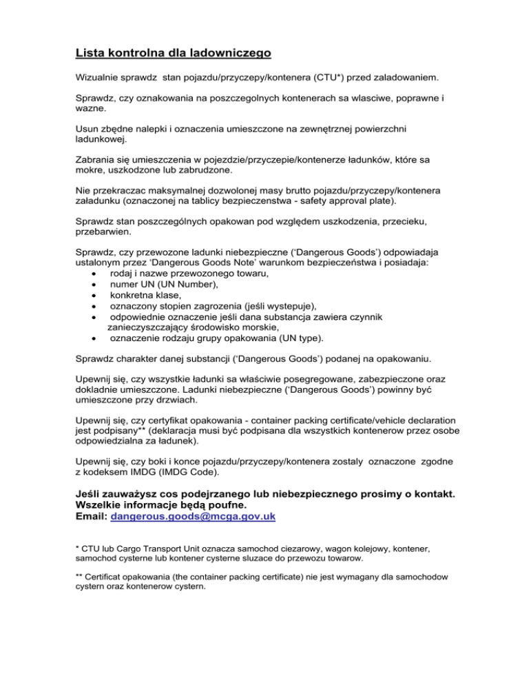 Lista kontrolna dla ladowniczego Wizualnie sprawdz stan pojazdu/przyczepy/kontenera (CTU*) przed zaladowaniem. Sprawdz, czy oznakowania na poszczegolnych kontenerach sa wlasciwe, poprawne i wazne. Usun zbędne nalepki i oznaczenia umieszczone na zewnętrznej powierzchni ladunkowej. Zabrania się umieszczenia w pojezdzie/przyczepie/kontenerze ładunków, które sa mokre, uszkodzone lub zabrudzone. Nie przekraczac maksymalnej dozwolonej masy brutto pojazdu/przyczepy/kontenera załadunku (oznaczonej na tablicy bezpieczenstwa - safety approval plate). Sprawdz stan poszczególnych opakowan pod względem uszkodzenia, przecieku, przebarwien. Sprawdz, czy przewozone ladunki niebezpieczne (‘Dangerous Goods’) odpowiadaja ustalonym przez ‘Dangerous Goods Note’ warunkom bezpieczeństwa i posiadaja: • rodaj i nazwe przewozonego towaru, • numer UN (UN Number), • konkretna klase, • oznaczony stopien zagrozenia (jeśli wystepuje), • odpowiednie oznaczenie jeśli dana substancja zawiera czynnik zanieczyszczający środowisko morskie, • oznaczenie rodzaju grupy opakowania (UN type). Sprawdz charakter danej substancji (‘Dangerous Goods’) podanej na opakowaniu. Upewnij się, czy wszystkie ładunki sa właściwie posegregowane, zabezpieczone oraz dokladnie umieszczone. Ladunki niebezpieczne (‘Dangerous Goods’) powinny być umieszczone przy drzwiach. Upewnij się, czy certyfikat opakowania - container packing certificate/vehicle declaration jest podpisany** (deklaracja musi być podpisana dla wszystkich kontenerow przez osobe odpowiedzialna za ładunek). Upewnij się, czy boki i konce pojazdu/przyczepy/kontenera zostaly oznaczone zgodne z kodeksem IMDG (IMDG Code). Jeśli zauważysz cos podejrzanego lub niebezpiecznego prosimy o kontakt. Wszelkie informacje będą poufne. Email: [email protected] * CTU lub Cargo Transport Unit oznacza samochod ciezarowy, wagon kolejowy, kontener, samochod cysterne lub kontener cysterne sluzace do przewozu towarow. ** Certificat opakowania (the container packing certificate) nie jest wymagany dla samochodow cystern oraz kontenerow cystern. Lista kontrolna dla kierowcy Pamietaj, ze wszystkie ladunki niebezpieczne (‘Dangerous Goods’) przewozone droga morska (bez wzgledu na ich ilosc) musza zostac zadeklarowane. Jako kierowca masz obowiązek upewnienia się, ze posiadasz odpowiednia dokumentacje dotyczaca załadunku, która nastepnie należy oddac do kontroli. Dokument musi być zgodny z kodeksem dotyczącym przewozenia niebezpiecznych ładunków droga morska (Dagerous Goods Note). Masz obowiazek upewnienia się, ze ładunek zostal właściwie zabezpieczony w pojezdzie oraz posiadasz podpisany certyfikat opakowania. Dany certyfikat stanowi czesc dokumentacji dotyczącej ladunkow niebezpiecznych przewozonych droga morska (‘Dangerous Goods Note’). Upewnij się, czy każdy kontener ma aktualna tablice bezpieczeństwa (safety approval plate). Wizualnie sprawdz, czy na zewnętrznej powierzchni pojazdu/przyczepy/kontenera (CTU*) nie pojawily się znaki uszkodzen lub przecieku. Upewnij się, czy drzwi pojazdu/przyczepy/kontenera sa właściwie zabezpieczone. Sprawdz, czy boki i konce pojazdu/przyczepy/kontenera (CTU) sa odpowiednio oznaczone. Zbyteczne oznaczenia (znaki, nalepki) powinny zostac usunięte. Oznaczenia powinny być zabezpieczone, trwale i przejrzyste. Zabrania się palenia papierosow bądź wprowadzania jakiegokolwiek źródła zaplonu, np. sprzet do gotowania, gdy przewozone sa srodki łatwopalne bądź wybuchowe. Propan i butan, przewozone dla potrzeb prywatnych, nie mogą przekraczac 47kg ( cylindry musza być dokladnie zakręcone). Ponadto wszystkie cylindry powinny być odpowiednio zabezpieczone przed ruchami statku oraz z dala od jakiegokolwiek źródła zaplonu lub ciepla. Jeśli zauważysz cos podejrzanego lub niebezpiecznego prosimy o kontakt. Wszelkie informacje będą poufne. Email: [email protected] * CTU lub Cargo Transport Unit oznacza samochod ciezarowy, wagon kolejowy, kontener, samochod cysterne lub kontener cysterne sluzace do przewozu towarow.