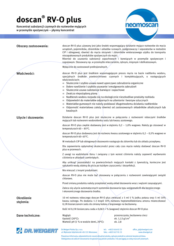 ® doscan RV-O plus Koncentrat substancji czynnych do roztworów myjących w przemyśle spożywczym – płynny koncentrat Obszary zastosowania: doscan RV-O plus używany jest jako środek wspomagający działanie myjące roztworów do mycia urządzeń, pojemników, zbiorników i układów rurowych, podgrzewaczy i separatorów w metodzie CIP i obiegowej; również do mycia skrzynek i zbiorników wielorazowego użytku do transportu niezapakowanych produktów spożywczych do myjni. Również do usuwania substancji zapachowych i barwiących w przemyśle spożywczym i napojowym. Stosowany np. w przemyśle mleczarskim, rybnym, mięsnym i delikatesowym. Wyłącznie do zastosowań profesjonalnych. Właściwości: doscan RV-O plus jest środkiem wspomagającym proces mycia na bazie nadtlenku wodoru, specjalnych środków powierzchniowo czynnych i kompleksujących, o następujących właściwościach: • • • • • • • • Użycie i dozowanie: Skutecznie i szybko usuwa nawet uporczywe zabrudzenia organiczne Dobre nawilżenie i szybkie usuwanie i emulgowanie zabrudzeń Skutecznie usuwa substancje barwiące i zapachowe Zwalcza niepożądaną pianę Nadtlenek wodoru rozpada się na ekologicznie nieszkodliwe produkty rozkładu Odpowiedni do materiałów odpornych na utlenianie i tworzyw sztucznych Materiałów gumowych nie należy poddawać długotrwałemu działaniu nadtlenków Odporność materiałowa zależy również od zastosowanych składników alkalicznych lub kwaśnych Działanie doscan RV-O plus jest skuteczne w połączeniu z roztworami roboczymi środków myjących lub roztworem wodorotlenku sodu lub kwasu azotowego. doscan RV-O plus zwykle dodawany jest w stężeniu 0,2 – 1,0% wagowo. Należy go stosować w temperaturach 60 – 85°C. doscan RV-O plus dodawany jest do roztworu kwasu azotowego w stężeniu 0,2 – 0,5% wagowo w temperaturach 60- 65°C. W metodach CIP lub obiegowych dozowanie następuje do zbiornika lub do układu przepływu. Dla zapewnienia optymalnej skuteczności przez cały czas mycia należy dodawać doscan RV-O plus w przerwach. Z uwagi na wydzielanie tlenu i związany z tym wzrost ciśnienia należy zapewnić wyrównanie ciśnienia w układach zamkniętych. Aby uniknąć pozostałości na powierzchniach mających kontakt z żywnością, konieczne jest spłukanie wodą zdatną do picia po każdym czyszczeniu i dezynfekcji. Nie mieszać z innymi produktami. doscan RV-O plus nie może być stosowany w połączeniu z roztworami zawierającymi związki chlorowe. Przed zmianą produktu należy przepłukać wodą układ dozowania wraz z wężami zasysającymi. Zaleca się użycie automatycznych systemów dozowania typu weigomatic® dla bezpiecznego i ekonomicznego dozowania środka. Określenie stężenia: 10 ml roztworu roboczego doscan RV-O plus zmieszać z 5 ml 5 % jodku potasu oraz 5 ml 10% kwasu solnego. Po dodaniu 1-2 kropli 10% roztworu heptamolibdenianu amonu miareczkować 0,1N tiosiarczanem sodu do zmiany koloru z brązowego na bezbarwny. Ilość ml 0,1N tiosiarczanu sodu x 0,063 = % (wagowe) stężenie doscan RV-O plus Dane techniczne: Wygląd: Gęstość (20°C): Wartość pH (1 % w wodzie demi, 20°C): Dr.Weigert Polska Sp. z o.o. ul. Wybrzeże Gdyńskie 6A •01-531 Warszawa przezroczysta, bezbarwna ciecz ok. 1,12 g/cm3 ok. 2,8 tel.: +4822 616 02 23 faks: +4822 617 81 21 [email protected] www.drweigert.pl Powyższa informacja, odpowiednia do naszej aktualnej wiedzy, opisuje produkt w zakresie bezpieczeństwa. Odstępstwa od zaleceń stosowania nie gwarantują jakości produktu i nie pociągają za sobą roszczeń prawnych. ® doscan RV-O plus Koncentrat substancji czynnych do roztworów myjących w przemyśle spożywczym – płynny koncentrat Skład: Zawartość składników według Rozporządzenia WE 648/2004 w sprawie detergentów: <5% niejonowe środki powierzchniowo czynne, fosfoniany, 15-30% związki wybielające na bazie tlenu. Magazynowanie: Przechowywać w temperaturach od 0 do 25°C. Przy prawidłowym magazynowaniu okres trwałości wynosi 1 rok od daty produkcji. Data ważności produktu podana jest na etykiecie za symbolem . Rodzaje zagrożeń i środki ostrożności: Informacje dotyczące bezpieczeństwa i ochrony środowiska znajdują się w karcie charakterystyki dostępnej na stronie www.drweigert.pl Uwaga: Nie stosować środka w postaci nierozcieńczonej na substancje organiczne i w połączeniu z innymi skoncentrowanymi środkami myjącymi i dezynfekcyjnymi. Jeżeli produkt używany jest zgodnie z zaleceniami, nie stanowi zagrożenia w rozumieniu dyrektywy dot. przetwórstwa spożywczego. Zamknięte opakowania należy usuwać jako odpady tylko po całkowitym opróżnieniu. Usuwanie resztek produktu według zaleceń zamieszczonych w karcie charakterystyki. PL 4.0 / 04.2016 MB 1151/2-4/09.2015 Dr.Weigert Polska Sp. z o.o. ul. Wybrzeże Gdyńskie 6A •01-531 Warszawa tel.: +4822 616 02 23 faks: +4822 617 81 21 [email protected] www.drweigert.pl Powyższa informacja, odpowiednia do naszej aktualnej wiedzy, opisuje produkt w zakresie bezpieczeństwa. Odstępstwa od zaleceń stosowania nie gwarantują jakości produktu i nie pociągają za sobą roszczeń prawnych.