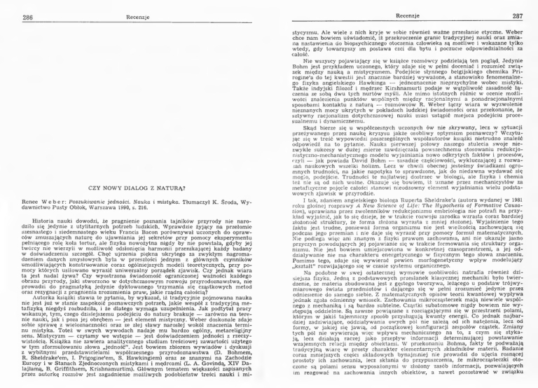 286 Recenzje CZY NOWY DIALOG Z NATURĄ? Renee W e b e r : P oszukiwanie jedności. Nauka i m isty ka. T łum aczył K. Środa, W y daw nictw o P u sty Obłok, W arszaw a 1990, s. 216. H istoria n a u k i dowodzi, że p ragnienie poznania tajn ik ó w przy ro d y nie n a ro dziło się jedynie z u ty lita rn y c h potrzeb ludzkich. W praw dzie żyjący n a przełom ie szesnastego i siedem nastego w ieku F rancis Bacon po ró w n y w ał uczonych do o p raw ców zm uszających n a tu rę do u ja w n ian ia jej sekretó w p rzy pom ocy ek sp ery m en tu pełniącego rolę koła to rtu r, ale fizyka now ożytna nigdy by nie pow stała, gdyby jej tw ó rcy nie w ierzyli w możliwość odsłonięcia harm on ii p rzen ik ającej każdy b adany w dośw iadczeniu szczegół. Chęć u jrze n ia piękna uk ry teg o za zw ykłym n ag ro m a dzeniem danych zm ysłow ych b yła w przeszłości jed n y m z głów nych czynników um ożliw iających kon stru o w an ie coraz ogólniejszych m odeli teoretycznych, przy po mocy k tó ry ch usiłow ano w yrazić u n iw ersa ln y porząd ek zjaw isk. Czy je d n a k w iara ta je st n ad a l żyw a? Czy w yostrzona św iadom ość ograniczonej w ażności każdego obrazu przyrody, ja k i stw orzono w dotychczasow ym rozw oju p rzyrodoznaw stw a, nie prow adzi do p rag m aty k ą jedynie dyktow anego 'trzym ania się cząstkow ych m etod oraz rezygnacji z p ragnienia zrozum ienia praw , ja k ie rządzą całością? A u to rk a książki staw ia te py tan ia, by w ykazać, iż trad y c y jn ie p o jm ow ana n a u k a nie je st już w stan ie zaspokoić poznaw czych potrzeb, ja k ie w espół z tra d y c y jn ą m e tafizy k ą niegdyś rozbudziła, i że dlatego w ym aga uzupełnienia. J a k p o d ty tu ł p racy w skazuje, tym , czego dzisiejszem u podejściu do n a tu ry b ra k u je — zarów no n a te r e nie nauki, ja k i poza jej obrębem — je st elem ent m istyczny. W eber doskonale zdaje sobie sp raw ę z w ieloznaczności oraz ze złej sław y n aro słe j w okół znaczenia te rm i nu m istyka. Toteż w sw ych w yw odach n ad a je m u bardzo ogólny, m e tarelig ijn y sens. M istycyzm — czytam y w e w stępie — jest dośw iadczeniem jedności z rzeczy w istością. K siążka nie zaw iera analitycznego stu d iu m treściow ej zaw artości użytego w ty m sform ułow aniu słow a „jedność” . Je st bow iem zbiorem w yw iadów i dyskusji z w y b itnym i przedstaw icielam i w spółczesnego p rzy ro d o zn aw stw a (D. Bohm em , R. S h eld rak e’em, I. P rigogine’em, S. H aw kingiem ) oraz ze znanym i n a Zachodzie E uropy i w S tan a ch Z jednoczonych m istykam i i m ęd rcam i (L. A. G ovindą, X IV D a lajlam ą, B. G riffithsem , K rish n am u rtim ). G łów nym te m atem w iększości zapisanych przez au to rk ę rozm ów je st zagadnienie m ożliw ych podobieństw treśc i n au k i i m i R ecenzje 287 stycyzm u. Ale w iele z nich k ry je w sobie rów nież w ażne p rzesłan ie etyczne. W eber chce n am bow iem uśw iadom ić, iż przekroczenie granic trad y c y jn ej n au k i oraz zm ia n a n astaw ie n ia do biopsychicznego otoczenia człow ieka są m ożliw e i w skazane tylko w tedy, gdy tow arzyszy im p ostaw a czci d la b y tu i poczucie odpow iedzialności za całość. Nie w szyscy p o jaw iający się w książce rozm ów cy podzielają te n pogląd. Jed y n ie Bohm je st przy k ład em uczonego, k tó ry zdaje się w pełni doceniać i rozum ieć zw ią zek m iędzy n au k ą a m istycyzm em . P odejście słynnego belgijskiego chem ika P rirogine’a do tej kw estii je st znacznie bardziej w yw ażone, a stanow isko fen o m en aln e go fizyka angielskiego H aw kinga — jednoznacznie niep rzy ch y ln e wobec m istyki. T akże in d y jsk i filozof i m ędrzec K irsh n a m u rti podaje w w ątpliw ość zasadność łą czenia ze sobą dw u tych n u rtó w m yśli. Ale m im o isto tn y ch różnic w ocenie m ożli w ości znalezienia p u n k tó w w spólnych m iędzy racjo n aln y m i a p o n ad racjo n aln y m i sposobam i k o n ta k tu z n a tu rą — rozm ów ców R. W eber łączy w ia ra w w yzw olenie n ieznanych mocy u k ry ty ch w pokładach ludzkiej św iadom ości oraz przekonanie, że sztyw ny racjo n alizm dotychczasow ej nau k i m usi u stąp ić m iejsca podejściu procesu aln em u i dynam icznem u. Skąd bierze się u w spółczesnych uczonych ów nie sk ry w an y , lecz w sy tu acji przeżyw anego przez n a u k ę kry zy su jakże osobliw y optym izm poznaw czy? W czytu jąc się w treść w ypow iedzi poszczególnych w spółautorów książki n ie tru d n o znaleźć odpow iedź na to p ytanie. N auka pierw szej połow y naszego stu lecia sw oje n ie zw ykłe sukcesy w dużej m ierze zaw dzięczała pow szechnem u stosow aniu red u k cjo nistyczno-m echanistycznego m odelu w y jaśn ian ia nowo o d krytych faktów i procesów, rzy li — ja k pow iada D avid Bohm — zasadzie częściowości, w y k luczającej z ro zw a żań n aukow ych w szelki holizm . Lecz w chw ili obecnej jesteśm y św iadkam i ogro m nych trudności, na ja k ie n ap o ty k a to spraw dzone, ja k do n ied aw n a w ydaw ać się mogło, podejście. T rudności te n ajłatw iej dostrzec w biologii, ale fizyka i chem ia też nie są od nich w olne. O kazuje się bow iem , iż uznane przez m echanicystów za m etafizyczne pojęcie całości stanow i nieodzow ny elem ent w y jaśn ian ia w ielu p o d sta w ow ych zjaw isk w przyrodzie. I tak, zdaniem angielskiego biologa R u p e rta S h eld rak e’a (au to ra w ydanej w 1981 roku głośnej ro zp raw y A N ew Science oj Life: T h e Hypothesis of Form ative Causation), u p raw ia n a przez zw olenników red u k cjo n izm u em briologia nie p o trafi na p rzy kład w yjaśnić, ja k to się dzieje, że w trak c ie rozw oju zarodka w zrasta coraz b ardziej złożoność stru k tu ry , że form a złożona w y ra sta z m niej złożonej. W yjaśnienie tego fa k tu je st tru d n e, poniew a
