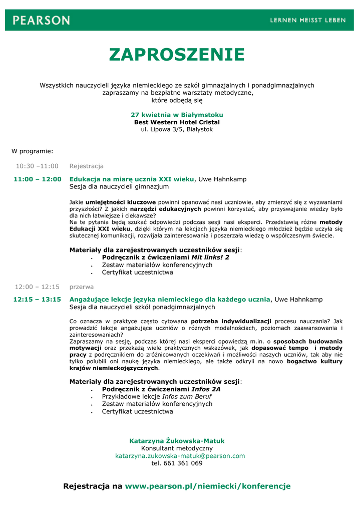 ZAPROSZENIE Wszystkich nauczycieli języka niemieckiego ze szkół gimnazjalnych i ponadgimnazjalnych zapraszamy na bezpłatne warsztaty metodyczne, które odbędą się 27 kwietnia w Białymstoku Best Western Hotel Cristal ul. Lipowa 3/5, Białystok W programie: 10:30 –11:00 11:00 – 12:00 Rejestracja Edukacja na miarę ucznia XXI wieku, Uwe Hahnkamp Sesja dla nauczycieli gimnazjum Jakie umiejętności kluczowe powinni opanować nasi uczniowie, aby zmierzyć się z wyzwaniami przyszłości? Z jakich narzędzi edukacyjnych powinni korzystać, aby przyswajanie wiedzy było dla nich łatwiejsze i ciekawsze? Na te pytania będą szukać odpowiedzi podczas sesji nasi eksperci. Przedstawią różne metody Edukacji XXI wieku, dzięki którym na lekcjach języka niemieckiego młodzież będzie uczyła się skutecznej komunikacji, rozwijała zainteresowania i poszerzała wiedzę o współczesnym świecie. Materiały dla zarejestrowanych uczestników sesji: Podręcznik z ćwiczeniami Mit links! 2 Zestaw materiałów konferencyjnych Certyfikat uczestnictwa 12:00 – 12:15 przerwa 12:15 – 13:15 Angażujące lekcje języka niemieckiego dla każdego ucznia, Uwe Hahnkamp Sesja dla nauczycieli szkół ponadgimnazjalnych Co oznacza w praktyce często cytowana potrzeba indywidualizacji procesu nauczania? Jak prowadzić lekcje angażujące uczniów o różnych modalnościach, poziomach zaawansowania i zainteresowaniach? Zapraszamy na sesję, podczas której nasi eksperci opowiedzą m.in. o sposobach budowania motywacji oraz przekażą wiele praktycznych wskazówek, jak dopasować tempo i metody pracy z podręcznikiem do zróżnicowanych oczekiwań i możliwości naszych uczniów, tak aby nie tylko polubili oni naukę języka niemieckiego, ale także odkryli na nowo bogactwo kultury krajów niemieckojęzycznych. Materiały dla zarejestrowanych uczestników sesji: Podręcznik z ćwiczeniami Infos 2A Przykładowe lekcje Infos zum Beruf Zestaw materiałów konferencyjnych Certyfikat uczestnictwa Katarzyna Żukowska-Matuk Konsultant metodyczny [email protected] tel. 661 361 069 Rejestracja na www.pearson.pl/niemiecki/konferencje