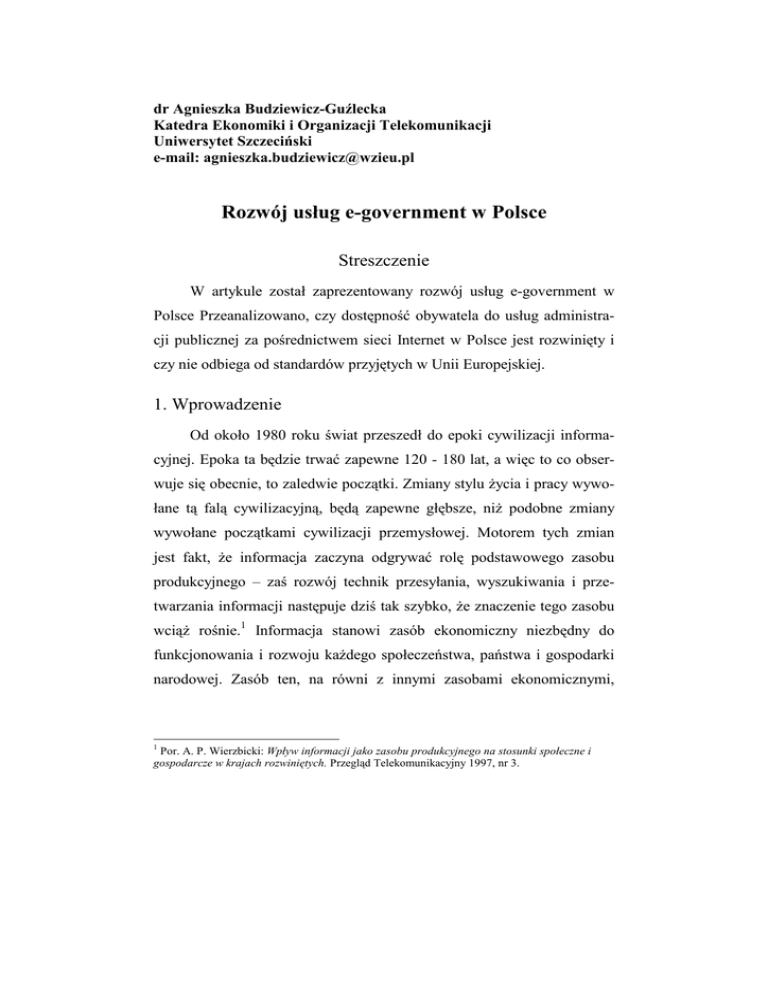 dr Agnieszka Budziewicz-Guźlecka Katedra Ekonomiki i Organizacji Telekomunikacji Uniwersytet Szczeciński e-mail: [email protected] Rozwój usług e-government w Polsce Streszczenie W artykule został zaprezentowany rozwój usług e-government w Polsce Przeanalizowano, czy dostępność obywatela do usług administracji publicznej za pośrednictwem sieci Internet w Polsce jest rozwinięty i czy nie odbiega od standardów przyjętych w Unii Europejskiej. 1. Wprowadzenie Od około 1980 roku świat przeszedł do epoki cywilizacji informacyjnej. Epoka ta będzie trwać zapewne 120 - 180 lat, a więc to co obserwuje się obecnie, to zaledwie początki. Zmiany stylu Ŝycia i pracy wywołane tą falą cywilizacyjną, będą zapewne głębsze, niŜ podobne zmiany wywołane początkami cywilizacji przemysłowej. Motorem tych zmian jest fakt, Ŝe informacja zaczyna odgrywać rolę podstawowego zasobu produkcyjnego – zaś rozwój technik przesyłania, wyszukiwania i przetwarzania informacji następuje dziś tak szybko, Ŝe znaczenie tego zasobu wciąŜ rośnie.1 Informacja stanowi zasób ekonomiczny niezbędny do funkcjonowania i rozwoju kaŜdego społeczeństwa, państwa i gospodarki narodowej. Zasób ten, na równi z innymi zasobami ekonomicznymi, 1 Por. A. P. Wierzbicki: Wpływ informacji jako zasobu produkcyjnego na stosunki społeczne i gospodarcze w krajach rozwiniętych. Przegląd Telekomunikacyjny 1997, nr 3. współdecyduje o rozwoju społeczeństwa i gospodarki.2 Zastosowanie i rozwój infrastruktury informacyjnej ma przede wszystkim – oprócz wielkiego znaczenia dla ekonomii – daleko idące konsekwencje społeczne.3 DuŜy zestaw nowych rozwiązań wkracza niemal we wszystkie dziedziny Ŝycia: prowadzenie działalności gospodarczej, handel, nauczanie, administrację, rozrywkę oraz wiele innych. Coraz częściej mówi się, Ŝe ludzkość wkracza w nowy etap rozwoju cywilizacji. Po okresie industrialnym rozpoczyna się era społeczeństwa informacyjnego. WyróŜnia się trzy historyczne4, podstawowe fazy rozwoju ekonomicznego społeczeństwa, dzieląc je według technik, które w tych fazach dominowały:5 • społeczeństwo przedindustrialne, opierające się na podstawowych zawodach związanych z przyrodą, • społeczeństwo industrialne, zorganizowane przede wszystkim wokół procesu wykorzystywania energii do produkcji towarów, • społeczeństwo postindustrialne, bazujące na informacji, jako podstawie wiedzy i działania. Społeczeństwo postindustrialne cechuje przede wszystkim: • dominacja sektora usług w gospodarce, • dominacja specjalistów i naukowców w strukturze zawodowej, • orientacja na kontrolę społeczną rozwoju techniki, 2 Por. J. Oleński: Ekonomika informacji. PWE, Warszawa 2001, s. 243. Por. R. W. Kluszczyński: Społeczeństwo informacyjne. Cyberkultura. Sztuka multimediów. Wyd. Rabid, Kraków 2002, s. 11. 4 RóŜnie autorzy przedstawiają tę typologię społeczeństw. L. Groff przedstawia ją następująco: społeczeństwo ery agrarnej, społeczeństwo ery industrialnej oraz społeczeństwo ery informacyjnej. Por. L. Groff: Rewolucja informacyjna, globalne trendy restrukturyzacyjne, wizje i decyzje. Transformacje 1993-1994, nr 3-4, s. 82. 5 Por. J. Olędzki: Komunikowanie w świecie. Wyd. ASPRA-JR, Warszawa 2000, s. 15. 3 • tworzenie „technologii intelektualnych” jako podstawy podejmowania decyzji politycznych i społecznych. Ostatnie dekady XX wieku to oŜywiona dyskusja nad tym, jak dalece następujące po sobie generacje technologii teleinformatycznych wpływają na społeczeństwa najbardziej zaawansowanych gospodarczo i technologicznie rejonów świata. Stawiano pytania o istotę informacji w procesie rozwoju społecznego, starając się stworzyć teorię społeczeństwa informacyjnego.6 Nowe społeczeństwo korzysta i będzie korzystać z wolnego rynku jako sprawdzonego mechanizmu ekonomicznej integracji.7 Następują przemiany w sposobie funkcjonowania gospodarki globalnej. Często wynika to z daleko posuniętego postępu technicznego i technologicznego w telekomunikacji oraz teleinformatyce. Postęp ten objawił się w ostatnich latach wdroŜeniem, juŜ powszechnie przyjętego, pojęcia „społeczeństwo informacyjne”, które funkcjonuje juŜ jako kategoria ekonomiczna i społeczna, rozwojem tanich technologii szybkiego dostępu do uŜytkownika końcowego oraz demonopolizacją usług telekomunikacyjnych. 6 7 Por. F. Webster: Theories of the Information Society. Routledge, London 1995. Por. P. F. Drucker: Społeczeństwo prokapitalistyczne. PWN, Warszawa 1999, s. 14. 2. e-usługi administracji publicznej Rewolucja cyfrowa, która ma obecnie miejsce, rosnąca europejska i światowa konkurencja powoduje, Ŝe usługi administracji elektronicznej zaczynają odgrywać coraz istotniejszą rolę, zarówno dla państwa, jak i społeczeństwa. Informatyzacja administracji publicznej jest konieczna chociaŜby ze względu na członkostwo w Unii Europejskiej i nałoŜonych na poszczególnych członków zobowiązań. Jednym z celów informatyzacji administracji jest włączenie się w budowę społeczeństwa informacyjnego. Wynika to równieŜ ze zmian zachodzących w społeczeństwie. Wraz z upowszechnieniem edukacji społeczeństwo staje się coraz bardziej wykształcone oraz świadome swoich racji i widząc nieporadność państwa, domaga się poprawy jakości świadczonych usług publicznych oraz zmiany tradycyjnych biurokratycznych struktur. Ze względu na stały wzrost wydatków publicznych, nierozerwalnie związanych z daninami publicznymi płaconymi przez obywateli, wzrasta zainteresowanie ich efektywniejszym wykorzystywaniem. Funkcjonujące organizacje międzynarodowe, takie jak Unia Europejska, Bank Światowy równieŜ wywołują oraz wzmacniają tendencje do przemian w administracji.8 Program udostępniania części usług i informacji administracji publicznej w Internecie,9 UE oficjalnie sprecyzowała w 2000 roku w programie eE