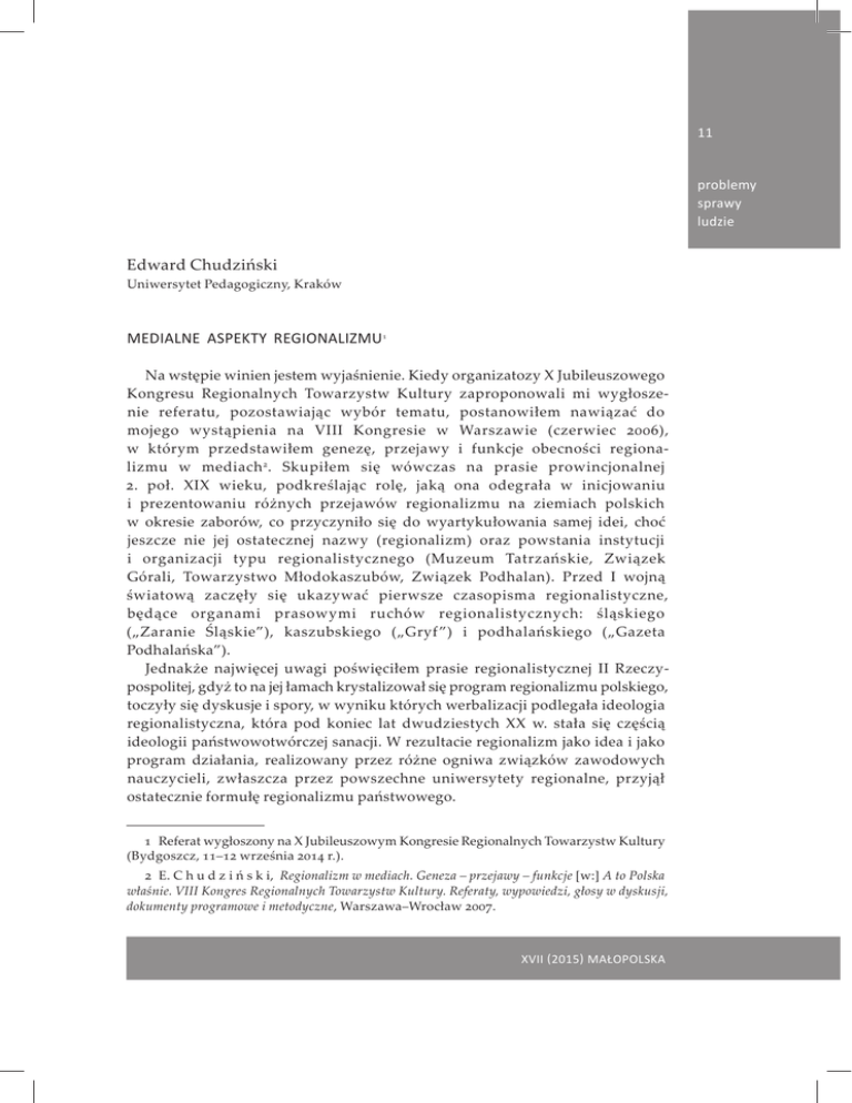 11 problemy sprawy ludzie Edward Chudziński Uniwersytet Pedagogiczny, Kraków MEDIALNE ASPEKTY REGIONALIZMU1 Na wstępie winien jestem wyjaśnienie. Kiedy organizatozy X Jubileuszowego Kongresu Regionalnych Towarzystw Kultury zaproponowali mi wygłoszenie referatu, pozostawiając wybór tematu, postanowiłem nawiązać do mojego wystąpienia na VIII Kongresie w Warszawie (czerwiec 2006), w którym przedstawiłem genezę, przejawy i funkcje obecności regionalizmu w mediach 2 . Skupiłem się wówczas na prasie prowincjonalnej 2. poł. XIX wieku, podkreślając rolę, jaką ona odegrała w inicjowaniu i prezentowaniu różnych przejawów regionalizmu na ziemiach polskich w okresie zaborów, co przyczyniło się do wyartykułowania samej idei, choć jeszcze nie jej ostatecznej nazwy (regionalizm) oraz powstania instytucji i organizacji typu regionalistycznego (Muzeum Tatrzańskie, Związek Górali, Towarzystwo Młodokaszubów, Związek Podhalan). Przed I wojną światową zaczęły się ukazywać pierwsze czasopisma regionalistyczne, będące organami prasowymi ruchów regionalistycznych: śląskiego („Zaranie Śląskie”), kaszubskiego („Gryf ”) i podhalańskiego („Gazeta Podhalańska”). Jednakże najwięcej uwagi poświęciłem prasie regionalistycznej II Rzeczypospolitej, gdyż to na jej łamach krystalizował się program regionalizmu polskiego, toczyły się dyskusje i spory, w wyniku których werbalizacji podlegała ideologia regionalistyczna, która pod koniec lat dwudziestych XX w. stała się częścią ideologii państwowotwórczej sanacji. W rezultacie regionalizm jako idea i jako program działania, realizowany przez różne ogniwa związków zawodowych nauczycieli, zwłaszcza przez powszechne uniwersytety regionalne, przyjął ostatecznie formułę regionalizmu państwowego. 1 Referat wygłoszony na X Jubileuszowym Kongresie Regionalnych Towarzystw Kultury (Bydgoszcz, 11–12 września 2014 r.). 2 E. C h u d z i ń s k i, Regionalizm w mediach. Geneza – przejawy – funkcje [w:] A to Polska właśnie. VIII Kongres Regionalnych Towarzystw Kultury. Referaty, wypowiedzi, głosy w dyskusji, dokumenty programowe i metodyczne, Warszawa–Wrocław 2007. XVII (2015) maŁopolska 12 Edward Chudziński W odrodzonej Polsce ujawniły się także inne opcje ideowe i formy organizacyjne regionalizmu, niektóre jeszcze przed odzyskaniem niepodległości, jak ruch krajowy na ziemiach byłego Wielkiego Księstwa Litewskiego, czy terytorializm na kresach południowo-wschodnich, sama zaś idea była adaptowana przez różne siły polityczne, między innymi przez obóz narodowy oraz ruch ludowy. Nie zmienia to jednak faktu, że główny nurt regionalizmu po 1926 roku miał charakter państwowy i był akceptowany oraz wspierany przez obóz rządowy. Upolitycznienie regionalizmu w II Rzeczypospolitej znajdowało odzwierciedlenie nie tyle w programach politycznych partii i stronnictw, co w prasie różnych odcieni ideowych. Dzienniki koncentrowały się na rejestrowaniu ważniejszych przejawów regionalizmu, ograniczając się do funkcji informacyjnej („Kurier Poznański”, „Epoka”, „Mestwin”). Prasa periodyczna, zwłaszcza reprezentująca związki nauczycielskie: Związek Polskiego Nauczycielstwa Szkół Powszechnych, po zjednoczeniu Związek Nauczycielstwa Polskiego („Głos Nauczycielski”, „Polska Oświata Pozaszkolna”) i ruch krajoznawczy („Ziemia”), podejmowała kwestie programowe, dużo miejsca poświęcała kulturze, historii, literaturze oraz nauczaniu i wychowaniu. Regionaliści w dwudziestoleciu międzywojennym mieli świadomość – podobnie jak ich poprzednicy w okresie zaborów – roli prasy w realizacji swoich celów programowych oraz popularyzacji idei regionalizmu w społeczeństwie. Tym się kierując powołali do życia kilkadziesiąt tytułów prasowych, na łamach których podejmowali wiele zagadnień dotąd w prasie nieobecnych bądź przedstawianych w innym oświetleniu. Dotyczy to zwłaszcza takich kwestii, jak świadomość i więź regionalna, tożsamość kulturowoetniczna, odrębności terytorialne i wynikające z nich konflikty, antagonizmy, separatyzmy, partykularyzmy itp. Cała ta problematyka weszła do obiegu myśli w dwudziestoleciu międzywojennym za sprawą regionalizmu i dzięki prasie regionalistycznej. W latach trzydziestych XX w. na znaczeniu zyskuje nowe medium – radio. Jest ono obecne w różnych regionach Polski, mając swoje siedziby m.in. w Poznaniu, Katowicach, Krakowie, Lwowie, Wilnie i Toruniu. Właśnie rozgłośnie regionalne, usytuowane na obrzeżach Rzeczypospolitej, zarówno w polityce informacyjnej, jak i w prezentacji regionów pozostających w zasięgu ich oddziaływania, realizowały wybrane cele i założenia regionalizmu państwowego. Za przykład może tu posłużyć rozgłośnia w Wilnie, która – podobnie jak miejscowy kwartalnik „Źródła Mocy” – miała za zadanie prezentować „nasz kraj”, czyli ziemie byłego Wielkiego Księstwa Litewskiego jako harmonijny stop narodów, kultur i religii. Z interesującego nas punktu widzenia w II Rzeczypospolitej regionalizm wszedł w nowy rodzaj związków i relacji z mediami, dla których stał XVII (2015) maŁopolska Medialne aspekty regionalizmu się nie tylko ważnym i stale obecnym tematem, ale także nową nazwą słownikową używaną na określenie regionalnie zorientowanych inicjatyw społecznych, kulturalnych i naukowych, różnego rodzaju instytucji z uniwersytetami regionalnymi na czele oraz nowego typu prasy. Jej cele i zadania zostały sformułowane w Programie regionalizmu polskiego (1926). Prasa regionalistyczna, choć tego określenia w nim nie użyto, miała odzwierciedlać wszechstronnie życie własnego środowiska, budzić przywiązanie i zainteresowanie do wszystkiego, co się w najbliższym otoczeniu dzieje, niecić energię i inicjatywę, stać na straży umiejętności wypełniania swoich zadań oraz każdego obywatela3. Aleks