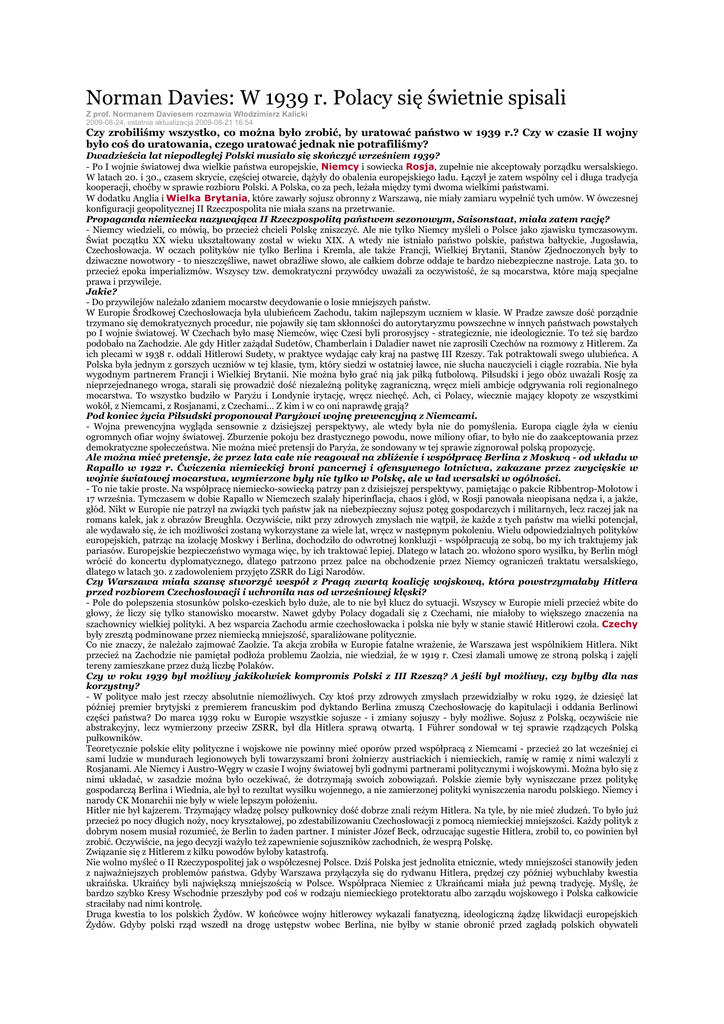 Norman Davies: W 1939 r. Polacy się świetnie spisali Z prof. Normanem Daviesem rozmawia Włodzimierz Kalicki 2009-08-24, ostatnia aktualizacja 2009-08-21 16:54 Czy zrobiliśmy wszystko, co można było zrobić, by uratować państwo w 1939 r.? Czy w czasie II wojny było coś do uratowania, czego uratować jednak nie potrafiliśmy? Dwadzieścia lat niepodległej Polski musiało się skończyć wrześniem 1939? - Po I wojnie światowej dwa wielkie państwa europejskie, Niemcy i sowiecka Rosja, zupełnie nie akceptowały porządku wersalskiego. W latach 20. i 30., czasem skrycie, częściej otwarcie, dążyły do obalenia europejskiego ładu. Łączył je zatem wspólny cel i długa tradycja kooperacji, choćby w sprawie rozbioru Polski. A Polska, co za pech, leżała między tymi dwoma wielkimi państwami. W dodatku Anglia i Wielka Brytania, które zawarły sojusz obronny z Warszawą, nie miały zamiaru wypełnić tych umów. W ówczesnej konfiguracji geopolitycznej II Rzeczpospolita nie miała szans na przetrwanie. Propaganda niemiecka nazywająca II Rzeczpospolitą państwem sezonowym, Saisonstaat, miała zatem rację? - Niemcy wiedzieli, co mówią, bo przecież chcieli Polskę zniszczyć. Ale nie tylko Niemcy myśleli o Polsce jako zjawisku tymczasowym. Świat początku XX wieku ukształtowany został w wieku XIX. A wtedy nie istniało państwo polskie, państwa bałtyckie, Jugosławia, Czechosłowacja. W oczach polityków nie tylko Berlina i Kremla, ale także Francji, Wielkiej Brytanii, Stanów Zjednoczonych były to dziwaczne nowotwory - to nieszczęśliwe, nawet obraźliwe słowo, ale całkiem dobrze oddaje te bardzo niebezpieczne nastroje. Lata 30. to przecież epoka imperializmów. Wszyscy tzw. demokratyczni przywódcy uważali za oczywistość, że są mocarstwa, które mają specjalne prawa i przywileje. Jakie? - Do przywilejów należało zdaniem mocarstw decydowanie o losie mniejszych państw. W Europie Środkowej Czechosłowacja była ulubieńcem Zachodu, takim najlepszym uczniem w klasie. W Pradze zawsze dość porządnie trzymano się demokratycznych procedur, nie pojawiły się tam skłonności do autorytaryzmu powszechne w innych państwach powstałych po I wojnie światowej. W Czechach było masę Niemców, więc Czesi byli prorosyjscy - strategicznie, nie ideologicznie. To też się bardzo podobało na Zachodzie. Ale gdy Hitler zażądał Sudetów, Chamberlain i Daladier nawet nie zaprosili Czechów na rozmowy z Hitlerem. Za ich plecami w 1938 r. oddali Hitlerowi Sudety, w praktyce wydając cały kraj na pastwę III Rzeszy. Tak potraktowali swego ulubieńca. A Polska była jednym z gorszych uczniów w tej klasie, tym, który siedzi w ostatniej ławce, nie słucha nauczycieli i ciągle rozrabia. Nie była wygodnym partnerem Francji i Wielkiej Brytanii. Nie można było grać nią jak piłką futbolową. Piłsudski i jego obóz uważali Rosję za nieprzejednanego wroga, starali się prowadzić dość niezależną politykę zagraniczną, wręcz mieli ambicje odgrywania roli regionalnego mocarstwa. To wszystko budziło w Paryżu i Londynie irytację, wręcz niechęć. Ach, ci Polacy, wiecznie mający kłopoty ze wszystkimi wokół, z Niemcami, z Rosjanami, z Czechami... Z kim i w co oni naprawdę grają? Pod koniec życia Piłsudski proponował Paryżowi wojnę prewencyjną z Niemcami. - Wojna prewencyjna wygląda sensownie z dzisiejszej perspektywy, ale wtedy była nie do pomyślenia. Europa ciągle żyła w cieniu ogromnych ofiar wojny światowej. Zburzenie pokoju bez drastycznego powodu, nowe miliony ofiar, to było nie do zaakceptowania przez demokratyczne społeczeństwa. Nie można mieć pretensji do Paryża, że sondowany w tej sprawie zignorował polską propozycję. Ale można mieć pretensje, że przez lata całe nie reagował na zbliżenie i współpracę Berlina z Moskwą - od układu w Rapallo w 1922 r. Ćwiczenia niemieckiej broni pancernej i ofensywnego lotnictwa, zakazane przez zwycięskie w wojnie światowej mocarstwa, wymierzone były nie tylko w Polskę, ale w ład wersalski w ogólności. - To nie takie proste. Na współpracę niemiecko-sowiecką patrzy pan z dzisiejszej perspektywy, pamiętając o pakcie Ribbentrop-Mołotow i 17 września. Tymczasem w dobie Rapallo w Niemczech szalały hiperinflacja, chaos i głód, w Rosji panowała nieopisana nędza i, a jakże, głód. Nikt w Europie nie patrzył na związki tych państw jak na niebezpieczny sojusz potęg gospodarczych i militarnych, lecz raczej jak na romans kalek, jak z obrazów Breughla. Oczywiście, nikt przy zdrowych zmysłach nie wątpił, że każde z tych państw ma wielki potencjał, ale wydawało się, że ich możliwości zostaną wykorzystane za wiele lat, wręcz w następnym pokoleniu. Wielu odpowiedzialnych polityków europejskich, patrząc na izolację Moskwy i Berlina, dochodziło do odwrotnej konkluzji - współpracują ze sobą, bo my ich traktujemy jak pariasów. Europejskie bezpieczeństwo wymaga więc, by ich traktować lepiej. Dlatego w latach 20. włożono sporo wysiłku, by Berlin mógł wrócić do koncertu dyplomatycznego, dlatego patrzono przez palce na obchodzenie przez Niemcy ograniczeń traktatu wersalskiego, dlatego w latach 30. z zadowoleniem przyjęto ZSRR do Ligi Narodów. Czy Warszawa miała szansę stworzyć wespół z Pragą zwartą koalicję wojskową, która powstrzymałaby Hitlera przed rozbiorem Czechosłowacji i uchroniła nas od wrześniowej klęski? - Pole do polepszenia stosunków polsko-czeskich było duże, ale to nie był klucz do sytuacji. Wszyscy w Europie mieli przecież wbite do głowy, że liczy się tylko stanowisko mocarstw. Nawet gdyby Polacy dogadali się z Czechami, nie miałoby to większego znaczenia na szachownicy wielkiej polityki. A bez wsparcia Zachodu armie czechosłowacka i polska nie były w stanie stawić Hitlerowi czoła. Czechy były zresztą podminowane przez niemiecką mniejszość, sparaliżowane politycznie. Co nie znaczy,