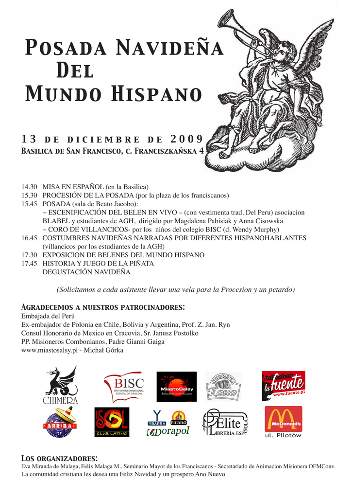 Posada Navideña Del Mundo Hispano 13 de diciembre de 2009 Basilica de San Francisco, c. Franciszkańska 4 14.30 15.30 15.45 16.45 17.30 17.45 MISA EN ESPAÑOL (en la Basilica) PROCESIÓN DE LA POSADA (por la plaza de los franciscanos) POSADA (sala de Beato Jacobo): − ESCENIFICACIÓN DEL BELEN EN VIVO – (con vestimenta trad. Del Peru) asociacion BLABEL y estudiantes de AGH, dirigido por Magdalena Pabisiak y Anna Cisowska − CORO DE VILLANCICOS- por los nińos del colegio BISC (d. Wendy Murphy) COSTUMBRES NAVIDEÑAS NARRADAS POR DIFERENTES HISPANOHABLANTES (villancicos por los estudiantes de la AGH) EXPOSICION DE BELENES DEL MUNDO HISPANO HISTORIA Y JUEGO DE LA PIÑATA DEGUSTACIÓN NAVIDEÑA (Solicitamos a cada asistente llevar una vela para la Procesion y un petardo) Agradecemos a nuestros patrocinadores: Embajada del Perú Ex-embajador de Polonia en Chile, Bolivia y Argentina, Prof. Z. Jan. Ryn Consul Honorario de Mexico en Cracovia, Sr. Janusz Postolko PP. Misioneros Combonianos, Padre Gianni Gaiga www.miastosalsy.pl - Michał Górka ul. Pilotów Los organizadores: Eva Miranda de Malaga, Felix Malaga M., Seminario Mayor de los Franciscanos - Secretariado de Animacion Misionera OFMConv. La comunidad cristiana les desea una Feliz Navidad y un prospero Ano Nuevo