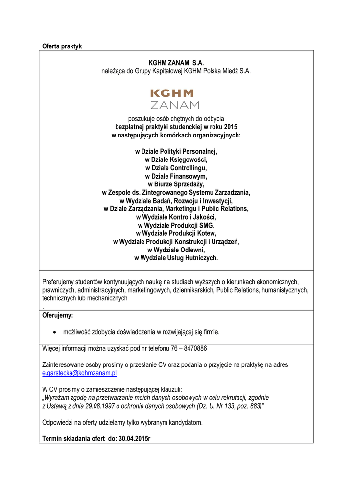 Oferta praktyk KGHM ZANAM S.A. należąca do Grupy Kapitałowej KGHM Polska Miedź S.A. poszukuje osób chętnych do odbycia bezpłatnej praktyki studenckiej w roku 2015 w następujących komórkach organizacyjnych: w Dziale Polityki Personalnej, w Dziale Księgowości, w Dziale Controllingu, w Dziale Finansowym, w Biurze Sprzedaży, w Zespole ds. Zintegrowanego Systemu Zarzadzania, w Wydziale Badań, Rozwoju i Inwestycji, w Dziale Zarządzania, Marketingu i Public Relations, w Wydziale Kontroli Jakości, w Wydziale Produkcji SMG, w Wydziale Produkcji Kotew, w Wydziale Produkcji Konstrukcji i Urządzeń, w Wydziale Odlewni, w Wydziale Usług Hutniczych. Preferujemy studentów kontynuujących naukę na studiach wyższych o kierunkach ekonomicznych, prawniczych, administracyjnych, marketingowych, dziennikarskich, Public Relations, humanistycznych, technicznych lub mechanicznych . Oferujemy: możliwość zdobycia doświadczenia w rozwijającej się firmie. Więcej informacji można uzyskać pod nr telefonu 76 – 8470886 Zainteresowane osoby prosimy o przesłanie CV oraz podania o przyjęcie na praktykę na adres [email protected] W CV prosimy o zamieszczenie następującej klauzuli: „Wyrażam zgodę na przetwarzanie moich danych osobowych w celu rekrutacji, zgodnie z Ustawą z dnia 29.08.1997 o ochronie danych osobowych (Dz. U. Nr 133, poz. 883)” Odpowiedzi na oferty udzielamy tylko wybranym kandydatom. Termin składania ofert do: 30.04.2015r