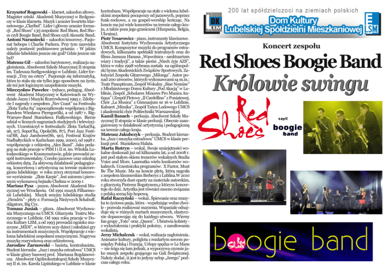 Krzysztof Rogowski – klarnet, saksofon altowy. Magister sztuki Akademii Muzycznej w Bydgosz czy w klasie klarnetu. Muzyk i aranżer kwartetu klar netowego „Claribel”. Lider i główny aranżer forma cji „Red Shoes” z jej zespołami: Red Shoes, Red Sho es czyli Boogie Band, Red Shoes czyli Akoustic Band. Antoni Naraniecki – saksofon tenorowy. Pasjo nat bebopu i Charlie Parkera. Przy tym nazwisku należy postawić podstawowe pytania: W jakim składzie lubelskim jeszcze nie grał? Gdzie jeszcze nie był? Mateusz Gil – saksofon barytonowy, realizacja na głośnienia. Absolwent Szkoły Muzycznej II stopnia im. Tadeusza Szeligowskiego w Lublinie. Lider for macji „Trzy na cztery”. Pasjonuje się informatyką, która to stała się nie tylko jego sposobem na życie, ale też jest logicznym uzupełnienie muzyki. Mieczysław Pawelec trębacz, pedagog. Absol went Akademi Muzycznej w Katowicach na Wy dziale Jazzu i Muzyki Rozrywkowej 1995 r. Zdoby cie I nagrody z zespołem „Nev Coast” na Festiwalu „Złota Tarka 84” zapoczątkowało współpracę z Big Bandem Wiesława Pieregorólki, a od 1987 r. Big WarsawBand Stanisława Fiałkowskiego. Bierze udział w licznych nagraniach studyjnych i telewizyj nych. Uczestniczył w festiwalach: Złota Tarka(84, 96, 97), Sopot’84, Opole(86, 87), Pori Jazz Festi val’88, Jazz Jamboree(86, 90), Festiwal Krajów Nadbałtyckich w Karlscham 1999, 2000), od 1998 r. współpracuje z orkiestrą „Alex Band”. Jako peda gog na stałe pracuje w PSM I i II st. im. Witolda Lu tosławskiego w Krasnymstawie, gdzie prowadzi ze spół instrumentalny, Combo jazzowe oraz szkolną orkiestrę dętą. Za aktywną działalność pedagogicz ną, koncertową i artystyczną na terenie makrore gionu lubelskiego w roku 2003 otrzymał honoro we wyróżnienie „Złote Karpie”. Jest autorem i pierw szym wykonawcą hejnału Chełma w 2009 r. Mariusz Pysz puzon. Absolwent Akademii Mu zycznej we Wrocłąwiu. Od 1991 muzyk Filharmo nii Lubelskiej. Muzyk sesyjny lubelskiego studia „Hendrix” płyty z: Formacją Nieżywych Schabuff, Aligators, Big Cyc. Tomasz Jusiak – gitara. Absolwent Wychowa nia Muzycznego na UMCS. Gitarzysta Teatru Mu zycznego w Lublinie. Od 1991 roku pracuje w Do mu Kultury LSM, a od 1993 prowadzi ognisko mu zyczne „MIDI", w którym uczy dzieci i młodzież gry na instrumentach muzycznych. Współpracuje z wie loma lubelskimi zespołami muzycznymi. Nagrywa muzykę rozrywkową oraz orkiestrową. Jarosław Żarnowski – basista, kontrabasista. Student kierunku „Jazz i muzyka estradowa” UMCS w klasie gitary basowej prof. Mariusza Bogdanowi cza. Absolwent Ogólnokształcącej Szkoły Muzycz nej II st. im. Karola Lipińskiego w Lublinie w klasie kontrabasu. Współpracuje na stałe z wieloma lubel skimi zespołami począwszy od jazzowych, poprzez funkrockowe, a na gospelworship kończąc. Na koncie ma już wiele koncertów na terenie całego kra ju, a także poza jego granicami (Hiszpania, Belgia, Ukraina). Piotr Tesarowicz piano, instrumenty klawiszowe. Absolwent Instytutu Wychowania Artystycznego UMCS. Kompozytor muzyki do programów estra dowych, kilkunastu spektakli teatralnych oraz do filmu Janusza Hanasa „Wąwolnica sanktuarium wiary i tradycji”, a także pieśni „Niech żyje AZS”, która w roku 1998 wybrana została na ogólnopol ski hymn Akademickich Związków Sportowych. Za łożyciel Zespołu Gitarowego „Milonga”. Autor po nad 200 utworów, których wykonawcami są m.in.: Teatr Panopticum, Zespół Wokalny „Sine Nomine” z Młodzieżowego Domu Kultury „Pod Akacją” w Lu blinie, Zespół „Scholares Minores Pro Musica An tiqua” i Zespół Fletowy „Il Cardellino” z Poniatowej, Chór „La Musica” z Gimnazjum nr 16 w Lublinie, Kabaret „Mimika”, Zespół Tańca Ludowego UMCS i akademicki chór Politechniki Warszawskiej. Kamil Banach – perkusja. Absolwent Szkoły Mu zycznej II stopnia w klasie perkusji. Obecnie zaan gażowany w działalność artystyczną i pedagogiczną na terenie całego kraju. Mateusz Jakubczyk – perkusja. Student kierun ku „Jazz i muzyka estradowa” UMCS w klasie per kusji prof. Stanisława Halata. Marta Butryn – wokal. Swoje umiejętności wo kalne doskonali już od kilkunastu lat, a od 2008 r. jest pod stałym okiem trenerów wokalnych Studia Voice and More. Laureatka wielu konkursów wo kalnych. Uczestniczka programów: X Factor, Must Be The Music. Ma na koncie płytę, którą nagrała z zespołem klezmerskim Berberys z Lublina.W 2010 roku stworzyla duet oparty na materiale autorskim, z gitarzystą Piotrem Bogutynem,z którym koncer tuje do dziś. Artystka jest również mocno związana z polską sceną hip hopową. Rafał Raczyński – wokal. Śpiewanie oraz muzy ka to życiowa pasja, która wypełniając wolne chwi le pozwala realizować marzenia. Wspaniale odnaj duje się w różnych nurtach muzycznych, elastycz nie dopasowując się do każdego utworu. Wierny fan grupy „Toto” oraz „Queen”. Ubóstwia kobiety z wykształcenia i praktyki położny, z zamiłowania wokalista. Jerzy Michalczuk – wokal, realizacja nagłośnienia. Animator kultury, poliglota z rozdartym sercem po między Polską i Francją. Urlopy spędza w Le Mans – nie ściga się tam jednak, a wypoczywa czynnie ja ko muzyk zespołu grającego na Gali Świątecznej. Należy dodać, iż jest to jedyny urlop „Jerego” pod czas całego roku. Koncert zespołu Red Shoes Boogie Band Królowie swingu Red Shoes czyli Boogie Band to powstały z inicjatywy Krzysztofa Rogowskiego kilkunastoosobowy skład koncertowy. W skład brass bandu wchodzą trzy podstawowe grupy muzyków: • instrumenty dęte saksofon altowy, saksofon tenorowy, saksofon barytonowy, trąbka i puzon • sekcja rytmiczna – piano, gitara elektryczna, gitara basowa, perkusja • wokaliści RSBB jest kontynuacją i spadkobiercą wcześniej działających zespołów: 1 Szeligowski Brass Band – założony w 1996 roku z inicjatywy