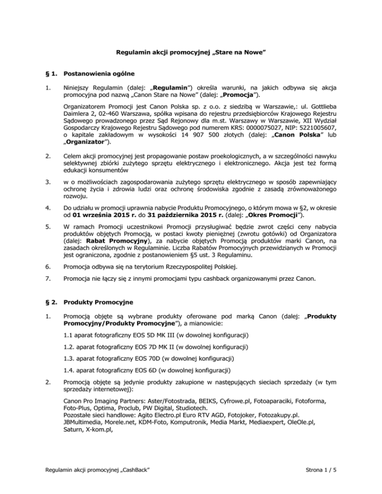 Regulamin akcji promocyjnej „Stare na Nowe” § 1. Postanowienia ogólne 1. Niniejszy Regulamin (dalej: „Regulamin”) określa warunki, na jakich odbywa się akcja promocyjna pod nazwą „Canon Stare na Nowe” (dalej: „Promocja”). Organizatorem Promocji jest Canon Polska sp. z o.o. z siedzibą w Warszawie,: ul. Gottlieba Daimlera 2, 02-460 Warszawa, spółka wpisana do rejestru przedsiębiorców Krajowego Rejestru Sądowego prowadzonego przez Sąd Rejonowy dla m.st. Warszawy w Warszawie, XII Wydział Gospodarczy Krajowego Rejestru Sądowego pod numerem KRS: 0000075027, NIP: 5221005607, o kapitale zakładowym w wysokości 14 907 500 złotych (dalej: „Canon Polska” lub „Organizator”). 2. Celem akcji promocyjnej jest propagowanie postaw proekologicznych, a w szczególności nawyku selektywnej zbiórki zużytego sprzętu elektrycznego i elektronicznego. Akcja jest też formą edukacji konsumentów 3. w o możliwościach zagospodarowania zużytego sprzętu elektrycznego w sposób zapewniający ochronę życia i zdrowia ludzi oraz ochronę środowiska zgodnie z zasadą zrównoważonego rozwoju. 4. Do udziału w promocji uprawnia nabycie Produktu Promocyjnego, o którym mowa w §2, w okresie od 01 września 2015 r. do 31 października 2015 r. (dalej: „Okres Promocji”). 5. W ramach Promocji uczestnikowi Promocji przysługiwać będzie zwrot części ceny nabycia produktów objętych Promocją, w postaci kwoty pieniężnej (zwrotu gotówki) od Organizatora (dalej: Rabat Promocyjny), za nabycie objętych Promocją produktów marki Canon, na zasadach określonych w Regulaminie. Liczba Rabatów Promocyjnych przewidzianych w Promocji jest ograniczona, zgodnie z postanowieniem §5 ust. 3 Regulaminu. 6. Promocja odbywa się na terytorium Rzeczypospolitej Polskiej. 7. Promocja nie łączy się z innymi promocjami typu cashback organizowanymi przez Canon. § 2. Produkty Promocyjne 1. Promocją objęte są wybrane produkty oferowane pod marką Canon (dalej: „Produkty Promocyjny/Produkty Promocyjne”), a mianowicie: 1.1 aparat fotograficzny EOS 5D MK III (w dowolnej konfiguracji) 1.2. aparat fotograficzny EOS 7D MK II (w dowolnej konfiguracji) 1.3. aparat fotograficzny EOS 70D (w dowolnej konfiguracji) 1.4. aparat fotograficzny EOS 6D (w dowolnej konfiguracji) 2. Promocją objęte są jedynie produkty zakupione w następujących sieciach sprzedaży (w tym sprzedaży internetowej): Canon Pro Imaging Partners: Aster/Fotostrada, BEIKS, Cyfrowe.pl, Fotoaparaciki, Fotoforma, Foto-Plus, Optima, Proclub, PW Digital, Studiotech. Pozostałe sieci handlowe: Agito Electro.pl Euro RTV AGD, Fotojoker, Fotozakupy.pl. JBMultimedia, Morele.net, KDM-Foto, Komputronik, Media Markt, Mediaexpert, OleOle.pl, Saturn, X-kom.pl, Regulamin akcji promocyjnej „CashBack” Strona 1 / 5 3. Promocją objęte są wyłącznie Produkty Promocyjne fabrycznie nowe, nabyte w punktach sprzedaży detalicznej na terenie Rzeczypospolitej Polskiej, w tym nabyte w ramach sprzedaży na odległość prowadzonej przez przedsiębiorców posiadających miejsce zamieszkania albo siedzibę w Rzeczypospolitej Polskiej (np. w sklepach internetowych). Do udziału w Promocji nie uprawnia nabycie Produktu Premiowanego poza granicami Rzeczypospolitej Polskiej lub od osoby fizycznej, która nie prowadzi działalności gospodarczej. Promocją nie są objęte Produkty Promocyjne pochodzące ze sprzedaży wtórnej (komisowej lub podobnej). 4. Organizator informuje, że Promocja obejmuje produkty marki Canon, które zostały wprowadzone do obrotu w Rzeczypospolitej Polskiej przez Canon Polska lub autoryzowanych dystrybutorów Canon Polska na terenie Rzeczypospolitej Polskiej w tym zgodnie z postanowieniami § 2 pkt 2 i 3 Regulaminu. 5. Promocją objęte są produkty zakupione w oryginalnych opakowaniach, na których znajduje się numer EAN i numer seryjny produktu. Nie są objęte promocją produkty pochodzące z rozpakowania oryginalnych zestawów (białe pudełka) oraz przepakowane przez sprzedawców do własnych opakowań. 6. Uczestnik promocji może zgłosić nabycie i uzyskać w całym Okresie Promocji Rabat Promocyjny za maksymalnie 1 sztukę każdego Produktu Promocyjnego. Zgłoszenie więcej niż 1 sztuki każdego Produktu Promocyjnego nie uprawnia do otrzymania więcej niż jednego Rabatu Promocyjnego za dany produkt. 7. W przypadku zakupu fabrycznie zapakowanego zestawu produktów (body + obiektyw/-y), Rabat Promocyjny można otrzymać wyłącznie za produkt główny (body), nawet jeśli obiektyw będący składnikiem zestawu jest na liście produktów objętych promocją. § 3. Uczestnictwo w Promocji 1. Uczestnikiem Promocji (dalej: „Uczestnik/Uczestnicy”) może być: 1.1. 1.2. 2. każda osoba fizyczna, posiadająca pełną zdolność do czynności prawnych, która w Okresie Promocji nabyła Produkt Promocyjny, jako konsument w rozumieniu art. 221 Kodeksu cywilnego; albo przedsiębiorca, bez względu na formę organizacyjno-prawną (w tym osoba fizyczna prowadząca działalność gospodarczą, osoba prawna albo jednostka organizacyjna nieposiadająca osobowości prawnej, której ustawa przyznaje zdolność prawną), posiadający miejsce zamieszkania albo siedzibę w Rzeczypospolitej Polskiej, który w Okresie Promocji nabył Produkt Promocyjny. Warunkiem udziału w Promocji jest spełnienie przez Uczestnika łącznie następujących warunków: 2.1. 2.2. 2.3. 2.4. zachowanie oryginalnego dowodu zakupu Produktu Promocyjnego (Produktów Promocyjnych), nabytego (nabytych) w Okresie Promocji, w postaci otrzymanego od sprzedawcy paragonu fiskalnego lub wystawionej przez sprzedawcę faktury VAT (dalej: „Dowód Zakupu”), wycięcie oryginalnego kodu kreskowego oraz numeru seryjnego Produktu Promocyjnego (Produktów Promocyjnych), pochodzącego (pochodzących) z opakowania zakupionego Produktu Promocyjnego (Produktów Promocyjnych) i przesłanie skanu lub zdjęcia (w kolorze) wyciętego kodu/kodów poprzez formularz zgłoszeni
