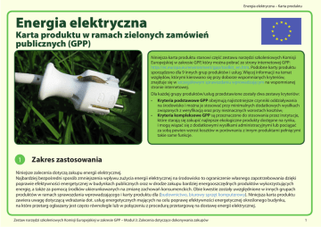 Energia elektryczna – Karta produktu Energia elektryczna Karta produktu w ramach zielonych zamówień publicznych (GPP) Niniejsza karta produktu stanowi część zestawu narzędzi szkoleniowych Komisji Europejskiej w zakresie GPP, który można pobrać ze strony internetowej GPP: http://ec.europa.eu/environment/gpp/toolkit_en.htm. Podobne karty produktu sporządzono dla 9 innych grup produktów i usług. Więcej informacji na temat względów, którymi kierowano się przy doborze wspomnianych kryteriów, znajduje się w szczegółowym sprawozdaniu wprowadzającym na wspomnianej stronie internetowej. Dla każdej grupy produktów/usług przedstawione zostały dwa zestawy kryteriów: • Kryteria podstawowe GPP obejmują najistotniejsze czynniki oddziaływania na środowisko i można je stosować przy minimalnych dodatkowych wysiłkach związanych z weryfikacją oraz przy nieznacznych wzrostach kosztów; • Kryteria kompleksowe GPP są przeznaczone do stosowania przez instytucje, które starają się zakupić najlepsze ekologiczne produkty dostępne na rynku, i mogą wiązać się z dodatkowymi wysiłkami administracyjnymi lub pociągać za sobą pewien wzrost kosztów w porównaniu z innym produktami pełniącymi takie same funkcje. 1 Zakres zastosowania Niniejsze zalecenia dotyczą zakupu energii elektrycznej. Najbardziej bezpośredni sposób zmniejszenia wpływu zużycia energii elektrycznej na środowisko to ograniczenie własnego zapotrzebowania dzięki poprawie efektywności energetycznej w budynkach publicznych oraz w drodze zakupu bardziej energooszczędnych produktów wykorzystujących energię, a także za pomocą środków ukierunkowanych na zmianę zachowań konsumenckich. Obie kwestie zostały uwzględnione w innych grupach produktów w ramach sprawozdania wprowadzającego i karty produktu dla (budownictwo, biurowy sprzęt komputerowy). Niniejsza karta produktu zawiera uwagę dotyczącą wdrażania dot. usług energetycznych mających na celu poprawę efektywności energetycznej określonego budynku, na które przetarg ogłaszany jest często równolegle lub w połączeniu z procedurą przetargową na dostawę energii elektrycznej. Zestaw narzędzi szkoleniowych Komisji Europejskiej w zakresie GPP – Moduł 3: Zalecenia dotyczące dokonywania zakupów 1 3 Energia elektryczna – Karta produktu W przypadku kryteriów podstawowych specyfikacje uwzględniają zwłaszcza udział procentowy dostarczanej energii elektrycznej wytwarzanej z odnawialnych źródeł energii (OZE) (zalecane 50 %). Kryteria udzielenia zamówienia mają na celu promowanie nawet większego udziału procentowego OZE, wykraczającego poza minimalny wymóg ujęty w specyfikacjach. W przypadku kryteriów kompleksowych specyfikacje zalecają 100 % udział OZE. 2 Kluczowe czynniki oddziaływania na środowisko Podejście zgodne z zasadami GPP Oddziaływanie Emisje CO2 i innych gazów w następstwie wytwarzania energii elektrycznej z paliw kopalnych • Zwiększenie udziału procentowego energii elektrycznej wytwarzanej z odnawialnych źródeł energii (OZE)1 Oddziaływanie na zdrowie ludzkie, różnorodność biologiczną i zasoby wodne w następstwie wydobycia materiałów, tj. górnictwa (węgiel) i wierceń (ropa naftowa), a także utylizacji odpadów • Zwiększenie udziału procentowego energii elektrycznej wytwarzanej w procesie wysokosprawnej kogeneracji Eksploatacja ograniczonych zasobów paliw kopalnych 1 2 „Odnawialne źródła energii” oznaczają odnawialne, niekopalne źródła energii (energia wiatru, słoneczna, geotermiczna, falowa, pływów, wodna, biomasy, gazu z odpadów, gazu z zakładów oczyszczania ścieków i biogazów) Zestaw narzędzi szkoleniowych Komisji Europejskiej w zakresie GPP – Moduł 3: Zalecenia dotyczące dokonywania zakupów 3 3.1 Energia elektryczna – Karta produktu Energia elektryczna – kryteria GPP Energia elektryczna – kryteria podstawowe GPP Przedmiot zamówienia Zakup 50 % energii elektrycznej wytwarzanej z odnawialnych źródeł energii (OZE) lub w procesie wysokosprawnej kogeneracji. Specyfikacje 1. 50 % dostarczonej energii elektrycznej musi pochodzić z odnawialnych źródeł energii (OZE) lub z wysokosprawnej kogeneracji, zgodnie z definicjami zawartymi, odpowiednio, w dyrektywie 2001/77/WE2 i w dyrektywie 2004/8/WE. Weryfikacja: Systemy gwarancji pochodzenia lub równoważny dowód – wszystkie kraje UE są prawnie zobowiązane, na mocy dyrektyw 2001/77/WE i 2004/8/WE, do ustanowienia systemów gwarancji pochodzenia w odniesieniu do energii elektrycznej wytwarzanej z odnawialnych źródeł energii oraz w odniesieniu do zastosowania wysokosprawnej kogeneracji do wytwarzania energii. Systemy te stanowią dobrą podstawę prawną dla weryfikacji. Opcja alternatywna przewiduje przedłożenie przez dostawcę niezależnego dowodu na poparcie faktu, że odpowiednia ilość energii elektrycznej została wytworzona z tak zwanych źródeł odnawialnych lub wyprodukowana w procesie wysokosprawnej kogeneracji (np. zbywalny certyfikat wydany przez niezależny organ wydający, taki jak RECS ), który został zatwierdzony przez rząd. Kryteria udzielenia zamówienia Dodatkowe punkty zostaną przyznane za: Dodatkowe OZE i/ lub wysokosprawna kogeneracja 1. Oferent powinien określić udział procentowy wytworzonej ze źródeł odnawialnych energii elektrycznej, jaka zostanie dostarczona. Dodatkowe punkty zostaną przyznane w liczbie proporcjonalnej do udziału procentowego wytworzonej ze źródeł odnawialnych energii elektrycznej, jaka zostanie dostarczona, wykraczającego poza minimalny wymóg określony w specyfikacji. Weryfikacja: Jak wyżej. 2. Dodatkowa energia elektryczna wytworzona w procesie wysokosprawnej kogeneracji: Oferent powinien określić udział procentowy wytworzonej w procesie wysokosprawnej kogeneracji energii elektrycznej, jaka zostanie dostarczona. Dodatkowe punkty zostaną przyznane w liczbie proporcjonalnej do udziału procentowego wytworzon