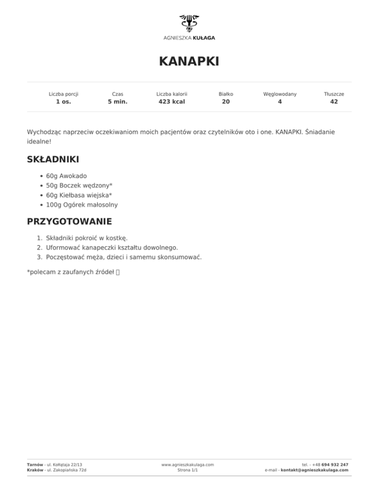 KANAPKI Liczba porcji Czas Liczba kalorii Białko Węglowodany Tłuszcze 1 os. 5 min. 423 kcal 20 4 42 Wychodząc naprzeciw oczekiwaniom moich pacjentów oraz czytelników oto i one. KANAPKI. Śniadanie idealne! SKŁADNIKI 60g Awokado 50g Boczek wędzony* 60g Kiełbasa wiejska* 100g Ogórek małosolny PRZYGOTOWANIE 1. Składniki pokroić w kostkę. 2. Uformować kanapeczki kształtu dowolnego. 3. Poczęstować męża, dzieci i samemu skonsumować. *polecam z zaufanych źródeł Tarnów - ul. Kołłątaja 22/13 Kraków - ul. Zakopiańska 72d www.agnieszkakulaga.com Strona 1/1 tel. - +48 694 932 247 e-mail - [email protected]