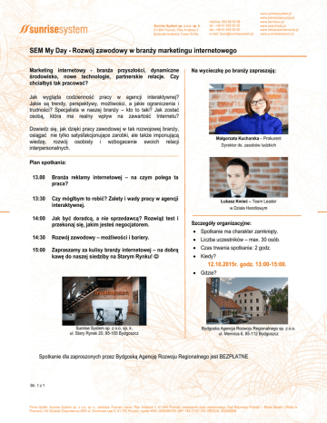 Sunrise System sp. z o.o. sp. k. 61-894 Poznań, Plac Andersa 3 Budynek Andersia Tower XVIIIp. infolinia: 800 88 80 88 tel.: +48 61 655 95 55 fax: +48 61 655 95 00 e-mail: [email protected] www.sunrisesystem.pl www.pierwszapozycja.pl www.sem4you.pl www.searchads.pl www.reklamawinternecie.pl www.sunrisedzieciom.pl SEM My Day - Rozwój zawodowy w branży marketingu internetowego Marketing internetowy - branża przyszłości, dynamiczne środowisko, nowe technologie, partnerskie relacje. Czy chciałbyś tak pracować? Na wycieczkę po branży zapraszają: Jak wygląda codzienność pracy w agencji interaktywnej? Jakie są trendy, perspektywy, możliwości, a jakie ograniczenia i trudności? Specjalista w naszej branży – kto to taki? Jak zostać osobą, która ma realny wpływ na zawartość Internetu? Dowiedz się, jak dzięki pracy zawodowej w tak rozwojowej branży, osiągać nie tylko satysfakcjonujące zarobki, ale także imponującą wiedzę, rozwój osobisty i wzbogacenie swoich relacji interpersonalnych. Małgorzata Kucharska – Prokurent Dyrektor ds. zasobów ludzkich Plan spotkania: 13.00 Branża reklamy internetowej – na czym polega ta praca? 13:30 Czy mógłbym to robić? Zalety i wady pracy w agencji interaktywnej. 14:00 Jak być doradcą, a nie sprzedawcą? Rozwiąż test i przekonaj się, jakim jesteś negocjatorem. 14:30 Rozwój zawodowy – możliwości i bariery. 15:00 Zapraszamy za kulisy branży internetowej – na dobrą kawę do naszej siedziby na Starym Rynku! Łukasz Kmieć – Team Leader w Dziale Handlowym Szczegóły organizacyjne: Spotkanie ma charakter zamknięty. Liczba uczestników – max. 30 osób. Czas trwania spotkania: 2 godz. Kiedy? 12.10.2015r. godz. 13:00-15:00. Gdzie? Sunrise System sp. z o.o. sp. k. ul. Stary Rynek 20, 85-105 Bydgoszcz Bydgoska Agencja Rozwoju Regionalnego sp. z o.o. ul. Mennica 6, 85-112 Bydgoszcz Spotkanie dla zaproszonych przez Bydgoską Agencję Rozwoju Regionalnego jest BEZPŁATNE Str. 1 z 1 Firma Spółki: Sunrise System sp. z o.o. sp. k.; siedziba: Poznań; adres: Plac Andersa 3, 61-894 Poznań; oznaczenie sądu rejestrowego: Sąd Rejonowy Poznań – Nowe Miasto i Wilda w Poznaniu VIII Wydział Gospodarczy KRS ul. Grochowe Łąki 6, 61-752 Poznań; numer KRS: 0000489705; NIP: 783-17-07-183, REGON: 302598908