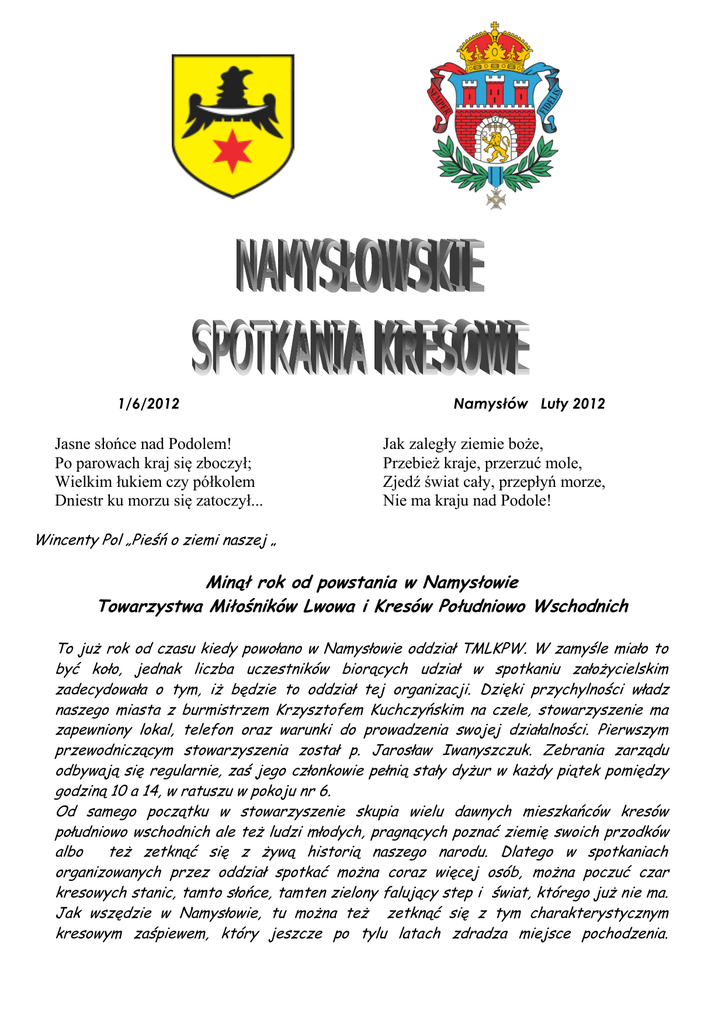 1/6/2012 Jasne słońce nad Podolem! Po parowach kraj się zboczył; Wielkim łukiem czy półkolem Dniestr ku morzu się zatoczył... Namysłów Luty 2012 Jak zaległy ziemie boże, Przebież kraje, przerzuć mole, Zjedź świat cały, przepłyń morze, Nie ma kraju nad Podole! Wincenty Pol „Pieśń o ziemi naszej „ Minął rok od powstania w Namysłowie Towarzystwa Miłośników Lwowa i Kresów Południowo Wschodnich To już rok od czasu kiedy powołano w Namysłowie oddział TMLKPW. W zamyśle miało to być koło, jednak liczba uczestników biorących udział w spotkaniu założycielskim zadecydowała o tym, iż będzie to oddział tej organizacji. Dzięki przychylności władz naszego miasta z burmistrzem Krzysztofem Kuchczyńskim na czele, stowarzyszenie ma zapewniony lokal, telefon oraz warunki do prowadzenia swojej działalności. Pierwszym przewodniczącym stowarzyszenia został p. Jarosław Iwanyszczuk. Zebrania zarządu odbywają się regularnie, zaś jego członkowie pełnią stały dyżur w każdy piątek pomiędzy godziną 10 a 14, w ratuszu w pokoju nr 6. Od samego początku w stowarzyszenie skupia wielu dawnych mieszkańców kresów południowo wschodnich ale też ludzi młodych, pragnących poznać ziemię swoich przodków albo też zetknąć się z żywą historią naszego narodu. Dlatego w spotkaniach organizowanych przez oddział spotkać można coraz więcej osób, można poczuć czar kresowych stanic, tamto słońce, tamten zielony falujący step i świat, którego już nie ma. Jak wszędzie w Namysłowie, tu można też zetknąć się z tym charakterystycznym kresowym zaśpiewem, który jeszcze po tylu latach zdradza miejsce pochodzenia. Ale tutaj w zadumie towarzyszącej naszym spotkaniom, przywołującej lata beztroskiego dzieciństwa spędzonego tam „za Bugiem’ brzmi jakoś inaczej, tak ciepło i swojsko. Były więc spotkania z autorami poruszającymi w swojej twórczości motywy kresowe, gościem stowarzyszenia był niekwestionowany autorytet tematyki kresowej prof. Stanisław Nicieja, odbyło się też spotkanie świąteczno-noworoczne. Zarząd stowarzyszenia podjął decyzję o wsparciu finansowym komitet starający się o zwrot Kościoła pw. św. Marii Magdaleny we Lwowie. Natomiast parafie w Równem, w Zbarażu i Kamieńcu Podolskim otrzymały paczki z najpotrzebniejszymi rzeczami. Rozpoczynając nowy 2012 rok zarząd pełen pomysłów do dalszej pracy ma nadzieję na dalszy rozwój stowarzyszenia i aktywną pracę wszystkich jego członków. Zygmunt Rumel - zapomniany żołnierz - poeta Dwie mi Matki-Ojczyzny hołubiły głowę – Jedna grzebień bursztynu czesała we włos Druga rafy porohów piorąc koralowe Zawodziła na lirach dolę ślepą – los... Jedna oczom tańczyła pasem złotolitym, Czerep drugą obijał – pijany jak trzos – Jedna boso garnęła smutek za błękitem – Druga kurem jej piała buntowniczych kos Dwie mnie Matki-Ojczyzny wyuczyły mowy – W warkocz krwisty plecionej jagodami ros – Bym się sercem przełamał bólem w dwie połowy – By serce rozdwojone płakało jak głos.. Zapomniany poeta, jeden z tych młodych, zdolnych, którzy jak Krzysztof Kamil Baczyński czy Tadeusz Gajcy polegli walcząc w obronie Ojczyzny w czasie ostatniej wojny, a których talent nigdy w pełni nie rozkwitł. Wielki polski pisarz Jarosław Iwaszkiewicz powiedział kiedyś o nim: „Był to jeden z diamentów, którym strzelano do wroga. Diament ten mógł zabłysnąć pierwszorzędnym blaskiem”. Dlatego warto przypomnieć osobę poety – żołnierza Zygmunta Rumla, bo nie stać nas na to by zniknęła ona w niepamięci dzisiejszych czasów. Zygmunt Rumel urodził się 22 lutego 1915 roku w Piotrogrodzie, jego ojciec za udział w wojnie polsko – bolszewickiej, odznaczony Krzyżem Orderu Virtuti Militari, jako osadnik wojskowy otrzymał ziemię w powiecie krzemienieckim i odtąd historia rodziny Rumlów na stałe związała się z Wołyniem. Młody Zygmunt ukończył Liceum Krzemienieckie w Krzemieńcu. tok związanym z rodziną Słowackich. Te „Wołyńskie Ateny” oraz wzrastanie w rodzinie o wielkich tradycjach patriotycznych, wywołały niezaprzeczalny wpływ na całe późniejsze życie i twórczość poety. Pomimo kontynuowania studiów na Uniwersytecie Warszawskim, cały czas angażował się w życie społeczne Wołynia działając w miejscowych organizacjach oraz publikując swe artykuły w tutejszej prasie. Jako podporucznik artylerii walczył w wojnie obronnej 1939 roku. Po dostaniu się do niewoli sowieckiej, podając się za szeregowca został zwolniony, co pozwoliło mu uniknąć Katynia. Po powrocie do domu na Wołyń, włączył się w nurt walki konspiracyjnej. Zagrożony aresztowaniem przeniósł się do Warszawy, gdzie brał dalszy aktywny udział w konspiracji. Na początku lipca 1943 roku, jako emisariusz Pełnomocnika Rządu Rzeczypospolitej, i przedstawiciel Komendy Głównej BCh, w towarzystwie przedstawiciela wołyńskiej AK oraz miejscowego woźnicy, na czele delegacji udał się na Wołyń, by w spotkaniu z przedstawicielami SB UPA starać się zapobiec rozpoczynającym się rzeziom Polaków na Wołyniu i zaproponować Ukraińcom wspólną walkę z okupantem. By nie prowokować sytuacji zrezygnował z obstawy wojskowej. Po pokonaniu ostatniego odcinka drogi i przybyciu na miejsce do lasu obok wsi Kustycze, już bez woźnicy, emisariusze zostali aresztowani przez „upowców” a następnie zamordowani poprzez rozerwanie końmi. Miejsca ukrycia zwłok nigdy nie odnaleziono. W pokazanym niedawno w naszej telewizji filmie, woźnica towarzyszący Rumlowi w jego ostatniej misji podjął próbę odnalezienia grobu oficerów. Jednak w rozmowie z nieszczerym przywódcą lokalnej organizacji UPA, nie osiągnął celu. Choć przez chwilę, wydawało się, że momentami milknący jakby ze wstydu, uciekający ze wzrokiem na boki, ten stary już człowiek, lokalny watażka może się przełamie. Ale jednak – ni
