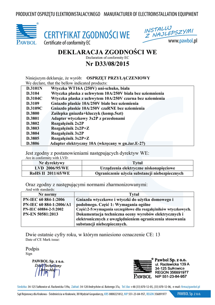 DEKLARACJA ZGODNOŚCI WE Declaration of conformity EC Nr D33/08/2015 Niniejszym deklaruje, że wyrób: OSPRZĘT PRZYŁĄCZENIOWY We declare, that the bellow indicated products: D.3101N Wtyczka WT16A (250V) uni-schuko, biała D.3104 Wtyczka płaska z uchwytem 10A/250V biała bez uziemnienia D.3104C Wtyczka płaska z uchwytem 10A/250V czarna bez uziemienia D.3109 Gniazdo płaskie 10A/250V białe bez uziemienia D.3109C Gniazdo płaskie 10A/250V czaRNE bez uziemienia D.3800 Zaślepka gniazda+kluczyk (komp.5szt) D.3801 Adapter wtyczkowy 3x2P z przesłonami D.3802 Rozgałęźnik 2x2P D.3803 Rozgałęźnik 2x2P+Z D.3804 Rozgałęźnik 3x2P D.3805 Rozgałęźnik 3x2P+Z D.3806 Adapter elektryczny 10A (wkręcany w gn.żar.E-27) Jest zgodny z postanowieniami następujących dyrektyw WE: Are in conformity with LVD: Nr dyrektywy LVD 2006/95/WE RoHS II 2011/65/WE Tytuł Urządzenia elektryczne niskonapięciowe Ograniczenie użycia substancji niebezpiecznych Oraz zgodny z następującymi normami zharmonizowanymi: And with standards: Nr normy PN-IEC 60 884-1:2006 PN-IEC 60 884-1:2006/A1 Tytuł Gniazda wtyczkowe i wtyczki do użytku domowego i podobnego. Część 1: Wymagania ogólne PN-IEC 60884-2-5:2002 Część:2-5:wymagania szczegółowe dla rozgałęźników wtyczkowych. PN-EN 50581:2013 Dokumentacja techniczna oceny wyrobów elektrycznych i elektronicznych z uwzględnieniem ograniczenia stosowania substancji niebezpiecznych. Dwie ostatnie cyfry roku, w którym naniesiono oznaczenie CE: 13 Date of CE Mark issue: Podpis Sign