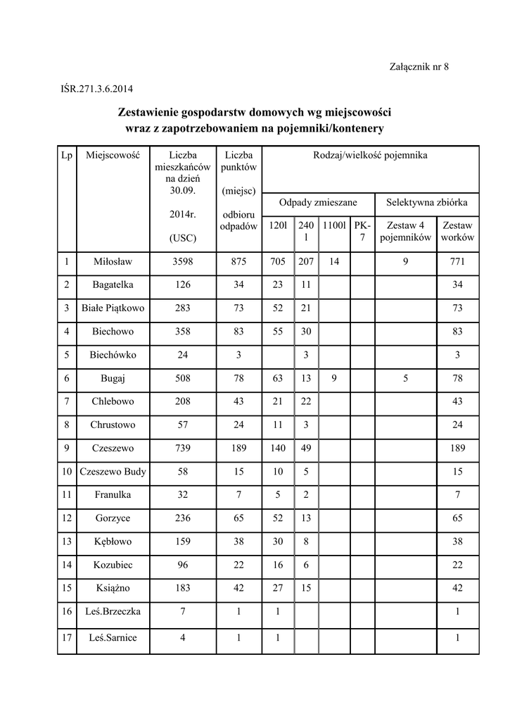 Załącznik nr 8 IŚR.271.3.6.2014 Zestawienie gospodarstw domowych wg miejscowości wraz z zapotrzebowaniem na pojemniki/kontenery Lp Miejscowość Rodzaj/wielkość pojemnika Liczba Liczba mieszkańców punktów na dzień 30.09. (miejsc) Odpady zmieszane 2014r. Selektywna zbiórka odbioru odpadów 120l 240 1100l PKZestaw 4 Zestaw l 7 pojemników worków (USC) 1 Miłosław 3598 875 705 207 2 Bagatelka 126 34 23 11 34 3 Białe Piątkowo 283 73 52 21 73 4 Biechowo 358 83 55 30 83 5 Biechówko 24 3 3 3 6 Bugaj 508 78 63 13 7 Chlebowo 208 43 21 22 43 8 Chrustowo 57 24 11 3 24 9 Czeszewo 739 189 140 49 189 10 Czeszewo Budy 58 15 10 5 15 11 Franulka 32 7 5 2 7 12 Gorzyce 236 65 52 13 65 13 Kębłowo 159 38 30 8 38 14 Kozubiec 96 22 16 6 22 15 Książno 183 42 27 15 42 16 Leś.Brzeczka 7 1 1 1 17 Leś.Sarnice 4 1 1 1 14 9 9 5 771 78 18 Leś.Stoki 4 1 1 19 Lipie 234 58 35 23 58 20 Mikuszewo 335 69 44 25 69 21 Nowa Wieś Podgórna 146 34 22 12 34 22 Orzechowo 2343 499 325 174 23 Pałczyn 314 67 39 28 67 24 Rudki 93 20 11 9 20 25 Skotniki 270 63 33 30 63 26 Szczodrzejewo 88 19 11 8 19 Razem 10503 2423 1733 717 Mieszkańcy zameldowani na pobyt stały: czasowy: 1 11 6 34 20 504 2324 10368 135 10503 Łączne zapotrzebowanie na urządzenia do zbierania odpadów: 1. 2. 3. 4. 5. Pojemnik 120l - 1733 szt. Pojemnik 240l - 717 szt. Pojemnik 1100l - 34 szt. Zestaw 4 pojemników do segregacji - selektywnej zbiórki odpadów: 20 kpl. Zestaw 4 worków do segregacji – selektywnej zbiórki odpadów: 2324 kpl. Ilość odpadów w Mg odebranych przez wykonawcę usługi na terenie Gminy Miłosław od 01.07.2013r do 30.06.2014r. Odpady Odpady zmieszane wielkogabarytowe 200301 200307 Szkło Tworzywa sztuczne 200102 Papier Odpady biodegradowalne 200201 200101 200139 Ogółem 1739,2 Ogółem : 2047,2 = 2047 Mg 19,3 72 90,9 72,8 53