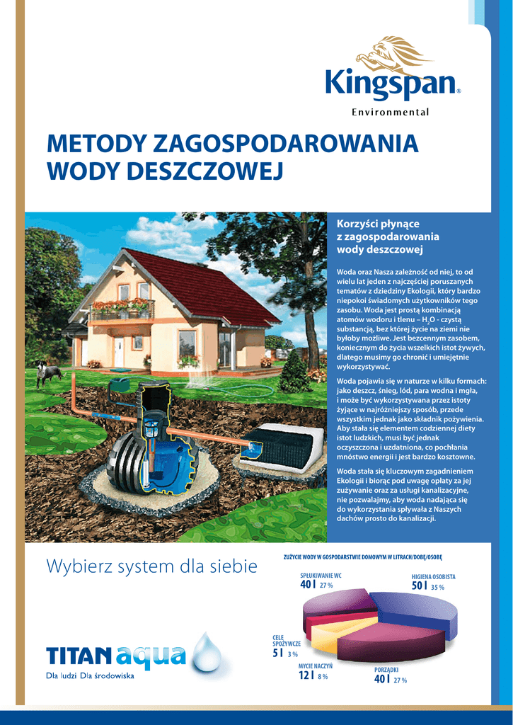 METODY ZAGOSPODAROWANIA WODY DESZCZOWEJ Korzyści płynące z zagospodarowania wody deszczowej Woda oraz Nasza zależność od niej, to od wielu lat jeden z najczęściej poruszanych tematów z dziedziny Ekologii, który bardzo niepokoi świadomych użytkowników tego zasobu. Woda jest prostą kombinacją atomów wodoru i tlenu – H2O - czystą substancją, bez której życie na ziemi nie byłoby możliwe. Jest bezcennym zasobem, koniecznym do życia wszelkich istot żywych, dlatego musimy go chronić i umiejętnie wykorzystywać. Woda pojawia się w naturze w kilku formach: jako deszcz, śnieg, lód, para wodna i mgła, i może być wykorzystywana przez istoty żyjące w najróżniejszy sposób, przede wszystkim jednak jako składnik pożywienia. Aby stała się elementem codziennej diety istot ludzkich, musi być jednak oczyszczona i uzdatniona, co pochłania mnóstwo energii i jest bardzo kosztowne. Woda stała się kluczowym zagadnieniem Ekologii i biorąc pod uwagę opłaty za jej zużywanie oraz za usługi kanalizacyjne, nie pozwalajmy, aby woda nadająca się do wykorzystania spływała z Naszych dachów prosto do kanalizacji. ZUŻYCIE WODY W GOSPODARSTWIE DOMOWYM W LITRACH/DOBĘ/OSOBĘ Wybierz system dla siebie SPŁUKIWANIE WC 40 l HIGIENA OSOBISTA 50 l 27 % CELE SPOŻYWCZE 5l 3% MYCIE NACZYŃ 12 l 8% PORZĄDKI 40 l 27 % 35 % SYSTEMY OGRODOWE - GARDEN Complex służą do magazynowania, a następnie wykorzystania wody do podlewania trawnika w okresie wiosna – jesień. Oprócz tego, wodę można też używać do innych celów takich jak: mycie samochodu, prace porządkowe dookoła domu itp. Woda spływająca z dachu systemem rynnowym poprzez rurę spustową doprowadzana jest rurami ułożonymi pod ziemią do zbiornika podziemnego. Następnie na filtrze zainstalowanym w rurze wznoszącej zbiornika (system GARDEN Complex I) lub filtrze podziemnym zainstalowanym przed zbiornikiem (system GARDEN Complex II) odbywa się jej mechaniczne oczyszczenie z zabrudzeń, a czysta woda spływa do zbiornika. Nadmiar wody, który może okresowo dopływać do zbiornika, odpływa poprzez automatyczny przelew poza zbiornik. Do podlewania trawnika wykorzystuje się standardowe węże ogrodowe oraz naziemne zraszacze dostępne w punktach ogrodniczych. Systemy ogrodowe obejmują: kompletny zbiornik wyposażony w filtr i przelew, zatapialną pompę wielostopniową jednofazową zamocowaną w zbiorniku, zakończoną poborem z sitkiem i pływakiem oraz niezależną od zbiornika skrzynkę ogrodową. S Y S T E M G A R D E N C o m p l e x I Z F I LT R E M Z B I E R A J ĄC Y M FILTR ZBIERAJĄCY Woda dopływająca z dachu do zbiornika niesie ze sobą zanieczyszczenia, które poprzez zainstalowany wewnątrz zbiornika filtr nie mają możliwości dostać się do wnętrza zbiornika. Zanieczyszczenia zawarte w wodzie pozostają w filtrze i muszą być okresowo usuwane przez użytkownika. Filtr zbierający instalowany jest w zbiorniku w sytuacji, gdy nadmiar wody odprowadzany jest do systemu rozsączającego. POKRYWA Zbiornik podziemny można zakopywać na różnej głębokości w gruncie, a umożliwia to nasadka teleskopowa, którą montuje się na rurze wznoszącej zbiornika. Aby zamknąć zbiornik z góry, na nasadkę teleskopową montuje się tworzywową pokrywę o wytrzymałości 1,5 tony. Opcjonalnie możliwe jest zamontowanie pokrywy żeliwnej klasy A15 lub wyższej. SKRZYNKA OGRODOWA Służy do podłączenia węża ogrodowego zakończonego zraszaczem w celu podlewania trawnika. Składa się z: obudowy wykonanej z wytrzymałego na uderzenia tworzywa sztucznego, wyposażonej w zamykaną pokrywę, automatu ciśnieniowego ze zintegrowaną ochroną pompy przed suchobiegiem, podłączenia do węża ogrodowego zakończonego zaworem i szybkozłączem, szybkozłącza do podłączenia rury z PE doprowadzającej wodę ze zbiornika, zaworu do opróżniania instalacji, oraz przewodu elektrycznego do podłączenia skrzynki do 230V. PRZELEW z zasyfonowaniem i zabezpieczeniem przed gryzoniami umożliwia bezobsługowe odprowadzenie nadmiaru wody ze zbiornika w okresie intensywnych opadów deszczu, a także zabezpiecza przed ewentualnym wtargnięciem gryzoni do wnętrza zbiornika. SYSTEM ROZSĄCZAJĄCY AquaBlok® Służy do rozsączania nadmiaru wody deszczowej spływającej z dachu do zbiornika. Pojedynczy AquaBlok® to wykonany z polietylenu prawie idealny sześcian, o ściance 54 cm, pojemności 150 litrów i wadze 8 kg, bardzo łatwy w transporcie i wytrzymały na obciążenie pionowe. POBÓR WODY Składa się: z tworzywowego pływaka wypełnionego powietrzem, dołączonego do niego koszyka ssawnego z fi ltrem o oczku 1,2 mm, zaworu zwrotnego oraz węża łączącego. Ze względu na fakt, iż zanieczyszczenia stałe zbierają się na dnie zbiornika, a zawiesiny flotują na powierzchni, idealnym miejscem poboru wody jest punkt zlokalizowany 15 - 20 cm poniżej powierzchni cieczy. Pływak umożliwia więc utrzymywanie się poboru wody nieco poniżej powierzchni wody w zbiorniku, co zapewnia zasysanie przez pompę tylko i wyłącznie czystej wody. USPOKOJONY WYPŁYW Na dnie zbiornika mogą gromadzić się zanieczyszczenia cięższe od wody. Aby woda dopływająca do zbiornika nie podrywała zanieczyszczeń znajdujących się na dnie, na końcu pionowej rury doprowadzającej stosuje się kształtkę zwaną uspokojonym wypywem. Strumień wody spadając rurą w dół do zbiornika wyhamowuje, a następnie zmienia kierunek i wypływa w górę. Poprzez taką konstrukcję uspokojonego wypływu, do zbiornika wraz z wodą dostarczane jest powietrze, które powoduje odpowiednie natlenienie wody i tym samych zahamowanie szkodliwych procesów beztlenowych mogących zachodzić w zbiorniku. POMPA ZATAPIALNA Wielostopniowa pompa jednofazowa przystosowana jest do pracy w pełnym lub częściowym zanurzeniu charakteryzuje się idealnymi parametrami hydraulicznymi do pracy z typowymi zraszaczami ogrodowymi. Parametry pracy pompy opisane są