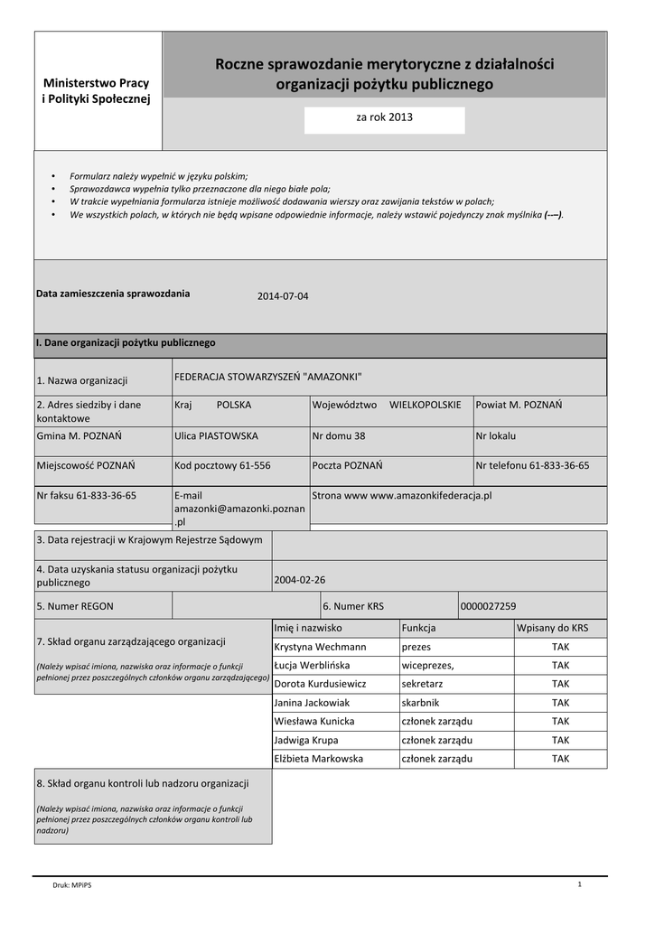 ZŽĐnjŶĞƐƉƌĂǁŽnjĚĂŶŝĞŵĞƌLJƚŽƌLJĐnjŶĞnjĚnjŝĂųĂůŶŽƑĐŝ ŽƌŐĂŶŝnjĂĐũŝƉŽǏLJƚŬƵƉƵďůŝĐnjŶĞŐŽ Ministerstwo Pracy ŝWŽůŝƚLJŬŝ^ƉŽųĞĐnjŶĞũ za rok 2013 • • • • &ŽƌŵƵůĂƌnjŶĂůĞǏLJǁLJƉĞųŶŝđǁũħnjLJŬƵƉŽůƐŬŝŵ͖ ^ƉƌĂǁŽnjĚĂǁĐĂǁLJƉĞųŶŝĂƚLJůŬŽƉƌnjĞnjŶĂĐnjŽŶĞĚůĂŶŝĞŐŽďŝĂųĞƉŽůĂ͖ tƚƌĂŬĐŝĞǁLJƉĞųŶŝĂŶŝĂĨŽƌŵƵůĂƌnjĂŝƐƚŶŝĞũĞŵŽǏůŝǁŽƑđĚŽĚĂǁĂŶŝĂǁŝĞƌƐnjLJŽƌĂnjnjĂǁŝũĂŶŝĂƚĞŬƐƚſǁǁƉŽůĂĐŚ͖ tĞǁƐnjLJƐƚŬŝĐŚƉŽůĂĐŚ͕ǁŬƚſƌLJĐŚŶŝĞďħĚČǁƉŝƐĂŶĞŽĚƉŽǁŝĞĚŶŝĞŝŶĨŽƌŵĂĐũĞ͕ŶĂůĞǏLJǁƐƚĂǁŝđƉŽũĞĚLJŶĐnjLJnjŶĂŬŵLJƑůŶŝŬĂ (--–). Data zamieszczenia sprawozdania 2014-07-04 /͘ĂŶĞŽƌŐĂŶŝnjĂĐũŝƉŽǏLJƚŬƵƉƵďůŝĐnjŶĞŐŽ 1. Nazwa organizacji &Z:^dKtZz^FΗDKE</Η 2. Adres siedziby i dane kontaktowe Kraj 'ŵŝŶĂD͘WKEF Ulica PIASTOWSKA Nr domu 38 Nr lokalu DŝĞũƐĐŽǁŽƑđWKEF Kod pocztowy 61-556 WŽĐnjƚĂWKEF Nr telefonu 61-833-36-65 Nr faksu 61-833-36-65 E-mail Strona www www.amazonkifederacja.pl [email protected] .pl POLSKA Województwo WIELKOPOLSKIE WŽǁŝĂƚD͘WKEF ϯ͘ĂƚĂƌĞũĞƐƚƌĂĐũŝǁ<ƌĂũŽǁLJŵZĞũĞƐƚƌnjĞ^ČĚŽǁLJŵ ϰ͘ĂƚĂƵnjLJƐŬĂŶŝĂƐƚĂƚƵƐƵŽƌŐĂŶŝnjĂĐũŝƉŽǏLJƚŬƵ publicznego 5. Numer REGON ϳ͘^ŬųĂĚŽƌŐĂŶƵnjĂƌnjČĚnjĂũČĐĞŐŽŽƌŐĂŶŝnjĂĐũŝ ;EĂůĞǏLJǁƉŝƐĂđŝŵŝŽŶĂ͕ŶĂnjǁŝƐŬĂŽƌĂnjŝŶĨŽƌŵĂĐũĞŽĨƵŶŬĐũŝ ƉĞųŶŝŽŶĞũƉƌnjĞnjƉŽƐnjĐnjĞŐſůŶLJĐŚĐnjųŽŶŬſǁŽƌŐĂŶƵnjĂƌnjČĚnjĂũČĐĞŐŽͿ 2004-02-26 6. Numer KRS 0000027259 /ŵŝħŝŶĂnjǁŝƐŬŽ Funkcja Wpisany do KRS Krystyna Wechmann prezes TAK BƵĐũĂtĞƌďůŝŷƐŬĂ wiceprezes, TAK Dorota Kurdusiewicz sekretarz TAK Janina Jackowiak skarbnik TAK tŝĞƐųĂǁĂ<ƵŶŝĐŬĂ ĐnjųŽŶĞŬnjĂƌnjČĚƵ TAK Jadwiga Krupa ĐnjųŽŶĞŬnjĂƌnjČĚƵ TAK ůǏďŝĞƚĂDĂƌŬŽǁƐŬĂ ĐnjųŽŶĞŬnjĂƌnjČĚƵ TAK ϴ͘^ŬųĂĚŽƌŐĂŶƵŬŽŶƚƌŽůŝůƵďŶĂĚnjŽƌƵŽƌŐĂŶŝnjĂĐũŝ ;EĂůĞǏLJǁƉŝƐĂđŝŵŝŽŶĂ͕ŶĂnjǁŝƐŬĂŽƌĂnjŝŶĨŽƌŵĂĐũĞŽĨƵŶŬĐũŝ ƉĞųŶŝŽŶĞũƉƌnjĞnjƉŽƐnjĐnjĞŐſůŶLJĐŚĐnjųŽŶŬſǁŽƌŐĂŶƵŬŽŶƚƌŽůŝůƵď nadzoru) Druk: MPiPS 1 /ŵŝħŝŶĂnjǁŝƐŬŽ Funkcja Wpisany do KRS tŝĞƐųĂǁĂ'ĂũĞǁƐŬĂ przewodn. Komisji Rewizyjnej TAK Alicja Tomczyk ĐnjųŽŶĞŬ<ŽŵŝƐũŝ Rewizyjnej TAK :ŽůĂŶƚĂ&ƌČĐŬŝĞǁŝĐnj ĐnjųŽŶĞŬ<ŽŵŝƐũŝ Rewizyjnej TAK ĞůĞŵ^ƚŽǁĂƌnjLJƐnjĞŶŝĂũĞƐƚǁƐnjĞĐŚƐƚƌŽŶŶĞĚnjŝĂųĂŶŝĞŶĂƌnjĞĐnjŽƐſďnjƌĂŬŝĞŵ piersi. 9. Cele statutowe organizacji ;EĂůĞǏLJŽƉŝƐĂđĐĞůĞŶĂƉŽĚƐƚĂǁŝĞƐƚĂƚƵƚƵŽƌŐĂŶŝnjĂĐũŝͿ §7 Federacja realizuje szkolenia centralne profesjonalistów i liderek ŽĐŚŽƚŶŝĐnjĞŬʹŬůƵďLJnjĂƑƐĂŵŽĚnjŝĞůŶŝĞƐnjŬŽůČůŽŬĂůŶĞŽĐŚŽƚŶŝĐnjŬŝ͕ ŽƌŐĂŶŝnjƵũČŽƌĂnjĨŝŶĂŶƐƵũČǁĂƌƐnjƚĂƚLJnjnjĂŬƌĞƐƵƌĞŚĂďŝůŝƚĂĐũŝƉƐLJĐŚŽĨŝnjLJĐnjŶĞũ͘ §8 tƐnjĐnjĞŐſůŶŽƑĐŝ&ĞĚĞƌĂĐũĂƌĞĂůŝnjƵũĞƐǁŽũĞĐĞůĞƉŽƉƌnjĞnj͗ 1͘ƚǁŽƌnjĞŶŝĞǁĂƌƵŶŬſǁƐƉƌnjLJũĂũČĐLJĐŚǁnjĂũĞŵŶĞŵƵǁƐƉĂƌĐŝƵ͕ƉŽŵŽĐLJŝ samopomocy; 2͘ƌĞƉƌĞnjĞŶƚŽǁĂŶŝĞŝŶƚĞƌĞƐſǁŽƐſďĚŽƚŬŶŝħƚLJĐŚƌĂŬŝĞŵƉŝĞƌƐŝ͖ 3͘ƵĚnjŝĞůĂŶŝĞƉŽŵŽĐLJĨŝŶĂŶƐŽǁĞũŽƐŽďŽŵĚŽƚŬŶŝħƚLJŵƌĂŬŝĞŵƉŝĞƌƐŝ ďħĚČĐLJŵǁƐŬƌĂũŶŝĞƚƌƵĚŶĞũƐLJƚƵĂĐũŝŵĂƚĞƌŝĂůŶĞũ͖ 4. programowanie i nadzór merytoryczny nad szkoleniem ochotniczek w ƐŬĂůŝŬƌĂũƵʹŽƌŐĂŶŝnjŽǁĂŶŝĞŝĐnjƵǁĂŶŝĞŶĂĚũĂŬŽƑĐŝČƐnjŬŽůĞŷ merytorycznych pracowników klubów (fizykoterapeutów i psychologów); 5͘njĂnjŶĂũĂŵŝĂŶŝĞƐƉŽųĞĐnjĞŷƐƚǁĂnjƉƌŽďůĞŵĂƚLJŬČŽƐſďƉŽůĞĐnjĞŶŝƵƌĂŬĂ ƉŝĞƌƐŝŽƌĂnjŵŽǏůŝǁŽƑĐŝĂŵŝŝĐŚƉŽǁƌŽƚƵĚŽŶŽƌŵĂůŶĞŐŽǏLJĐŝĂ͖ 6͘ƉƌnjĞĚƐƚĂǁŝĂŶŝĞƉƌŽďůĞŵſǁĚŽƚLJĐnjČĐLJĐŚŽƐſďnjƌĂŬŝĞŵƉŝĞƌƐŝ ĐĞŶƚƌĂůŶLJŵŽƌŐĂŶŽŵǁųĂĚnjLJŝŝŶƐƚLJƚƵĐũŽŵŽĚƉŽǁŝĞĚnjŝĂůŶLJŵnjĂ ŽƌŐĂŶŝnjĂĐũħnjĚƌŽǁŝĂƉƵďůŝĐnjŶĞŐŽ͖ 7͘ǁųČĐnjĂŶŝĞƐŝħĚŽĂŬĐũŝŶĂƌnjĞĐnjǁĐnjĞƐŶĞŐŽǁLJŬƌLJǁĂŶŝĂ͕ůĞĐnjĞŶŝĂŽƌĂnj ƌĞŚĂďŝůŝƚĂĐũŝŽƐſďĚŽƚŬŶŝħƚLJĐŚƌĂŬŝĞŵƉŝĞƌƐŝ͖ 8͘ƉŽĚĞũŵŽǁĂŶŝĞĚnjŝĂųĂŷĚůĂnjĂƉĞǁŶŝĞŶŝĂŽƐŽďŽŵƉŽůĞĐnjĞŶŝƵƌĂŬĂƉŝĞƌƐŝ ŵŽǏůŝǁŽƑĐŝƐƚĂųĞŐŽŬŽƌnjLJƐƚĂŶŝĂnjƉƌŽĨĞƐũŽŶĂůŶĞũƌĞŚĂďŝůŝƚĂĐũŝ͖ 9͘ƵĚnjŝĂųǁƉƌĂĐĂĐŚŬƌĂũŽǁLJĐŚŝŵŝħĚnjLJŶĂƌŽĚŽǁLJĐŚŽƌŐĂŶŝnjĂĐũĂĐŚĚŽǁĂůŬŝ njƌĂŬŝĞŵƉŝĞƌƐŝŽƉŽŬƌĞǁŶLJĐŚĚnjŝĂųĂŶŝĂĐŚ͖ 10͘ƉŽĚĞũŵŽǁĂŶŝĞƉƌĂĐŝĚnjŝĂųĂŷ͕njŵŝĞƌnjĂũČĐLJĐŚĚŽǁƐƉſųĚnjŝĂųĂŶŝĂnj ǁųĂĚnjĂŵŝ͕ƐƚŽǁĂƌnjLJƐnjĞŶŝĂŵŝ͕ŽƌŐĂŶŝnjĂĐũĂŵŝŶĂƵŬŽǁLJŵŝ͕ƐƉŽųĞĐnjŶLJŵŝ͕ njĂǁŽĚŽǁLJŵŝŝĨƵŶĚĂĐũĂŵŝĚnjŝĂųĂũČĐLJŵŝŶĂƌnjĞĐnjĐŚŽƌLJĐŚŝ ŶŝĞƉĞųŶŽƐƉƌĂǁŶLJĐŚ͖ 11͘ǁLJĚĂǁĂŶŝĞŵĂƚĞƌŝĂųſǁĞĚƵŬĂĐLJũŶLJĐŚ͕ďƌŽƐnjƵƌ͕ƉŽƌĂĚŶŝŬſǁ͕ƉůĂŬĂƚſǁ͕ ulotek itp; 12͘njĚŽďLJǁĂŶŝĞŝŐƌŽŵĂĚnjĞŶŝĞƑƌŽĚŬſǁĨŝŶĂŶƐŽǁLJĐŚƵŵŽǏůŝǁŝĂũČĐLJĐŚ ƌĞĂůŝnjĂĐũħĐĞůſǁƐƚĂƚƵƚŽǁLJĐŚ͖ 13͘ƉƌŽǁĂĚnjĞŶŝĞĚnjŝĂųĂůŶŽƑĐŝƉƌŽŵŽĐLJũŶĞũŝĂƌƚLJƐƚLJĐnjŶĞũ͕ŽƌŐĂŶŝnjŽǁĂ