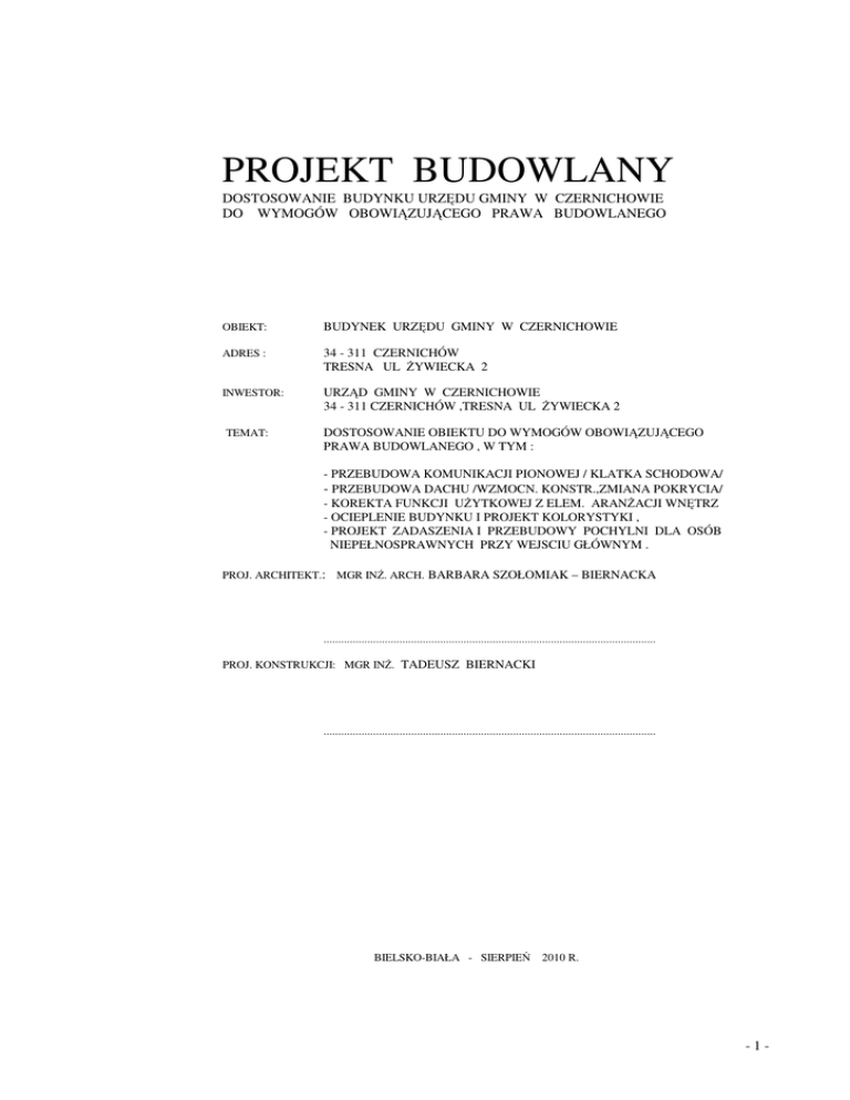 PROJEKT BUDOWLANY DOSTOSOWANIE BUDYNKU URZĘDU GMINY W CZERNICHOWIE DO WYMOGÓW OBOWIĄZUJĄCEGO PRAWA BUDOWLANEGO OBIEKT: BUDYNEK URZĘDU GMINY W CZERNICHOWIE ADRES : 34 - 311 CZERNICHÓW TRESNA UL ŻYWIECKA 2 INWESTOR: URZĄD GMINY W CZERNICHOWIE 34 - 311 CZERNICHÓW ,TRESNA UL ŻYWIECKA 2 TEMAT: DOSTOSOWANIE OBIEKTU DO WYMOGÓW OBOWIĄZUJĄCEGO PRAWA BUDOWLANEGO , W TYM : - PRZEBUDOWA KOMUNIKACJI PIONOWEJ / KLATKA SCHODOWA/ - PRZEBUDOWA DACHU /WZMOCN. KONSTR.,ZMIANA POKRYCIA/ - KOREKTA FUNKCJI UŻYTKOWEJ Z ELEM. ARANŻACJI WNĘTRZ - OCIEPLENIE BUDYNKU I PROJEKT KOLORYSTYKI , - PROJEKT ZADASZENIA I PRZEBUDOWY POCHYLNI DLA OSÓB NIEPEŁNOSPRAWNYCH PRZY WEJSCIU GŁÓWNYM . PROJ. ARCHITEKT.: MGR INŻ. ARCH. BARBARA SZOŁOMIAK – BIERNACKA .................................................................................................................. PROJ. KONSTRUKCJI: MGR INŻ. TADEUSZ BIERNACKI .................................................................................................................. BIELSKO-BIAŁA - SIERPIEŃ 2010 R. -1- SPIS I. Z A W A R T O Ś C I:: DOSTOSOWANIE OBIEKTU DO WYMOGÓW OBOWIAZUJĄCEGO PRAWA BUDOWLANEGO. I.A. I.B. 1. 2. 3. 4. - PRZEBUDOWA KOMUNIKACJI PIONOWEJ / KLATKA SCHODOWA/ - PRZEBUDOWA DACHU /WZMOCN. KONSTR.,ZMIANA POKRYCIA/ - KOREKTA FUNKCJI UŻYTKOWEJ Z ELEM. ARANŻACJI WNĘTRZ - OCIEPLENIE BUDYNKU I PROJEKT KOLORYSTYKI , - PROJEKT ZADASZENIA I PRZEBUDOWY POCHYLNI DLA OSÓB NIEPEŁNOSPRAWNYCH PRZY WEJSCIU GŁÓWNYM . Część opisowa. Ocena zabezpieczenia przeciwpożarowego. Obliczenia statyczne. Część rysunkowa. II. SPECYFIKACJA TECHNICZNA III. PRZEDMIAR ROBÓT I KOSZTORYS INWESTORSKI -2- I. DOSTOSOWANIE OBIEKTU DO WYMOGÓW I.A. I.B. OBOWIAZUJĄCEGO PRAWA BUDOWLANEGO. - PRZEBUDOWA KOMUNIKACJI PIONOWEJ / KLATKA SCHODOWA/ - PRZEBUDOWA DACHU /WZMOCN. KONSTR.,ZMIANA POKRYCIA/ - KOREKTA FUNKCJI UŻYTKOWEJ Z ELEM. ARANŻACJI WNĘTRZ - OCIEPLENIE BUDYNKU I PROJEKT KOLORYSTYKI , - PROJEKT ZADASZENIA PRZY WEJSCIU GŁÓWNYM I PRZEBUDOWA POCHYLNI DLA OSÓB NIEPEŁNOSPRAWNYCH . 1 Część opisowa. 1. Dane ogólne. 2. Opis lokalizacji i stanu istniejącego. 3. Opis przyjętej koncepcji przestrzenno – funkcjonalnej. 4. Zestawienie pomieszczeń. 5. Zakres wyburzeń , wytyczne prowadzenia robót. 6. Projektowane elementy konstrukcyjno – budowlane. 7. Zabezpieczenie termiczne. 8. Zabezpieczenie akustyczne. 9. Zabezpieczenie przeciwwilgociowe. 10. Wyposażenie instalacyjne. 11. Elementy aranżacji i wykończenia wnętrz . 2. I. Ocena zabezpieczenia przeciwpożarowego. Wprowadzenie . II Parametry pożarowo-techniczne 1. 2. 3. 4. 5. 6. 7. 8. 9. 10 11. Grupa wysokości. Funkcja kondygnacji , ilość osób. Gęstość obciążenia ogniowego . Zagrożenie wybuchem . Kategoria zagrożenia ludzi. Podział na strefy pożarowe. Klasa odporności pożarowej budynku. Warunki ewakuacji. Instalacje użytkowe w budynku. Przeciwpożarowe zaopatrzenie wodne . Drogi pożarowe . -3- 3. Obliczenia statyczne. 1. Założenia obliczeniowe : - założenia materiałowe - założenia obciążeniowe - uwagi ogólne 2. Spis pozycji obliczeniowych : poz. 0. Zestawienie obciążeń jednostkowych . 0.1. 0.2. obciążenia stałe. obciążenia zmienne. poz. 1. Dach . 1.1.a/. 1.1.b/. 1.1.c/. 1.2.a/. 1.2.b/. 1.3./ krokwie główne nad sala konferencyjną. krokwie główne nad budynkiem podstawowym. krokwie koszowe. płatwie pośrednie w sali konferencyjnej. płatwie pośrednie w budynku głównym. słupki w sali konferencyjnej. poz.2. konstrukcja poszerzonej kl. schodowej . 2.1. 2.2. 2.3. spocznik-bieg stalowe beleczki wsporcze pod stropem piwnic stalowe beleczki wsporcze pod stropem parteru poz.3. konstrukcja stalowej ściany szkieletowej przy poszerzonej kl. schod. 3.1. 3.2. 3.3. rygle słupy stopy fundam. poz.4. stalowa konstr. wsporcza w oknach przy poszerzonej kl. schodowej poz. 5. Zadaszenie nad wejściem głównym . 5.1. 5.2. 5.3. 5.4. 4. krokwie stalowe. belka podłużna. słupki. stopy Część rysunkowa. architektura: 1. Sytuacja skala 1:500 2. Rzut piwnic skala 1:50 3. Rzut parteru skala 1:50 -4- 4. Rzut I piętra skala 1:50 5. Rzut poddasza skala 1:50 6. Rzut dachu skala 1:50 7. Przekrój A-A skala 1:50 8. Elewacja wschodnia skala 1:100 9. Elewacja południowa skala 1:100 10. Elewacja zachodnia skala 1:100 11. Elewacja północna skala 1:100 12. Zestawienie stolarki drzwiowej skala 1:100 elementy aranżacji wnętrz : 1/A. Rzut poddasza -układ elementów wyposażenia 1:50 2/A. Widok na ścianę I 1:50 3/A. Widok na ścianę II 1:50 4/A. Widok na ścianę III 1:50 5/A. Widok na ścianę IV 1:50 6/A. Projekt posadzki ceramicznej w hallu na poddaszu 1:25 7/A Projekt posadzki ceramicznej w hallu i komunik. ogólnej na I piętrze 1:25 8/A.Projekt posadzki ceramicznej w hallu i komunik. ogólnej na parterze 1:25 konstrukcja: 1/k Trzpienie żelbetowe w ścianie zewn. przy przebudow. kl.schod. 1:25 2/k Stalowa konstr. szkieletowa ściany przy przebudow. kl.schod. 1:25 3/k Konstrukcja żelbetowej , przebudowywanej kl. schodowej. 1:25 4/k Stalowa konstrukcja wsporcza dla okien przy kl schodowej 1:25 5/k Przebudowa kl. schod.-widok stalowej ściany szkieletowej , przekrój przez biegi i spoczniki , 1:50 6/k Rzut więźby - projekt wzmocnień konstrukcyjnych sk. 1:50 7/k Przekrój A-A - wzmocnienia konstrukcyjne sk. 1:50 8/k Przekrój B-B - wzmocnienia konstrukcyjne sk. 1:50 9/k Przekrój C-C - wzmocnienia konstrukcyjne sk. 1:50 10/k Przekrój D-D – wzmocnienia konstrukcyjne sk. 1:50 -5- ocieplenie budynku i projekt kolorystyki : rys.1/kol. elewacja wschodnia - proj. kolorystyki 1:100 rys.2/kol. elewacja południowa - proj. kolorystyki 1:100 rys.3/kol. elewacja zachodnia - proj. kolorystyki 1:100 rys.1/kol. elewacja północna - proj. kolorystyki 1:100 rys 1. ( D1 ) Detal układu warstwowego termoizol. ścian zewn. rys 2. ( D2 ) Detal rozmieszczenia płyt termoizol.i kołkowania rys 3. ( D3 ) Detal ocieplenia cokołu – wariant z okładziną kamienną rys 4. ( D4 ) Detal ocieplen