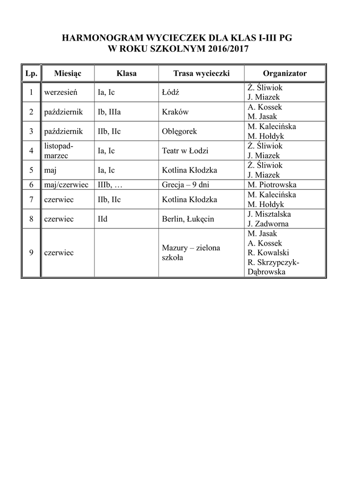 HARMONOGRAM WYCIECZEK DLA KLAS I-III PG W ROKU SZKOLNYM 2016/2017 Lp. Miesiąc Klasa Trasa wycieczki 1 werzesień Ia, Ic Łódź 2 październik Ib, IIIa Kraków 3 październik IIb, IIc Oblęgorek 4 listopadmarzec Ia, Ic Teatr w Łodzi 5 maj Ia, Ic Kotlina Kłodzka 6 maj/czerwiec IIIb, … Grecja – 9 dni 7 czerwiec IIb, IIc Kotlina Kłodzka 8 czerwiec IId Berlin, Łukęcin 9 czerwiec Mazury – zielona szkoła Organizator Ż. Śliwiok J. Miazek A. Kossek M. Jasak M. Kalecińska M. Hołdyk Ż. Śliwiok J. Miazek Ż. Śliwiok J. Miazek M. Piotrowska M. Kalecińska M. Hołdyk J. Misztalska J. Zadworna M. Jasak A. Kossek R. Kowalski R. SkrzypczykDąbrowska