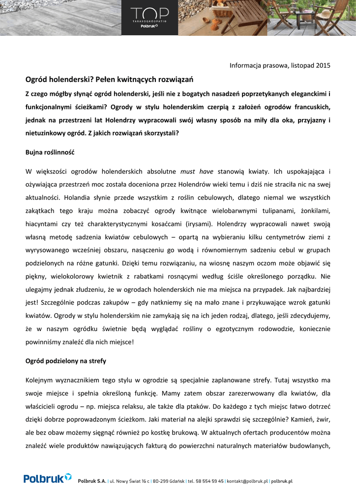 Informacja prasowa, listopad 2015 Ogród holenderski? Pełen kwitnących rozwiązań Z czego mógłby słynąć ogród holenderski, jeśli nie z bogatych nasadzeń poprzetykanych eleganckimi i funkcjonalnymi ścieżkami? Ogrody w stylu holenderskim czerpią z założeń ogrodów francuskich, jednak na przestrzeni lat Holendrzy wypracowali swój własny sposób na miły dla oka, przyjazny i nietuzinkowy ogród. Z jakich rozwiązań skorzystali? Bujna roślinność W większości ogrodów holenderskich absolutne must have stanowią kwiaty. Ich uspokajająca i ożywiająca przestrzeń moc została doceniona przez Holendrów wieki temu i dziś nie straciła nic na swej aktualności. Holandia słynie przede wszystkim z roślin cebulowych, dlatego niemal we wszystkich zakątkach tego kraju można zobaczyć ogrody kwitnące wielobarwnymi tulipanami, żonkilami, hiacyntami czy też charakterystycznymi kosaćcami (irysami). Holendrzy wypracowali nawet swoją własną metodę sadzenia kwiatów cebulowych – opartą na wybieraniu kilku centymetrów ziemi z wyrysowanego wcześniej obszaru, nasączeniu go wodą i równomiernym sadzeniu cebul w grupach podzielonych na różne gatunki. Dzięki temu rozwiązaniu, na wiosnę naszym oczom może objawić się piękny, wielokolorowy kwietnik z rabatkami rosnącymi według ściśle określonego porządku. Nie ulegajmy jednak złudzeniu, że w ogrodach holenderskich nie ma miejsca na przypadek. Jak najbardziej jest! Szczególnie podczas zakupów – gdy natkniemy się na mało znane i przykuwające wzrok gatunki kwiatów. Ogrody w stylu holenderskim nie zamykają się na ich jeden rodzaj, dlatego, jeśli zdecydujemy, że w naszym ogródku świetnie będą wyglądać rośliny o egzotycznym rodowodzie, koniecznie powinniśmy znaleźć dla nich miejsce! Ogród podzielony na strefy Kolejnym wyznacznikiem tego stylu w ogrodzie są specjalnie zaplanowane strefy. Tutaj wszystko ma swoje miejsce i spełnia określoną funkcję. Mamy zatem obszar zarezerwowany dla kwiatów, dla właścicieli ogrodu – np. miejsca relaksu, ale także dla ptaków. Do każdego z tych miejsc łatwo dotrzeć dzięki dobrze poprowadzonym ścieżkom. Jaki materiał na alejki sprawdzi się szczególnie? Kamień, żwir, ale bez obaw możemy sięgnąć również po kostkę brukową. W aktualnych ofertach producentów można znaleźć wiele produktów nawiązujących fakturą do powierzchni naturalnych materiałów budowlanych, np. drewna, granitu czy trawertynu. Pozwolą one nie tylko wytyczyć w ogrodzie komponujące się z otoczeniem ścieżki, ale również stworzyć funkcjonalne miejsca relaksu, łatwe w utrzymaniu czystości tarasy czy ganki. Przykładem takiej linii nowoczesnych produktów jest seria TOP marki Polbruk i jej płyty tarasowe Polbruk Lira, Aura i Linea. Sięgnijmy do źródła Ogrody holenderskie czerpią z rozwiązań francuskich – to już wiemy. Czas doprecyzować z jakich. Okazuje się, że to, co zwykle kojarzy nam się z ogrodami spod znaku Ludwika XIV, może świetnie odnaleźć się również w scenerii holenderskiej. Równo przycięte krzewy czy żywopłoty (często pełniące funkcję ogrodzenia), ozdobne fontanny lub marmurowe donice – wszystko to tworzy klimat ogrodu, który, choćby nie zdumiewał wielkością, zaskakuje umiejętnym połączeniem tego, co doniosłe, a nawet luksusowe, z tym, co proste i klasyczne. Takich cech często brakuje dużo popularniejszym stylom zapożyczonym z innych krajów. O firmie Polbruk S.A. – część irlandzkiej grupy CRH plc specjalizuje się w wytwarzaniu najwyższej jakości kostki brukowej, betonowych wyrobów drogowych i innych elementów małej architektury. Od ponad 20 lat dostarczamy Państwu materiały do aranżacji pięknych i trwałych nawierzchni, a wsparcie ze strony CRH - jednego z największych dystrybutorów materiałów budowlanych na świecie – pozwala nam wciąż się rozwijać i dążyć do tego, by kreowane przez nas przestrzenie nabierały niezwykłego charakteru. Polbruk S.A. jest największym producentem kostki i wyrobów drogowych w Polsce. Nasze produkty są powszechnie rozpoznawalne i dostępne na terenie całego kraju. Pozycja lidera zobowiązuje nas do ciągłej rozbudowy sieci dystrybucji, utrzymywania wysokiej jakości i nieustannego poszukiwania nowych rozwiązań. Bogactwo oferowanych kolekcji ich zróżnicowane wzornictwo - odpowiada aktualnym trendom stylistycznym i daje nieograniczone możliwości. polbruk.pl facebook.com/polbruk pinterest.com/polbruk/ googleplus.polbruk.pl/ Kontakt: Katarzyna Stankiewicz, Specjalista ds. Marketingu tel.: 605 634 591 e-mail: [email protected]