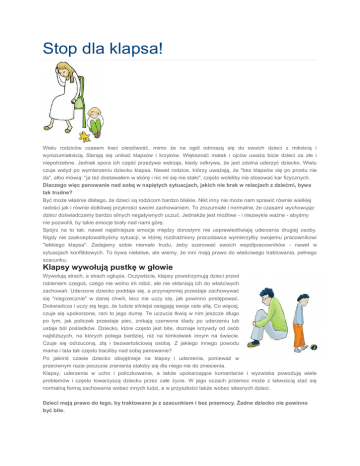 Stop dla klapsa! Wielu rodziców czasem traci cierpliwość, mimo że na ogół odnoszą się do swoich dzieci z miłością i wyrozumiałością. Starają się unikać klapsów i krzyków. Większość matek i ojców uważa bicie dzieci za złe i niepotrzebne. Jednak spora ich część przeżywa wstrząs, kiedy odkrywa, że jest zdolna uderzyć dziecko. Wielu czuje wstyd po wymierzeniu dziecku klapsa. Nawet rodzice, którzy uważają, że "bez klapsów się po prostu nie da", albo mówią: "ja też dostawałem w skórę i nic mi się nie stało", często woleliby nie stosować kar fizycznych. Dlaczego więc panowanie nad sobą w napiętych sytuacjach, jakich nie brak w relacjach z dziećmi, bywa tak trudne? Być może właśnie dlatego, że dzieci są rodzicom bardzo bliskie. Nikt inny nie może nam sprawić równie wielkiej radości jak i równie dotkliwej przykrości swoim zachowaniem. To zrozumiałe i normalne, że czasami wychowując dzieci doświadczamy bardzo silnych negatywnych uczuć. Jednakże jest możliwe - i niezwykle ważne - abyśmy nie pozwolili, by takie emocje brały nad nami górę. Spójrz na to tak: nawet najsilniejsze emocje między dorosłymi nie usprawiedliwiają uderzenia drugiej osoby. Nigdy nie zaakceptowalibyśmy sytuacji, w której rozdrażniony pracodawca wymierzyłby swojemu pracownikowi "lekkiego klapsa". Zadajemy sobie niemało trudu, żeby szanować swoich współpracowników - nawet w sytuacjach konfliktowych. To bywa niełatwe, ale wiemy, że inni mają prawo do właściwego traktowania, pełnego szacunku. Klapsy wywołują pustkę w głowie Wywołują strach, a strach ogłupia. Oczywiście, klapsy powstrzymują dzieci przed robieniem czegoś, czego nie wolno im robić, ale nie skłaniają ich do właściwych zachowań. Uderzone dziecko poddaje się, a przynajmniej przestaje zachowywać się "niegrzecznie" w danej chwili, lecz nie uczy się, jak powinno postępować. Doświadcza i uczy się tego, że ludzie silniejsi osiągają swoje cele siłą. Co więcej, czuje się upokorzone, rani to jego dumę. Te uczucia tkwią w nim jeszcze długo po tym, jak policzek przestaje piec, znikają czerwone ślady po uderzeniu lub ustaje ból pośladków. Dziecko, które często jest bite, doznaje krzywdy od osób najbliższych, na których polega bardziej, niż na kimkolwiek innym na świecie. Czuje się odrzuconą, złą i bezwartościową osobą. Z jakiego innego powodu mama i tata tak często traciliby nad sobą panowanie? Po jakimś czasie dziecko obojętnieje na klapsy i uderzenia, ponieważ w przeciwnym razie poczucie zranienia stałoby się dla niego nie do zniesienia. Klapsy, uderzenia w ucho i policzkowanie, a także upokarzające komentarze i wyzwiska powodują wiele problemów i często towarzyszą dziecku przez całe życie. W jego oczach przemoc może z łatwością stać się normalną formą zachowania wobec innych ludzi, a w przyszłości także wobec własnych dzieci. Dzieci mają prawo do tego, by traktowano je z szacunkiem i bez przemocy. Żadne dziecko nie powinno być bite. 10 powodów, by nie bić dziecka Bicie dzieci może doprowadzać do fizycznych urazów, takich jak zasinienia, obrzęki, krwiaki podtwardówkowe, uszkodzenia nerwów i złamania kości. Bicie dziecka niszczy jego ufność i burzy poczucie własnej wartości. Dzieci znacznie chętniej podejmują zachowania nastawione na współpracę, jeśli łączy je z rodzicami silna więź miłości. Bicie dzieci powoduje przekazywanie postawy akceptacji przemocy z pokolenia na pokolenie. Dzieci, które są często bite, uczą się stosowania przemocy. Bicie dzieci uczy je, że "silniejszy ma zawsze rację". Bijąc dziecko za złe zachowanie, opiekun traci cenną szansę nauczenia go właściwego sposobu postępowania. Wspomnienia z dzieciństwa osób, które jako dzieci były często bite, są zwykle pełne gniewu i urazy. Fragmenty Pisma Świętego, za pomocą których uzasadnia się stosowanie kar fizycznych wobec dzieci, można by Strach nie jest skuteczną metodą uczenia dzieci pożądanych zachowań. Bite dzieci zwykle zachowują się dobrze tylko wtedy, kiedy stosujący przemoc dorosły znajduje się w pobliżu. równie dobrze wykorzystać do usprawiedliwienia niewolnictwa, dyskryminacji kobiet, kazirodztwa i dzieciobójstwa. Powoływanie się na Biblię, aby uzasadnić bicie dzieci, jest przykładem wybiórczego wykorzystywania religijnych ksiąg do usprawiedliwienia świeckiego sposobu myślenia. Dzieci są często bite za zachowania, które nie są "złe" czy "niewłaściwe", ale wynikają z ich naturalnej potrzeby badania świata, a także z potrzeb związanych z odżywianiem, snem, ruchem czy chęcią zwrócenia na siebie uwagi. Dzieci najłatwiej uczą się pożądanych zachowań, kiedy dorośli wyjaśniają im, jak powinny postępować, rozmawiają z nimi oraz własnym zachowaniem dają im przykład odpowiedzialności, troski i samodyscypliny. Fragmenty broszury "Zamiast klapsa - jak z miłością i szacunkiem wyznaczać dziecku granice" Grafika: Ewa Brejnakowska-Jończyk Literatura: Faber A., Mazlish E. (2001), "Jak mówić, żeby dzieci nas słuchały jak słuchać żeby dzieci do nas mówiły", Media Rodzina. Gordon T. (1991), "Wychowanie bez porażek", Instytut Wydawniczy PAX. Sakowska J. (1999), "Szkoła dla rodziców i wychowawców", Centrum Metodyczne Pomocy PsychologicznoPedagogicznej Ministerstwa Edukacji Narodowej. MacKenzie J.R. (2008) "Kiedy pozwolić? Kiedy zabronić?", GWP. Autorka: Marlena Trąbińska-Haduch