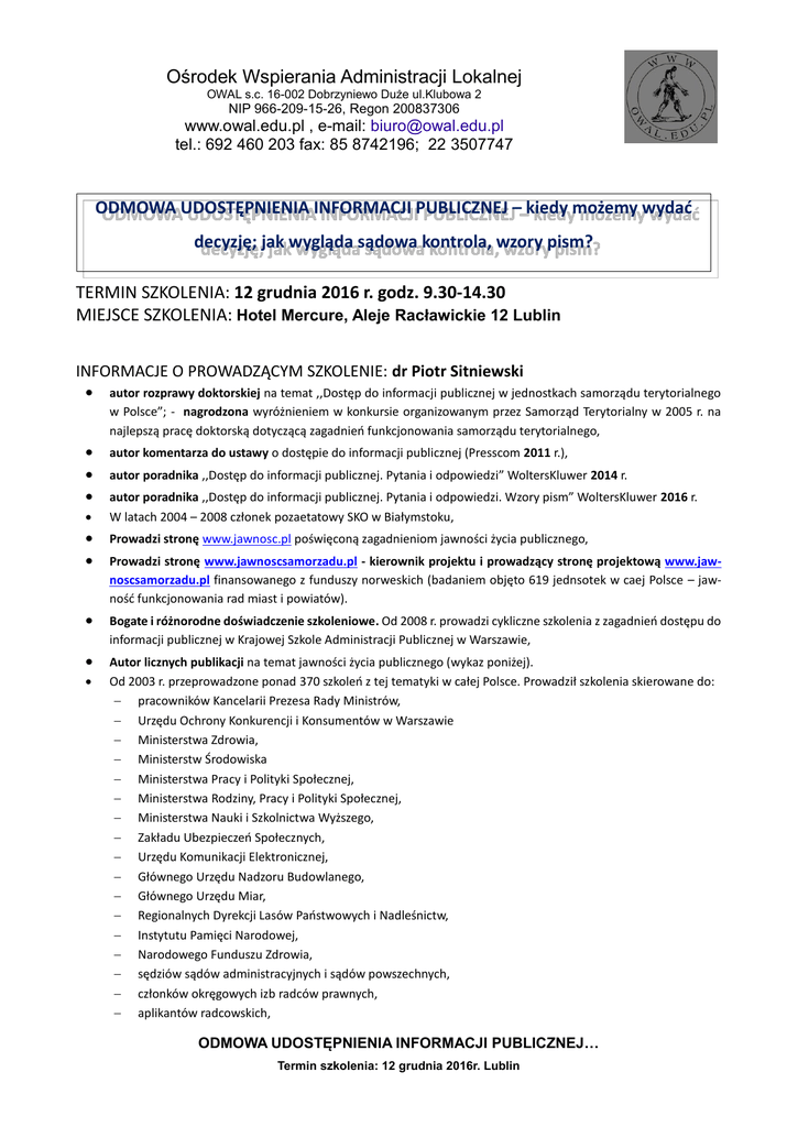 Ośrodek Wspierania Administracji Lokalnej OWAL s.c. 16-002 Dobrzyniewo Duże ul.Klubowa 2 NIP 966-209-15-26, Regon 200837306 www.owal.edu.pl , e-mail: [email protected] tel.: 692 460 203 fax: 85 8742196; 22 3507747 ODMOWA UDOSTĘPNIENIA INFORMACJI PUBLICZNEJ – kiedy możemy wydać decyzję; jak wygląda sądowa kontrola, wzory pism? TERMIN SZKOLENIA: 12 grudnia 2016 r. godz. 9.30-14.30 MIEJSCE SZKOLENIA: Hotel Mercure, Aleje Racławickie 12 Lublin INFORMACJE O PROWADZĄCYM SZKOLENIE: dr Piotr Sitniewski autor rozprawy doktorskiej na temat ,,Dostęp do informacji publicznej w jednostkach samorządu terytorialnego w Polsce”; - nagrodzona wyróżnieniem w konkursie organizowanym przez Samorząd Terytorialny w 2005 r. na najlepszą pracę doktorską dotyczącą zagadnień funkcjonowania samorządu terytorialnego, autor komentarza do ustawy o dostępie do informacji publicznej (Presscom 2011 r.), autor poradnika ,,Dostęp do informacji publicznej. Pytania i odpowiedzi” WoltersKluwer 2014 r. autor poradnika ,,Dostęp do informacji publicznej. Pytania i odpowiedzi. Wzory pism” WoltersKluwer 2016 r. W latach 2004 – 2008 członek pozaetatowy SKO w Białymstoku, Prowadzi stronę www.jawnosc.pl poświęconą zagadnieniom jawności życia publicznego, Bogate i różnorodne doświadczenie szkoleniowe. Od 2008 r. prowadzi cykliczne szkolenia z zagadnień dostępu do informacji publicznej w Krajowej Szkole Administracji Publicznej w Warszawie, Autor licznych publikacji na temat jawności życia publicznego (wykaz poniżej). Od 2003 r. przeprowadzone ponad 370 szkoleń z tej tematyki w całej Polsce. Prowadził szkolenia skierowane do: pracowników Kancelarii Prezesa Rady Ministrów, Urzędu Ochrony Konkurencji i Konsumentów w Warszawie Ministerstwa Zdrowia, Ministerstw Środowiska Ministerstwa Pracy i Polityki Społecznej, Ministerstwa Rodziny, Pracy i Polityki Społecznej, Ministerstwa Nauki i Szkolnictwa Wyższego, Zakładu Ubezpieczeń Społecznych, Urzędu Komunikacji Elektronicznej, Głównego Urzędu Nadzoru Budowlanego, Głównego Urzędu Miar, Regionalnych Dyrekcji Lasów Państwowych i Nadleśnictw, Instytutu Pamięci Narodowej, Narodowego Funduszu Zdrowia, sędziów sądów administracyjnych i sądów powszechnych, członków okręgowych izb radców prawnych, aplikantów radcowskich, Prowadzi stronę www.jawnoscsamorzadu.pl - kierownik projektu i prowadzący stronę projektową www.jawnoscsamorzadu.pl finansowanego z funduszy norweskich (badaniem objęto 619 jednsotek w caej Polsce – jawność funkcjonowania rad miast i powiatów). ODMOWA UDOSTĘPNIENIA INFORMACJI PUBLICZNEJ… Termin szkolenia: 12 grudnia 2016r. Lublin Ośrodek Wspierania Administracji Lokalnej OWAL s.c. 16-002 Dobrzyniewo Duże ul.Klubowa 2 NIP 966-209-15-26, Regon 200837306 www.owal.edu.pl , e-mail: [email protected] tel.: 692 460 203 fax: 85 8742196; 22 3507747 członków Samorządowych Kolegiów Odwoławczych, pracowników sądów powszechnych, przewodniczących rad gmin i powiatów, pracowników biur rady miasta i rady powiatu, sekretarzy miast i sekretarzy powiatów, radnych wszystkich trzech szczebli samorządowych, pracowników urzędów marszałkowskich, administratorów stron BIP-owskich, pracowników starostw, pracowników Izb Skarbowych, i Izb Celnych, pracowników urzędów skarbowych powiatowych inspektorów nadzoru budowlanego, rzeczników prasowych urzędów, dziennikarz Członek Polskiej Komisji Akredytacyjnej w latach 01.01. 2008-16.10 2012. www.pka.edu.pl Obecnie ekspert Polskiej Komisji Akredytacyjnej. Szkolenie skierowane jest do osób, które posiadają doświadczenie w zakresie rozpatrywania wniosków i na co dzień przygotowują odpowiedzi na składane wnioski. Celem szkolenia jest skupienie się na aspekcie odmowy udostępnienia informacji publicznej, sądowej kontroli tego procesu, oraz zasad formułowania odpowiedzi na skargi. Pogłębionej analizie poddane zostaną wszystkie aspektów z tym związane, oraz przedstawione wyniki analizy orzeczeń administracyjnych. Szkolenie prowadzone jest w formule konwersatorium, co oznacza, że w jego trakcie uczestnicy zadają pytania, i każde zagadnienie jest omawiane przez prowadzącego. CO OTRZYMUJE UCZESTNIK? kilkanaście wzorów pism w wersji wydrukowanej i elektronicznej wydrukowane akty prawne wydrukowany konspekt (prezentację) ODMOWA UDOSTĘPNIENIA INFORMACJI PUBLICZNEJ… Termin szkolenia: 12 grudnia 2016r. Lublin Ośrodek Wspierania Administracji Lokalnej OWAL s.c. 16-002 Dobrzyniewo Duże ul.Klubowa 2 NIP 966-209-15-26, Regon 200837306 www.owal.edu.pl , e-mail: [email protected] tel.: 692 460 203 fax: 85 8742196; 22 3507747 PROGRAM: 1. Zakres stosowania przepisów k.p.a. do postępowania regulowanego udip. 1.1.Charakter postępowania regulowanego przepisami udip (odformalizowanie). 1.2. Moment stosowania k.p.a - czynności zmierzające do wydania decyzji. 1.2.1. Wezwanie do uzupełnienia braków formalnych na podstawie art. 64 par. 2 k.p.a. WZÓR PISMA 1.2.2. Wezwanie do podpisania wniosku lub wysłanie elektronicznie przy pomocy EPUAP WZÓR PISMA 1.2.3. Wezwanie do wykazania szczególnej istotności dla interesu publicznego. WZÓR PISMA 1.2.4. Powiadomienie na podstawie art. 14 ust. 2 udip. WZÓR PISMA 2. W jakiej sytuacji mamy prawo wydać decyzję administracyjną. 2.1. Decyzja o odmowie udostępnienia informacji publicznej (art. 16 udip). 2.1.1. Odmowa udostępnienia informacji ze względu na prawo do prywatności. WZÓR DECYZJI 2.1.1.1. Pojęcie prawa do prywatności. 2.1.1.2. Funkcjonariusz publiczny a osoba pełniąca funkcje publiczne. 2.1.1.3. Jawność wynagrodzeń – w jakim stopniu i wobec kogo? 2.1.1.4. Zasady dokonywania anonimizacji. 2.1.2. Odmowa udostępnienia informacji ze względu na tajemnicę przedsiębiorcy. WZÓR DECYZJI 2.1.2.1. Pojęcie tajemnicy przedsiębiorstwa 2.1.2.2. Kto i kiedy ma ustalić zakres wyłączenia tajemnicy przedsiębiorcy ? 2.1.3. Odmowa udostępnienia informacji ze względu na brak szczeg
