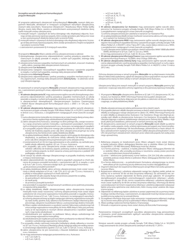 Szczególne warunki ubezpieczeń komunikacyjnych program Motocykle § 1. W programie pakietowych ubezpieczeń komunikacyjnych Motocykle, zwanym dalej programem Motocykle, określonym w niniejszych szczególnych warunkach ubezpieczenia, zwanych dalej warunkami, Towarzystwo Ubezpieczeń i Reasekuracji Allianz Polska Spółka Akcyjna, zwane dalej Allianz, zawiera za pośrednictwem autoryzowanych dealerów danej marki motocykli umowy ubezpieczenia: 1)motocykli nowych i używanych do końca dziesiątego roku eksploatacji włącznie, liczonego od daty pierwszej rejestracji pojazdu, które zostały sprzedane jako fabrycznie nowe w sieci autoryzowanych dealerów danej marki na terenie Polski; 2)motocykli nowych i używanych do końca dziesiątego roku eksploatacji włączenie, liczonego od daty pierwszej rejestracji pojazdu, które zostały sprowadzone z krajów europejskich i sprzedane na terenie Polski – z zastrzeżeniem postanowień § 4 niniejszych warunków. § 2. W programie Motocykle Allianz udziela ochrony ubezpieczeniowej w zakresie: 1)obowiązkowego ubezpieczenia odpowiedzialności cywilnej posiadaczy pojazdów mechanicznych za szkody powstałe w związku z ruchem tych pojazdów, zwanego dalej ubezpieczeniem OC; 2)ubezpieczenia Autocasco pojazdów mechanicznych od uszkodzeń, zniszczeń i kradzieży – pełny zakres, zwanego dalej ubezpieczeniem Autocasco; 3)ubezpieczenie Car Assistance; 4)ubezpieczenia następstw nieszczęśliwych wypadków kierowcy i pasażerów pojazdów w związku z ruchem tych pojazdów, zwanego dalej ubezpieczeniem NNW; 5)ubezpieczenia Informacja Prawna; 6)ubezpieczenia odpowiedzialności cywilnej posiadaczy pojazdów mechanicznych w ruchu zagranicznym, zwanego dalej ubezpieczeniem Zielonej Karty – w zależności od decyzji Ubezpieczającego. § 3. W zawieranych w ramach programu Motocykle umowach ubezpieczenia mają zastosowanie, z zastrzeżeniem poniższych zmian, odpowiednio następujące ogólne warunki ubezpieczeń: 1. W zakresie ubezpieczenia OC mają zastosowanie ogólne warunki obowiązkowego ubezpieczenia odpowiedzialności cywilnej posiadaczy pojazdów mechanicznych za szkody powstałe w związku z ruchem tych pojazdów, określone w ustawie z dnia 22.05.2003 roku o ubezpieczeniach obowiązkowych, Ubezpieczeniowym Funduszu Gwarancyjnym i Polskim Biurze Ubezpieczycieli Komunikacyjnych (Dz.U. z 2003 r. nr 124, poz. 1152 z późn. zm.); 2. W zakresie ubezpieczenia Autocasco mają zastosowanie ogólne warunki ubezpieczenia Autocasco przyjęte uchwałą Zarządu TUiR Allianz Polska S.A. nr 91/2013, zwane dalej w skrócie o.w.u. Autocasco, z uwzględnieniem następujących zmian (warunki szczególne): 1)suma ubezpieczenia motocykla nie zmniejsza się w czasie trwania danej umowy ubezpieczenia o kwotę wypłaconego odszkodowania (odszkodowań); 2)zakres ubezpieczenia Autocasco, zawartego na okres jednego roku, zostaje rozszerzony o opcję utrzymania wartości motocykla, z zachowaniem pozostałych, niezmienionych w niniejszym punkcie postanowień o.w.u. Autocasco, na następujących zasadach: a)w przypadku pojazdu fabrycznie nowego jako podstawę do rozliczenia szkody całkowitej lub kradzieży pojazdu przez cały okres ubezpieczenia przyjmuje się sumę ubezpieczenia, bez konieczności opłaty dodatkowej składki; b)za opłatą dodatkowej składki, w przypadku pojazdu od drugiego do dziesiątego roku eksploatacji, za podstawę do rozliczenia szkody całkowitej lub kradzieży pojazdu przez cały okres ubezpieczenia przyjmowana jest suma ubezpieczenia; c)postanowienia lit a) i b) nie mają zastosowania w celu ustalenia, czy zachodzi przypadek szkody całkowitej zgodnie z §1 ust. 13 o.w.u. Autocasco; d)w przypadku, gdy suma ubezpieczenia została ustalona w wartości netto, przy szkodzie całkowitej lub kradzieży pojazdu podstawą ustalenia odszkodowania jest wartość rynkowa pojazdu na dzień zawarcia umowy pomniejszona o podatek VAT podlegający odliczeniu; 3)nie stosuje się udziału własnego Ubezpieczonego w przypadku kradzieży motocykla z miejsca niestrzeżonego; 4)zakres odpowiedzialności nie obejmuje szkód w pojazdach używanych w chwili zdarzenia do przewozu przesyłek kurierskich, z zastrzeżeniem pkt 5), w związku z czym w § 4 ust.1 pkt 7) o.w.u. Autocasco dodaje się lit. g) o następującym brzmieniu: „g) do przewozu przesyłek kurierskich”; 5)za opłatą dodatkowej składki zakres ochrony ubezpieczeniowej może zostać rozszerzony o szkody wskazane w § 4 ust. 1 pkt 7) lit. a)-c) i g) i pkt 17) o.w.u. Autocasco tj. o szkody w motocyklach używanych w chwili zdarzenia: – jako taksówki lub jako pojazdy służące do przewozu pasażerów za opłatą, – do jazd próbnych i demonstracyjnych, – do nauki jazdy, – do przewozu przesyłek kurierskich oraz powstałych w pojazdach wynajmowanych zarobkowo przez podmioty prowadzące wypożyczalnię pojazdów ; 6)za opłatą dodatkowej składki ubezpieczeniowej, zakres ubezpieczenia Autocasco motocykla może zostać rozszerzony i ochroną ubezpieczeniową może zostać objęte uszkodzenie lub zniszczenie wyposażenia motocyklisty powstałe w wypadku motocykla, o którym mowa w § 3 ust. 1 pkt 1) o.w.u. Autocasco, na następujących warunkach: a)ochroną ubezpieczeniową są objęte następujące elementy wyposażenia motocyklisty: kask, kurtka, spodnie, buty, rękawice oraz kombinezon, będące własnością ubezpieczonego, zakupione na podstawie faktury u autoryzowanego dealera motocykli; b)Allianz wypłaci odszkodowanie w wysokości wartości fakturowej uszkodzonego lub zniszczonego wyposażenia motocyklisty do limitu 4000 złotych, który jest pomniejszany aż do wyczerpania w rocznym okresie ubezpieczenia o wysokość wypłacanych z tego tytułu odszkodowań; c)odszkodowanie jest wypłacane na podstawie faktury zakupu uszkodzonego lub zniszczonego wyposażenia motocyklisty; d)odszkodowanie jest wypłacane pod warunkiem przekazania na własność Allianz pozostałości uszkodzonego wyp