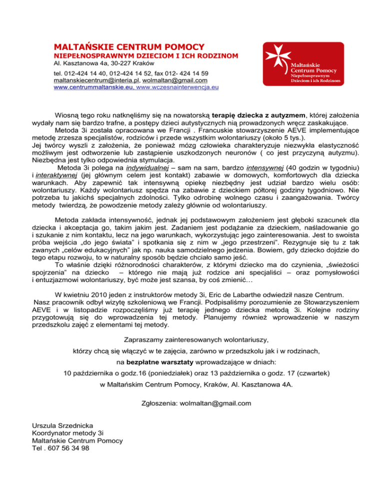 MALTAŃSKIE CENTRUM POMOCY NIEPEŁNOSPRAWNYM DZIECIOM I ICH RODZINOM Al. Kasztanowa 4a, 30-227 Kraków tel. 012-424 14 40, 012-424 14 52, fax 012- 424 14 59 [email protected], [email protected] www.centrummaltanskie.eu, www.wczesnainterwencja.eu Wiosną tego roku natknęliśmy się na nowatorską terapię dziecka z autyzmem, której założenia wydały nam się bardzo trafne, a postępy dzieci autystycznych nią prowadzonych wręcz zaskakujące. Metoda 3i została opracowana we Francji . Francuskie stowarzyszenie AEVE implementujące metodę zrzesza specjalistów, rodziców i przede wszystkim wolontariuszy (około 5 tys.). Jej twórcy wyszli z założenia, że ponieważ mózg człowieka charakteryzuje niezwykła elastyczność możliwym jest odtworzenie lub zastąpienie uszkodzonych neuronów ( co jest przyczyną autyzmu). Niezbędna jest tylko odpowiednia stymulacja. Metoda 3i polega na indywidualnej – sam na sam, bardzo intensywnej (40 godzin w tygodniu) i interaktywnej (jej głównym celem jest kontakt) zabawie w domowych, komfortowych dla dziecka warunkach. Aby zapewnić tak intensywną opiekę niezbędny jest udział bardzo wielu osób: wolontariuszy. Każdy wolontariusz spędza na zabawie z dzieckiem półtorej godziny tygodniowo. Nie potrzeba tu jakichś specjalnych zdolności. Tylko odrobinę wolnego czasu i zaangażowania. Twórcy metody twierdzą, że powodzenie metody zależy głównie od wolontariuszy. Metoda zakłada intensywność, jednak jej podstawowym założeniem jest głęboki szacunek dla dziecka i akceptacja go, takim jakim jest. Zadaniem jest podążanie za dzieckiem, naśladowanie go i szukanie z nim kontaktu, lecz na jego warunkach, wykorzystując jego zainteresowania. Jest to swoista próba wejścia „do jego świata” i spotkania się z nim w „jego przestrzeni”. Rezygnuje się tu z tak zwanych „celów edukacyjnych” jak np. nauka samodzielnego jedzenia. Bowiem, gdy dziecko dojdzie do tego etapu rozwoju, to w naturalny sposób będzie chciało samo jeść. To właśnie dzięki różnorodności charakterów, z którymi dziecko ma do czynienia, „świeżości spojrzenia” na dziecko – którego nie mają już rodzice ani specjaliści – oraz pomysłowości i entuzjazmowi wolontariuszy, być może jest szansa, by coś zmienić… W kwietniu 2010 jeden z instruktorów metody 3i, Eric de Labarthe odwiedził nasze Centrum. Nasz pracownik odbył wizytę szkoleniową we Francji. Podpisaliśmy porozumienie ze Stowarzyszeniem AEVE i w listopadzie rozpoczęliśmy już terapię jednego dziecka metodą 3i. Kolejne rodziny przygotowują się do wprowadzenia tej metody. Planujemy również wprowadzenie w naszym przedszkolu zajęć z elementami tej metody. Zapraszamy zainteresowanych wolontariuszy, którzy chcą się włączyć w te zajęcia, zarówno w przedszkolu jak i w rodzinach, na bezpłatne warsztaty wprowadzające w dniach: 10 października o godz.16 (poniedziałek) oraz 13 października o godz. 17 (czwartek) w Maltańskim Centrum Pomocy, Kraków, Al. Kasztanowa 4A. Zgłoszenia: [email protected] Urszula Srzednicka Koordynator metody 3i Maltańskie Centrum Pomocy Tel . 607 56 34 98