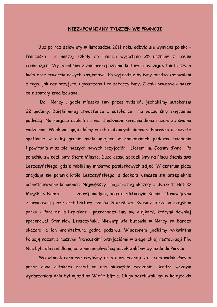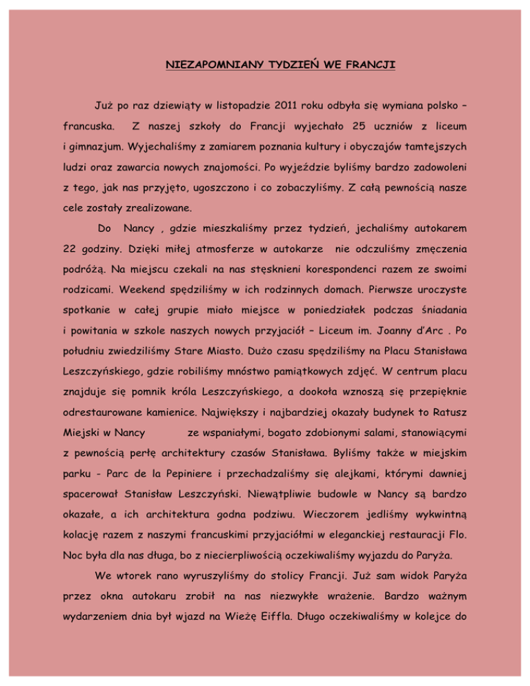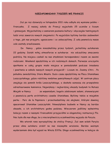 NIEZAPOMNIANY TYDZIEŃ WE FRANCJI Już po raz dziewiąty w listopadzie 2011 roku odbyła się wymiana polsko – francuska. Z naszej szkoły do Francji wyjechało 25 uczniów z liceum i gimnazjum. Wyjechaliśmy z zamiarem poznania kultury i obyczajów tamtejszych ludzi oraz zawarcia nowych znajomości. Po wyjeździe byliśmy bardzo zadowoleni z tego, jak nas przyjęto, ugoszczono i co zobaczyliśmy. Z całą pewnością nasze cele zostały zrealizowane. Do Nancy , gdzie mieszkaliśmy przez tydzień, jechaliśmy autokarem 22 godziny. Dzięki miłej atmosferze w autokarze nie odczuliśmy zmęczenia podróżą. Na miejscu czekali na nas stęsknieni korespondenci razem ze swoimi rodzicami. Weekend spędziliśmy w ich rodzinnych domach. Pierwsze uroczyste spotkanie w całej grupie miało miejsce w poniedziałek podczas śniadania i powitania w szkole naszych nowych przyjaciół – Liceum im. Joanny d’Arc . Po południu zwiedziliśmy Stare Miasto. Dużo czasu spędziliśmy na Placu Stanisława Leszczyńskiego, gdzie robiliśmy mnóstwo pamiątkowych zdjęć. W centrum placu znajduje się pomnik króla Leszczyńskiego, a dookoła wznoszą się przepięknie odrestaurowane kamienice. Największy i najbardziej okazały budynek to Ratusz Miejski w Nancy ze wspaniałymi, bogato zdobionymi salami, stanowiącymi z pewnością perłę architektury czasów Stanisława. Byliśmy także w miejskim parku - Parc de la Pepiniere i przechadzaliśmy się alejkami, którymi dawniej spacerował Stanisław Leszczyński. Niewątpliwie budowle w Nancy są bardzo okazałe, a ich architektura godna podziwu. Wieczorem jedliśmy wykwintną kolację razem z naszymi francuskimi przyjaciółmi w eleganckiej restauracji Flo. Noc była dla nas długa, bo z niecierpliwością oczekiwaliśmy wyjazdu do Paryża. We wtorek rano wyruszyliśmy do stolicy Francji. Już sam widok Paryża przez okna autokaru zrobił na nas niezwykłe wrażenie. Bardzo ważnym wydarzeniem dnia był wjazd na Wieżę Eiffla. Długo oczekiwaliśmy w kolejce do windy, ale było warto. Mogliśmy podziwiać jedną z najpiękniejszych stolic Europy. Zachwycaliśmy się tym miejscem, bo niektórzy z nas znali je tylko z fotografii. W Paryżu widzieliśmy ponadto Muzeum d’ Orsay, ogromny Louvre, imponującą katedrę Notre-Dame i wiele innych, ciekawych zabytków będących wizytówką miasta. Spacerowaliśmy również po Polach Elizejskich. Wszyscy byli pod wrażeniem paryskiej architektury. Choć pogoda nie dopisywała, padał deszcz, ale my byliśmy bardzo zadowoleni. Kolejny dzień minął bardzo szybko, bo poznawaliśmy szkołę naszych przyjaciół. Mieliśmy też trochę czasu wolnego, który wykorzystaliśmy na spacer uliczkami Nancy. Kupowaliśmy pamiątki, robiliśmy wspólne zdjęcia i cieszyliśmy się, że możemy być we Francji. Po południu zwiedzaliśmy piękny zamek w Haroue, zamieszkały obecnie przez rodzinę książęcą. Szczególnie słodkim dla uczestników wymiany dniem był czwartek, gdyż mieliśmy okazję zwiedzić słynną fabrykę czekolady Batt. Widzieliśmy jak mistrz ręcznie tworzył czekoladowe smakołyki. Wszyscy cieszyliśmy się z możliwości degustacji wyśmienitych specjałów. Na koniec pokazu mogliśmy kupić firmowe czekoladki. Po degustacji i zakupach udaliśmy się na „ucztę duchową” do Muzeum Sztuki Secesyjnej „ Ecole de Nancy”. Następnego dnia udaliśmy się na wycieczkę do przepięknego Strasburga, gdzie statkiem wycieczkowym płynęliśmy kanałami przez zabytkową dzielnicę „La Petite France”. Mogliśmy podziwiać architekturę tego miasta, zobaczyliśmy również Parlament Europejski. Byliśmy pod wrażeniem tego nowoczesnego budynku i kontrastującej z nim zabytkowej katedry. W sobotę przed południem ogarnął niektórych uczestników wymiany szał zakupów. Był to ostatni moment, aby wydać pieniądze. Sobotnim popołudniem ze smutkiem, nawet ze łzami w oczach, pożegnaliśmy się z korespondentami i ich rodzinami. Udaliśmy się w długą podróż do Biłgoraja. Zawarliśmy nowe znajomości, a nawet przyjaźnie . Mogliśmy doskonalić swoje umiejętności językowe: angielski, francuski, niemiecki. Poznaliśmy nową kulturę i inną mentalność, czasami dla nas zaskakującą. Rodziny przyjęły nas z otwartymi ramionami, okazywali nam wyjątkową uprzejmość oraz życzliwość. Mieliśmy okazję przebywać w wykwintnych restauracjach. Bardzo smakowały nam sery i lekkostrawne dania kuchni francuskiej. Wszystkie potrawy były urozmaicone i nawiązywały do dań regionalnych. Zwiedziliśmy wiele ciekawych miejsc, takich jak Paryż, Nancy, Strasburg, a w nich mnóstwo interesujących budowli i zabytków. Wyjazd był bardzo dobrze zaplanowany i zorganizowany przez panią Małgorzatę Osińską – naszą nauczycielkę języka francuskiego. Dzięki naszej Pani Profesor mogliśmy poznać zabytki, kulturę, obyczaje i kuchnię francuską. Z pobytu u naszych przyjaciół we Francji jesteśmy bardzo zadowoleni i pełni miłych wrażeń. Z całą pewnością pojechalibyśmy tam jeszcze raz, gdyby była taka możliwość. Nie możemy się doczekać przyjazdu naszych nowych znajomych do Polski w marcu. Uczestnicy wymiany: uczniowie Powiatowego Gimnazjum i LO im. ONZ w Biłgoraju