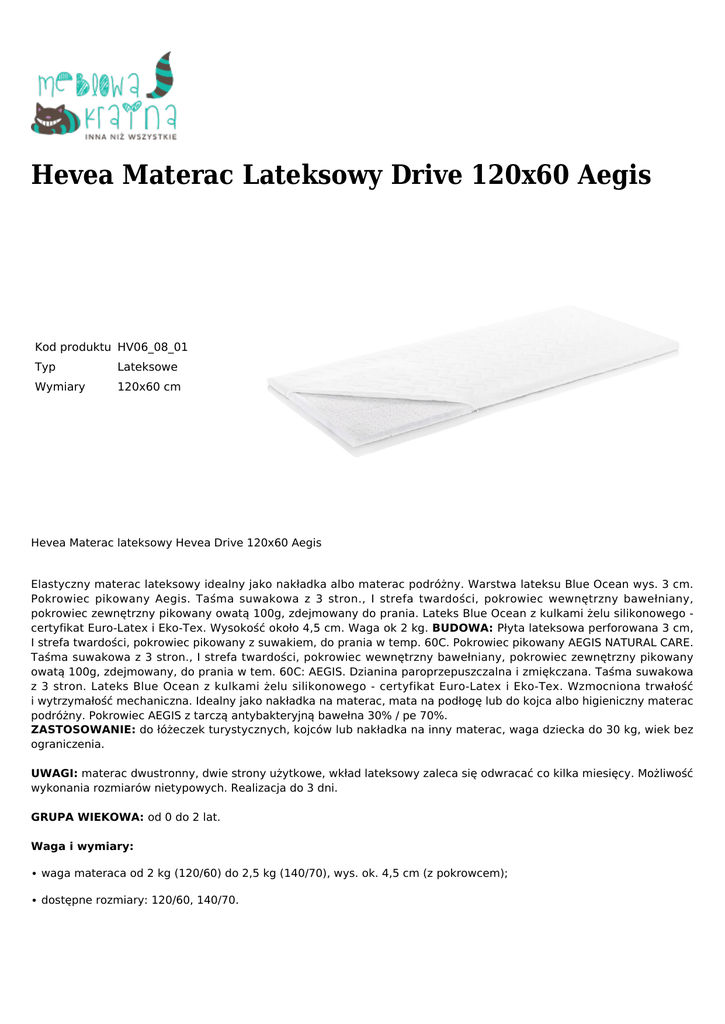 Hevea Materac Lateksowy Drive 120x60 Aegis Kod produktu HV06_08_01 Typ Lateksowe Wymiary 120x60 cm Hevea Materac lateksowy Hevea Drive 120x60 Aegis Elastyczny materac lateksowy idealny jako nakładka albo materac podróżny. Warstwa lateksu Blue Ocean wys. 3 cm. Pokrowiec pikowany Aegis. Taśma suwakowa z 3 stron., I strefa twardości, pokrowiec wewnętrzny bawełniany, pokrowiec zewnętrzny pikowany owatą 100g, zdejmowany do prania. Lateks Blue Ocean z kulkami żelu silikonowego certyfikat Euro-Latex i Eko-Tex. Wysokość około 4,5 cm. Waga ok 2 kg. BUDOWA: Płyta lateksowa perforowana 3 cm, I strefa twardości, pokrowiec pikowany z suwakiem, do prania w temp. 60C. Pokrowiec pikowany AEGIS NATURAL CARE. Taśma suwakowa z 3 stron., I strefa twardości, pokrowiec wewnętrzny bawełniany, pokrowiec zewnętrzny pikowany owatą 100g, zdejmowany, do prania w tem. 60C: AEGIS. Dzianina paroprzepuszczalna i zmiękczana. Taśma suwakowa z 3 stron. Lateks Blue Ocean z kulkami żelu silikonowego - certyfikat Euro-Latex i Eko-Tex. Wzmocniona trwałość i wytrzymałość mechaniczna. Idealny jako nakładka na materac, mata na podłogę lub do kojca albo higieniczny materac podróżny. Pokrowiec AEGIS z tarczą antybakteryjną bawełna 30% / pe 70%. ZASTOSOWANIE: do łóżeczek turystycznych, kojców lub nakładka na inny materac, waga dziecka do 30 kg, wiek bez ograniczenia. UWAGI: materac dwustronny, dwie strony użytkowe, wkład lateksowy zaleca się odwracać co kilka miesięcy. Możliwość wykonania rozmiarów nietypowych. Realizacja do 3 dni. GRUPA WIEKOWA: od 0 do 2 lat. Waga i wymiary: ∙ waga materaca od 2 kg (120/60) do 2,5 kg (140/70), wys. ok. 4,5 cm (z pokrowcem); ∙ dostępne rozmiary: 120/60, 140/70. Czas oczekiwania: 1-3 dni robocze. Rodzaj pokrowca: Aegis. Gwarancja: 24 miesiące.