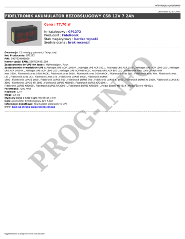 Informacje o produkcie Utworzono 02-03-2017 FIDELTRONIK AKUMULATOR BEZOBSŁUGOWY CSB 12V 7 2Ah Cena : 77,70 zł Nr katalogowy : GP1272 Producent : Fideltonik Stan magazynowy : bardzo wysoki Średnia ocena : brak recenzji PR O G -I N FO Gwarancja: 12 miesięcy gwarancji fabrycznej Kod Producenta: GP1272 P/N:: 5907524091000 Numer części EAN:: 5907524091000 Zastosowanie do UPS-ów typu :: Wolnostojący , Rack Zastosowanie w modelach UPS :: ActiveJet UPS ACP 1000VA , ActiveJet UPS ACP 1021 , ActiveJet UPS ACP 1100 , ActiveJet UPS ACP 1200 LCD , ActiveJet UPS ACP 1400VA , ActiveJet UPS ACP 1600 LCD , ActiveJet UPS ACP 650 LCD , ActiveJet UPS ACP 850 LCD , Fideltronik Ares 1000 , Fideltronik Ares 1600 , Fideltronik Ares 1600 RACK , Fideltronik Ares 3000 , Fideltronik Ares 3000 RACK , Fideltronik Ares 500 , Fideltronik Ares 700 , Fideltronik Ares LT1 , Fideltronik Ares LT2 , Fideltronik Ares LT3 , Fideltronik LUPUS 1000 , Fideltronik LUPUS 1500 , Fideltronik LUPUS 1600 , Fideltronik LUPUS 500 , Fideltronik LUPUS 700 , Fideltronik LUPUS KI 1000 , Fideltronik LUPUS KI 2000 , Fideltronik LUPUS KI 3000 , Fideltronik LUPUS KR 1000 , Fideltronik LUPUS KR2000 , Fideltronik LUPUS KR2000-J , Fideltronik LUPUS KR3000 , Fideltronik LUPUS KR3000-J , Fideltronik LUPUS KR6000-J , Moduł Baterii MB4814 , Moduł Baterii MB4821 Pojemność: 7200 mAh Napięcie: 12 V Waga: 2,5 kg Wymiary (wys x szer x gł): 94x65x151 mm Opis: akumulator bezobsługowy 12V 7,2Ah Informacje dodatkowe: Akumulator stosowany w UPS www: Link na stronę opisu technicznego Wygenerowano w programie www.oscGold.com
