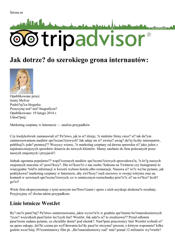 Strona nr Jak dotrze? do szerokiego grona internautów: Opublikowane przez: Jenny McIver Podró?uj?ca blogerka Przeczytaj not? not? biograficzn? Opublikowano: 19 lutego 2014 r. Udost?pnij: Marketing szeptany w Internecie — analiza przypadków Czy kiedykolwiek zastanawiali si? Pa?stwo, jak to si? dzieje, ?e niektóre firmy ciesz? si? tak du?ym zainteresowaniem mediów spo?eczno?ciowych? Jak udaje im si? zwróci? uwag? du?ej liczby internautów, publikuj?c jedn? promocj?? Wszyscy wiemy, ?e marketing szeptany od dawna sprawdza si? jako jeden z najskuteczniejszych sposobów dotarcia do nowych klientów. Mamy zaufanie do firm polecanych przez naszych znajomych i przyjació?. Jednak ogromna popularno?? wspó?czesnych mediów spo?eczno?ciowych spowodowa?a, ?e kr?g naszych znajomych znacznie si? powi?kszy?. Dla wi?kszo?ci z nas osoba ?ledzona na Twitterze czy Instagramie to wiarygodne ?ród?o informacji w kwestii wyboru hotelu albo restauracji. Nasuwa si? wi?c wa?ne pytanie, jak praktykowa? marketing szeptany w Internecie, aby zwi?kszy? ruch sieciowy w swojej witrynie oraz na kontach w serwisach spo?eczno?ciowych, co w ostatecznym rozrachunku prze?o?y si? na wi?ksz? liczb? go?ci? Wiele firm eksperymentuje z tymi nowymi mo?liwo?ciami i sporo z nich uzyskuje doskona?e rezultaty. Przyjrzyjmy si? dwóm takim przypadkom. Linie lotnicze WestJet By? mo?e pami?taj? Pa?stwo zainteresowanie, jakie wywo?a?o w grudniu spe?nienie bo?onarodzeniowych ?ycze? wszystkich pasa?erów lec?cych lini? WestJet. Jak uda?o si? to zrealizowa?? Przed odlotem pasa?erom zadano pytanie, co chcieliby dosta? pod choink?. Nast?pnie pracownicy linii WestJet wybrali si? na spore zakupy, dzi?ki czemu po wyl?dowaniu ka?dy pasa?er otrzyma? prezent, o którym wspomnia? kilka godzin wcze?niej. Pi?ciominutowy film pt. „Bo?onarodzeniowy cud” mia? ponad 12 milionów wy?wietle? w ci?gu 3 dni. Zosta? te? udost?pniony niezliczon? ilo?? razy w ró?nych serwisach. Dlaczego? Poniewa? pomys? by? wyj?tkowy, a film wzbudza? bardzo pozytywne emocje oraz by? w ?atwym do udost?pnienia formacie. Trudno by?o uwierzy?, ?e pracownikom linii WestJet uda?o si? zrealizowa? ten projekt, co dodatkowo zwi?kszy?o liczb? osób udost?pniaj?cych ten film. Za rozmiar sukcesu prawdopodobnie odpowiada równie? naturalna w trakcie ?wi?t ch?? ludzi do dzielenia si? pozytywnymi wiadomo?ciami. Linie lotnicze Delta Przyk?ad linii WestJet spodoba? si? sporej liczbie osób, natomiast inna firma osi?gn??a sukces, realizuj?c projekt skierowany do precyzyjnie okre?lonej grupy odbiorców. W zesz?ym roku linia lotnicza Delta (we wspó?pracy z firm? Porsche) bez rozg?osu uruchomi?a ekskluzywny program „Radosna niespodzianka”. W ramach programu najwa?niejsi klienci, których podró? wi??e si? z mi?dzyl?dowaniem i tym samym maj? niewiele czasu na dotarcie do bramki odlotów, byli do niej zawo?eni samochodem marki Porshe z logo linii Delta. Cho? program nigdy nie by?o reklamowany, wiem o nim prawie od samego pocz?tku. Sk?d? Mieszkam w Atlancie i cz?sto podró?uj? w interesach, wi?c mam status elitarnego klienta linii Delta. Wielu moich przyjació? i wspó?pracowników równie? cieszy si? podobnym statusem. Ju? kilka dni po uruchomieniu programu na Facebooku i Twitterze zacz??y si? pojawia? wpisy na ten temat. Niektórzy z moich znajomych opublikowali zdj?cia, na których stoj? na pasie ko?owania z l?ni?cym Porshe w tle i szerokim u?miechem na twarzy. Kilka miesi?cy pó?niej przysz?a kolej na mnie — oprócz zdj?? opublikowanych we wszystkich serwisach spo?eczno?ciowych, na moim blogu pojawi? si? tak?e wpis na ten temat. Pracownicy linii Delta zawsze ch?tnie robi? zdj?cia pasa?erów na tle samochodu, dzi?ki czemu daj? im mo?liwo?? podzielenia si? ze znajomymi tym, co ich spotka?o. Dla mnie ten program jest genialny. Po pierwsze wa?ni dla firmy klienci czuj? si? wyj?tkowi i docenieni. Po drugie wszyscy znajomi na Facebooku i osoby ?ledz?ce dany profil, którzy zobacz? to zdj?cie, zapragn? uzyska? taki sam status wa?nego klienta, aby prze?y? to na w?asnej skórze. Nie wspominaj?c o tym, ?e koszt ponoszony przez lini? lotnicz? jest niewielki, poniewa? to firma Porsche dostarcza pojazdy. (Czy ci elitarni klienci mogliby by? potencjalnymi klientami firmy Porsche?) Sam program zyska? du?y i pozytywny odd?wi?k w?ród najlepszych klientów linii Delta. Marketing szeptany w Internecie Oto kilka porad dotycz?cych praktykowania marketingu szeptanego w Internecie: 1. Informacja, któr? maj? udost?pnia? mi?dzy sob? internauci, MUSI by? niecodzienna. Bo?onarodzeniowe prezenty oczekuj?ce na podró?nych na ta?mie baga?owej to niecodzienna sytuacja. Porsche czekaj?ce na pasa?era obok samolotu to co? niezwyk?ego. Kluczowym elementem jest przygotowanie czego?, czym ch?tnie b?d? si? dzieli? klienci. 2. Informacja musi by? zaprezentowana w formie ?atwej do udost?pnienia. Pomys? to jedno (na przyk?ad film w serwisie YouTube), jednak trzeba te? zadba? o to, aby do jego udost?pnienia wystarczy?o jedno klikni?cie ikony serwisu Twitter albo Facebook. 3. Warto utworzy? hasztag. Dobrym przyk?adem jest hasztag #spglife opracowany przez sie? Starwood, która zach?ca go?ci do oznaczania nim zdj?? wykonanych w ró?nych hotelach sieci Starwood na ca?ym ?wiecie. Trudno zosta? zauwa?onym w wirtualnym ?wiecie, który jest prze?adowany informacjami. Jednak zrozumienie zagadnie?, które le?? u podstawy sukcesu programów linii lotniczych WestJet i Delta, mo?e si? okaza? pomocne w tworzeniu w?asnych, oryginalnych kampanii marketingowych w wirtualnym ?wiecie. Informacje o stronie TripAdvisor TripAdvisor® to najwi?ksza na ?wiecie strona turystyczna**, która pozwala podró?nym w pe?ni wykorzysta? ka?d? podró?. Mo?na na niej znale?? sprawdzone porady milionów podró?nych, szeroki wachlarz us?ug u?atwiaj?cych planowanie wyjazdu, a tak?e zintegrowane narz?dzia pozwalaj?ce dokonywa? rezerwacji i przeszukiwa? setki witryn w celu znalezienia najlepszych cen obowi?zuj?cych w hotelach. Witryny wspó?pracuj?ce ze stron