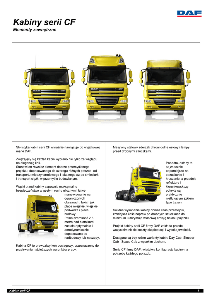 Kabiny serii CF Elementy zewnętrzne Stylistyka kabin serii CF wyraźnie nawiązuje do wyjątkowej marki DAF. Zwężający się kształt kabin wybrano nie tylko ze względu na elegancję linii. Stanowi on również element dobrze przemyślanego projektu, dopasowanego do szeregu różnych potrzeb, od transportu międzynarodowego i lokalnego aż po śmieciarki i transport ciężki w przemyśle budowlanym. Wąski przód kabiny zapewnia maksymalne bezpieczeństwo w gęstym ruchu ulicznym i łatwe manewrowanie na ograniczonych obszarach, takich jak place miejskie, wiejskie podwórza i place budowy. Pełna szerokość 2,5 metra nad błotnikami została optymalnie i aerodynamicznie dopasowana do nadbudowy lub naczepy. Kabina CF to prawdziwy koń pociągowy, przeznaczony do przetrwania najcięższych warunków pracy. Kabiny serii CF Masywny stalowy zderzak chroni dolne osłony i lampy przed drobnymi stłuczkami. Ponadto, osłony te są znacznie odporniejsze na strzaskanie i kruszenie, a przednie reflektory i kierunkowskazy pokryte są praktycznie nietłukącym szkłem typu Lexan. Solidne wykonanie kabiny obniża czas przestojów, zmniejsza ilość napraw po drobnych stłuczkach do minimum i utrzymuje właściwą emisję hałasu pojazdu. Projekt kabiny serii CF firmy DAF zakłada przede wszystkim niskie koszty eksploatacji i wysoką trwałość. Dostępne są trzy różne warianty kabin: Day Cab, Sleeper Cab i Space Cab z wysokim dachem. Seria CF firmy DAF: właściwa konfiguracja kabiny na potrzeby każdego pojazdu. 1 Kabiny serii CF Wymiary Wysokość stopnia kabiny Day Cab oraz Sleeper Cab odnosi się do serii CF65 i CF75. Wysokość stopnia kabiny Space Cab odnosi się do serii CF85. Kabiny serii CF 2 Kabiny serii CF Wnętrze Stworzenie wnętrza kabiny przeznaczonej do szerokiego zakresu całkowicie odmiennych zastosowań jest jednym z najtrudniejszych zadań, jakie mogą sobie postawić projektanci. Z jednej strony powinna ona oferować luksusowy wystrój i komfort najwyższej klasy, a z drugiej, musi zachować standard jakości w wyglądzie nawet po latach intensywnej eksploatacji i częstego mycia. To właśnie jest zagadnienie, w którym uważny dobór materiałów i kolorystyki stanowi sprawę najwyższej wagi. regulowaną kierownicą obitą miękkim materiałem natychmiast poczujesz się jak w domu. Wszystkie elementy sterujące na desce rozdzielczej mającej kształt kokpitu są przystępnie rozmieszczone i łatwo dostępne w czasie jazdy. Wydajne ogrzewanie, wentylacja oraz izolacja zapewniają komfort i ciszę podczas przebywania w kabinie. Doskonała widoczność z wnętrza dopełnia poczucia bezpieczeństwa i spokoju w czasie jazdy. Wystarczy wsiąść do kabiny, aby od razu przekonać się o wszechstronności jej udanej konstrukcji. Nisko umieszczona podłoga kabiny ułatwia częste wchodzenie i wychodzenie, podczas gdy płaska komora silnika umożliwia swobodne poruszanie się po kabinie. Szerokość wnętrza w kabinie Day Cab umożliwia wstawienie trzeciego fotela bez naruszenia komfortu jazdy. Utrzymująca wysoki standard wewnętrzna wysokość, zarówno dla normalnych dachów (1,60 m), jak i w wersji z podwyższonym dachem (2,23 m), pogłębia ogólne wrażenie przestrzeni. Przestronne schowki znajdują się nad szybą przednią, na komorze silnika i w desce rozdzielczej. Wersja kabiny sypialnej oferuje przestronne schowki pod dolną leżanką, wliczając w to hermetyczną skrzynkę (dostępna tylko z zewnątrz kabiny), a nawet lodówkę (opcjonalnie). W komfortowym fotelu, za Kabiny serii CF Standardowe wyposażenie mieszkalne w postaci tradycyjnego jednoczęściowego materaca firmy DAF o długości 2 m idealnie nadaje się na długie podróże. Opcjonalny materac Xtra Comfort o grubości 150 mm ze sprężynami w osłonach zapewnia kierowcy najlepszy komfort spania. 3 Kabiny serii CF Specyfikacyjna Elementy zewnętrzne / Elementy wnętrza / Wyposażenie opcjonalne Elementy zewnętrzne: Mechaniczne zawieszenie kabiny Podgrzewane lusterka Lusterko przednie Reflektory halogenowe z kloszami ze szkła Lexan System przeciwkradzieżowy Stalowy zderzak Elementy wnętrza: Elektrycznie sterowane szyby System alarmowy Dolna leżanka Złącze akcesoriów Schowki Wyposażenie opcjonalne: Pneumatyczne zawieszenie kabiny Reflektory ksenonowe Światła typu kombi w zderzaku Świetliki Górna leżanka Materac dolnej leżanki Xtra Comfort ze sprężynami w osłonach Trzeci fotel Poduszka powietrzna po stronie kierowcy oraz napinacze pasów bezpieczeństwa Zintegrowany zestaw głośnomówiący Dodatkowa nagrzewnica / programator Klimatyzacja / automatyczna regulacja temperatury Lodówka Osłona przeciwsłoneczna Schowek na komorze silnika Aluminiowe lub drewnopodobne wykończenie tablicy rozdzielczej Zestaw audio Day Cab Sleeper Cab Space Cab ● ● ● ● ● ● ● ● ● ● ● ● ● ● ● ● ● ● ● ● ● 130 litrów ● ● ● ● 380 litrów ● ● ● ● 900 litrów ● ● ● - ● ● ● ● ● ● ● ● ● ● ● ● ● ● ● ● ● ● ● ● ● ● ● ● ● ● ● ● ● ● ● ● ● ● ● ● ● Możliwość wyposażenia pojazdu w określoną funkcję dodatkową zależy od jego konfiguracji. Dostępność oraz parametry techniczne mogą się różnić w zależności od kraju. Aby uzyskać więcej informacji, prosimy o kontakt z firmą DAF. Powyższe informacje mogą ulec zmianie bez powiadomienia. Kabiny serii CF 4 Kabiny serii CF Informacje ogólne Bezpieczeństwo aktywne Układy bezpieczeństwa aktywnego, w które wyposażone zostały pojazdy DAF CF, zmniejszają ryzyko wypadku lub obrażeń pasażerów poprzez optymalizację warunków pracy kierowcy oraz zapewnienie większej kontroli nad pojazdem w nieoczekiwanych sytuacjach drogowych. Prawdopodobieństwo wypadku jest dużo mniejsze, gdy kierowca zachowuje czujność i prowadzi pojazd w komfortowych warunkach. Dobra izolacja kabiny zmniejsza hałas i zapobiega zmęczeniu kierowcy. Kole
