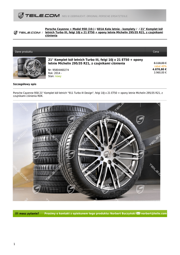 Porsche Cayenne > Model 958 (10-) / 601A Koła letnie - komplety / / 21" Komplet kół letnich Turbo III, felgi 10J x 21 ET50 + opony letnie Michelin 295/35 R21, z czujnikami ciśnienia Dane produktu Cena 21" Komplet kół letnich Turbo III, felgi 10J x 21 ET50 + opony letnie Michelin 295/35 R21, z czujnikami ciśnienia Nr: 95804460274 Rok: 2014 Stan: nowy 8.118,00 € rabat 40% 4.870,80 € 3.960,00 € Szczegółowy opis Porsche Cayenne 958 21" Komplet kół letnich "911 Turbo III Design", felgi 10J x 21 ET50 + opony letnie Michelin 295/35 R21, z czujnikami ciśnienia RDK. masz pytanie? 1 Prosimy o kontakt z opiekunem tego produktu: Norbert Buczyński [email protected] 2