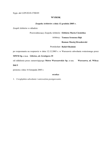 Sygn. akt UZP/ZO/0-3700/05 WYROK Zespołu Arbitrów z dnia 12 grudnia 2005 r. Zespół Arbitrów w składzie: Przewodniczący Zespołu Arbitrów Elżbieta Maria Ciesielska Arbitrzy: Tomasz Ireneusz Bąk Roman Maciej Drozdowski Protokolant Rafał Oksiński po rozpoznaniu na rozprawie w dniu 12.12.2005 r. w Warszawie odwołania wniesionego przez MWM Sp. z o.o. Gliwice, ul. Grottgera 35 od oddalenia przez zamawiającego Metro Warszawskie Sp. z o.o. Dół 5 protestu z dnia 16 listopada 2005 r. orzeka: 1. Uwzględnia odwołanie i unieważnia postępowanie. Warszawa, ul. Wilczy 2. Kosztami postępowania obciąża Metro Warszawskie Sp. z o.o. Warszawa, ul. Wilczy Dół 5 i nakazuje: 1) zaliczyć na rzecz Urzędu Zamówień Publicznych koszty w wysokości 3 298 zł 59 gr (słownie: trzy tysiące dwieście dziewięćdziesiąt osiem złotych pięćdziesiąt dziewięć groszy) z kwoty wpisu uiszczonego przez MWM Sp. z o.o. Gliwice, ul. Grottgera 35 2) dokonać wpłaty kwoty 4 978 zł 59 gr (słownie: cztery tysiące dziewięćset siedemdziesiąt osiem złotych pięćdziesiąt dziewięć groszy) przez Metro Warszawskie Sp. z o.o. Warszawa, ul. Wilczy Dół 5 na rzecz MWM Sp. z o.o. Gliwice, ul. Grottgera 35 3) dokonać wpłaty kwoty 0 zł 00 gr (słownie: xxx) przez xxx na rzecz Urzędu Zamówień Publicznych na rachunek środków specjalnych UZP 4) dokonać zwrotu kwoty 1 375 zł 41 gr (słownie: jeden tysiąc trzysta siedemdziesiąt pięć złotych czterdzieści jeden groszy) z rachunku środków specjalnych Urzędu Zamówień Publicznych na rzecz MWM Sp. z o.o. Gliwice, ul. Grottgera 35 . 3. Uzasadnienie Firma MWM Sp. z o.o. z siedzibą w Gliwicach oprotestowała czynność odrzucenia jej oferty w postępowaniu o zamówienie publiczne, prowadzonym w trybie przetargu nieograniczonego przez Zamawiającego Metro Warszawskie Sp. z o.o. z siedzibą w Warszawie Strona 2 z 7 na rozbudowę systemu telewizji przemysłowej w I linii metra w Warszawie o stację A19 oraz budowę systemu łączności interkomowej na stacji A19. Protestujący zarzucił Zamawiającemu naruszenie art. 89 ust. 1 pkt 2 ustawy - Prawo zamówień publicznych poprzez odrzucenie jego oferty z powodu nie uzgodnienia przedstawionego w ofercie harmonogramu rzeczowo-finansowego z generalnym wykonawcą stacji A19 oraz w konsekwencji wybór oferty Przedsiębiorstwo INS-TOM Sp. z o.o. jako najkorzystniejszej. Protestujący zarzuca Zamawiającemu bezzasadne przyjęcie, że harmonogram rzeczowofinansowy, który należało dołączyć do oferty musiał być na etapie przygotowywania oferty uzgodniony z kimkolwiek. Zdaniem Protestującego, ani sposób przygotowania oferty opisany w SIWZ ani załączony do SIWZ program funkcjonalno-użytkowy nie wymagał tego, lecz wykonawcy mieli dołączyć do oferty harmonogram rzeczowo-finansowy, który należy odróżnić od harmonogramu (bez części finansowej), który należało uzgodnić już po zawarciu umowy na etapie wykonania robót. Przyjęcie, że harmonogram rzeczowo-finansowy musi być uzgodniony przed złożeniem oferty, należałoby, zdaniem Protestującego, uznać za niezgodne z ustawą Prawo zamówień publicznych. Uzależnienie ważności oferty od uzgodnień z osobą trzecią jest sprzeczne z ustawą, bo harmonogram taki zawiera składniki ceny, a termin wykonania zamówienia jest z góry określony przez Zamawiającego w SIWZ. Protestujący żądał powtórzenia badania i oceny ofert. Zamawiający oddalił protest twierdząc, że program funkcjonalno-użytkowy stanowiący integralną część SIWZ wymagał uzgodnienia harmonogramu rzeczowo-finansowego bez części finansowej przed złożeniem oferty, ponieważ jest on elementem oferty, a następnie staje się on integralną częścią umowy. Od powyższego rozstrzygnięcia Protestujący wniósł odwołanie, w którym podtrzymał zarzuty oraz żądania zawarte w proteście. Odwołujący ustosunkowując się do rozstrzygnięcia Strona 3 z 7 protestu podnosi, że z programu funkcjonalno-użytkowego nie wynika ani nakaz uzgodnienia harmonogramu przed złożeniem oferty, ani termin, ani forma tego uzgodnienia, ani kto ze strony Generalnego Wykonawcy jest upoważniony do dokonania uzgodnień. Odwołujący podnosi, że nałożenie takiego obowiązku w SIWZ skutkowałoby wadą postępowania uniemożliwiającą zawarcie ważnej umowy, ponieważ naruszałoby podstawowe zasady udzielania zamówień tj. ujawniałoby treść ofert przed ich otwarciem, zasadę bezstronności, równego traktowania wykonawców, zakaz opisywania przedmiotu zamówienia w sposób utrudniający uczciwą konkurencję i świadczyłoby, o tym że przedmiot zamówienia opisany jest niejednoznacznie. Zespół Arbitrów ustalił i zważył, co następuje: Odwołanie zasługuje na uwzględnienie. W pkt 2.2 programu funkcjonalno-użytkowego stanowiącego załącznik do SIWZ Zamawiający określił „Wymagania do wykonania i odbioru”. W Pkt 2.2.1 dotyczącym harmonogramu wykonania przedmiotu zamówienia określono, że prace związane z wykonaniem umowy muszą być realizowane w uzgodnienieu z Generalnym Wykonawcą stacji A19 Warbud S.A., który jest koordynatorem realizacji prac nad systemem. Zamawiający załączył do programu funkcjonalno-użytkowego wzór harmonogramu rzeczowofinansowego w postaci minimalnej i wymagał aby harmonogram, bez części finansowej był „uzgadniany” przez wykonawcę z Generalnym Wykonawcą stacji A19. Nie określono terminu (czy też terminów) tzw. uzgodniania harmonogramu, lecz określono, że jest on elementem oferty, a następnie integralną częścią umowy. We wzorze umowy załączonym do SIWZ określono 2 terminy końcowe: 1) na wykonanie projektu wykonawczego - 60 dni od daty zawarcia umowy, 2) na wykonanie wszystkich robót obejmujących przedmiot zamówienia i podpisanie końcowego protokołu odbioru przedmiotu zamówienia - 15 września 2006r. Wzór umowy wymienia w § 7 załączniki, które stanowią integralną część umowy i nie 