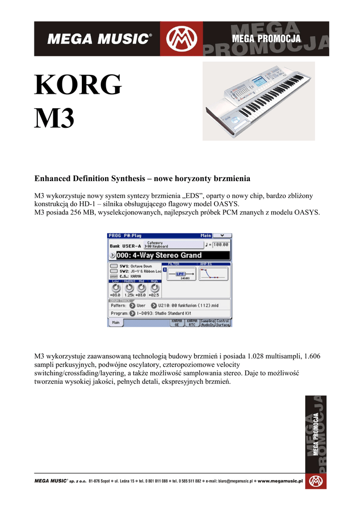KORG M3 Enhanced Definition Synthesis – nowe horyzonty brzmienia M3 wykorzystuje nowy system syntezy brzmienia „EDS”, oparty o nowy chip, bardzo zbliŜony konstrukcją do HD-1 – silnika obsługującego flagowy model OASYS. M3 posiada 256 MB, wyselekcjonowanych, najlepszych próbek PCM znanych z modelu OASYS. M3 wykorzystuje zaawansowaną technologią budowy brzmień i posiada 1.028 multisampli, 1.606 sampli perkusyjnych, podwójne oscylatory, czteropoziomowe velocity switching/crossfading/layering, a takŜe moŜliwość samplowania stereo. Daje to moŜliwość tworzenia wysokiej jakości, pełnych detali, ekspresyjnych brzmień. Sekcja filtrów, która jest istotną częścią procesu tworzenia brzmienia, pozwala na jednoczesne uŜycie dwóch filtrów rezonacyjnych dla kaŜdego z oscylatorów. Dostępne są cztery rodzaje filtrów: dolnoprzepustowy, górnoprzepustowy, pasmowoprzepustowy i pasmowozaporowy. Sekcja amp pozwala nadać brzmieniu indywidualnego charakteru i dynamiki. 3-pasmowy equalizer precyzyjnie dostosuje brzmienie do kaŜdych potrzeb, bez konieczności przechodzenia do sekcji efektów. Rozbudowane generatory obwiedni, a takŜe nowe zaawansowane miksery AMS dostarczają moŜliwości, które dotąd były nieosiągalne. Efekty Sekcja efektów pozwala na jednoczesne uŜycie, aŜ pięciu efektów Insert, dwóch efektów Master i jednego efektu Total. W dodatku do świetnie brzmiących efektów chorus, flanger, phaser, delay i reverb, M3 posiada 170 róŜnych rodzajów efektów, włączając kompresory, limitery, symulacje wzmacniaczy, symulacje kolumn głośnikowych, a takŜe nowe efekty Gain Shifter i Talking Modulator. Wszystkie efekty bazują na opatentowanej przez firmę KORG technologii modelowania „REMS”. M3 posiada wiele nowoczesnych, profesjonalnych rozwiązań. Dual Common LFO pozwala, aby wiele efektów korzystało z tego samego źródła modulacji. Wejścia audio mogą być dowolnie wysyłane do łańcuchów efektów i 4 niezaleŜnych wyjść. Funky Drummer Zestawy perkusyjne M3 mogą być tworzone z próbek ROM, lub RAM, monofonicznych i stereofonicznych. Niezwykłego realizmu dostarczą funkcje velocity switching (przełączanie próbek za pomocą zmian dynamicznych), a takŜe cross-fading (płynne zmiany pomiędzy próbkami. UŜytkownik ma kontrolę nad kaŜdym dźwiękiem, dla którego moŜe indywidualnie ustawiać EQ, podbijać/osłabiać poszczególne częstotliwości i ustawiać efekty insert. Nowa funkcja – Drum Track M3 posiada nową funkcję Drum Track, dodającą rytm do kaŜdego dźwięku, który zagrasz. Ta funkcja w połączeniu z modułem KARMA, czynią Program kompletnym, wielopoziomowym brzmieniem. MoŜesz wybierać spośród ponad 500 gotowych patternów i włączać je dedykowanym klawiszem. Dzięki temu, Ŝe Drum Track wykorzystuje dane MIDI zapisane w patternie, dane te w łatwy sposób moŜna kopiować do trybu sequencer i wykorzystywać jako gotowe ścieŜki perkusyjne. Ponadto dane MIDI mogą być importowane z plików SMF, a ścieŜki nagrane z wykorzystaniem modułu KARMA, mogą być konwertowane do zdarzeń MIDI, co umoŜliwia dalszą ich obróbkę. Rozszerzony tryb Combination W trybie Combination uŜytkownik moŜe dowolnie łączyć wiele brzmień, tworzyć punkty podziału klawiatury, uŜywać funkcji velocity switching i cross-fading. Brzmienia monofoniczne mogą być zmieniane w polifoniczne i odwrotnie, jeśli chcesz moŜesz uŜywać tylko jednego oscylatora. Twórców muzyki współczesnej ucieszy fakt, Ŝe kaŜdy z głosów moŜe posiadać inną skalę i strój! M3 pozwala na odtwarzanie szesnastu głosów w tym samym czasie, włączając Drum Track, do czterech modułów KARMA, efekty itd. KaŜdy z głosów posiada 3 pasmowy equalizer, a takŜe ustawienia Tone Adjust pozwalające na lepsze „zatopienie” głosu w miksie. Wspaniałe brzmienie Wielka technologia byłaby niczym, gdyby nie dźwięk, którym kieruje. M3 nie zawiedzie nikogo, kto szuka doskonałych brzmień. M3 posiada 512 fabrycznych programów i 1664 miejsca w pamięci na programy uŜytkownika (13 banków plus bank GM). Wszystkie brzmienia moŜna dowolnie przenosić do kaŜdego z banków (za wyjątkiem GM). Dodając opcjonalną kartę EXB-RADIAS, uzyskuje się 128 nowych syntetycznych barw. M3 posiada 32 zestawy perkusyjne , 384 fabryczne kombinacje brzmień i miejsce na 1792 kombinacje uŜytkownika. Wszystkie brzmienia (programy i kombinacje) posegregowane są na kategorie i podkategorie, co znacznie ułatwia wyszukiwanie. KARMA drugiej generacji M3 posiada moduł KARMA drugiej generacji, po raz pierwszy uŜyty we flagowym modelu OASYS. KARMA, jest inteligentnym generatorem fraz muzycznych, który w odróŜnieniu od arpeggiatora potrafi tworzyć frazy i zagrywki charakterystyczne dla danych instrumentów. UŜycie KARMY pozwala na tworzenie np. arpeggia gitarowego, slidów basowych, skomplikowanych układów rytmicznych i wielu innych zagrywek, których wykonanie nie byłoby moŜliwe na tradycyjnej klawiaturze. Patterny modułu KARMA moŜna dowolnie przypisywać do wszystkich brzmień. UŜytkownik ma pełną kontrolę nad wszystkimi parametrami KARMY dzięki ośmiu suwakom, przełącznikom, klawiszom scen itd. PotęŜna siła ekspresji M3 to nie tylko nowe brzmienie, ale takŜe całkiem nowe środowisko kontroli. Kolorowy, dotykowy ekran LCD ułatwia intuicyjną kontrolę nad instrumentem. Jest to cecha znana z wcześniejszych instrumentów KORG. Ekran M3 posiada jednak nową funkcję i moŜe pracować jako dotykowy Pad X-Y, który pozwala na wprowadzanie danych w taki sam sposób, jak w efekcie KAOSS Pad. Ruchy palców na ekranie powodują zmianę parametrów w czasie rzeczywistym, a ekran w tym samym czasie reaguje zmieniając kolory. M3 posiada osiem dynamicznych padów, które w doskonały sposób nadają się do odtwarzania instrumentów perkusyjnych, lub uruchamiania loopów. M3 posiada takŜe joystick, suwaki, których funkcje moŜna dowolnie prz