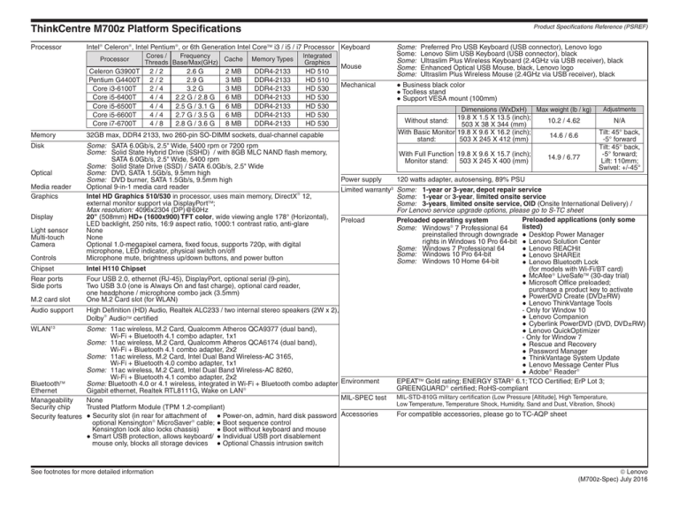 ThinkCentre M700z Platform Specifications Processor Product Specifications Reference (PSREF) Intel Celeron, Intel Pentium, or 6th Generation Intel Core™ i3 / i5 / i7 Processor Keyboard Processor Celeron G3900T Pentium G4400T Core i3-6100T Core i5-6400T Core i5-6500T Core i5-6600T Core i7-6700T Cores / Frequency Cache Threads Base/Max(GHz) 2/2 2/2 2/4 4/4 4/4 4/4 4/8 2.6 G 2.9 G 3.2 G 2.2 G / 2.8 G 2.5 G / 3.1 G 2.7 G / 3.5 G 2.8 G / 3.6 G 2 MB 3 MB 3 MB 6 MB 6 MB 6 MB 8 MB Memory Types Integrated Graphics DDR4-2133 DDR4-2133 DDR4-2133 DDR4-2133 DDR4-2133 DDR4-2133 DDR4-2133 HD 510 HD 510 HD 530 HD 530 HD 530 HD 530 HD 530 Memory 32GB max, DDR4 2133, two 260-pin SO-DIMM sockets, dual-channel capable Disk Some: SATA 6.0Gb/s, 2.5" Wide, 5400 rpm or 7200 rpm Some: Solid State Hybrid Drive (SSHD) / with 8GB MLC NAND flash memory, SATA 6.0Gb/s, 2.5" Wide, 5400 rpm Some: Solid State Drive (SSD) / SATA 6.0Gb/s, 2.5" Wide Some: DVD, SATA 1.5Gb/s, 9.5mm high Some: DVD burner, SATA 1.5Gb/s, 9.5mm high Optional 9-in-1 media card reader Intel HD Graphics 510/530 in processor, uses main memory, DirectX 12, external monitor support via DisplayPort; Max resolution: 4096x2304 (DP)@60Hz 20" (508mm) HD+ (1600x900) TFT color, wide viewing angle 178° (Horizontal), LED backlight, 250 nits, 16:9 aspect ratio, 1000:1 contrast ratio, anti-glare None None Optional 1.0-megapixel camera, fixed focus, supports 720p, with digital microphone, LED indicator, physical switch on/off Microphone mute, brightness up/down buttons, and power button Optical Media reader Graphics Mouse Mechanical Some: Preferred Pro USB Keyboard (USB connector), Lenovo logo Some: Lenovo Slim USB Keyboard (USB connector), black Some: Ultraslim Plus Wireless Keyboard (2.4GHz via USB receiver), black Some: Enhanced Optical USB Mouse, black, Lenovo logo Some: Ultraslim Plus Wireless Mouse (2.4GHz via USB receiver), black ● Business black color ● Toolless stand ● Support VESA mount (100mm) Dimensions (WxDxH) Max weight (lb / kg) 19.8 X 1.5 X 13.5 (inch); 10.2 / 4.62 503 X 38 X 344 (mm) With Basic Monitor 19.8 X 9.6 X 16.2 (inch); 14.6 / 6.6 stand: 503 X 245 X 412 (mm) Without stand: With Full Function 19.8 X 9.6 X 15.7 (inch); Monitor stand: 503 X 245 X 400 (mm) Power supply 14.9 / 6.77 Adjustments N/A Tilt: 45° back, -5° forward Tilt: 45° back, -5° forward; Lift: 110mm; Swivel: +/-45° 120 watts adapter, autosensing, 89% PSU Limited warranty3 Some: 1-year or 3-year, depot repair service Some: 1-year or 3-year, limited onsite service Some: 3-years, limited onsite service, OID (Onsite International Delivery) / For Lenovo service upgrade options, please go to S-TC sheet Display Preloaded applications (only some Preload Preloaded operating system listed) Some: Windows 7 Professional 64 Light sensor ● Desktop Power Manager preinstalled through downgrade Multi-touch rights in Windows 10 Pro 64-bit ● Lenovo Solution Center Camera ● Lenovo REACHit Some: Windows 7 Professional 64 Some: Windows 10 Pro 64-bit ● Lenovo SHAREit Controls Some: Windows 10 Home 64-bit ● Lenovo Bluetooth Lock Intel H110 Chipset Chipset (for models with Wi-Fi/BT card) ●McAfee LiveSafe (30-day trial) Rear ports Four USB 2.0, ethernet (RJ-45), DisplayPort, optional serial (9-pin), ● Microsoft Office preloaded; Side ports Two USB 3.0 (one is Always On and fast charge), optional card reader, purchase a product key to activate one headphone / microphone combo jack (3.5mm) ● PowerDVD Create (DVD±RW) M.2 card slot One M.2 Card slot (for WLAN) ● Lenovo ThinkVantage Tools - Only for Window 10 Audio support High Definition (HD) Audio, Realtek ALC233 / two internal stereo speakers (2W x 2), ● Lenovo Companion Dolby Audio certified ● Cyberlink PowerDVD (DVD, DVD±RW) Some: 11ac wireless, M.2 Card, Qualcomm Atheros QCA9377 (dual band), WLAN13 ● Lenovo QuickOptimizer Wi-Fi + Bluetooth 4.1 combo adapter, 1x1 - Only for Window 7 Some: 11ac wireless, M.2 Card, Qualcomm Atheros QCA6174 (dual band), ● Rescue and Recovery Wi-Fi + Bluetooth 4.1 combo adapter, 2x2 ● Password Manager Some: 11ac wireless, M.2 Card, Intel Dual Band Wireless-AC 3165, ● ThinkVantage System Update Wi-Fi + Bluetooth 4.0 combo adapter, 1x1 ● Lenovo Message Center Plus Some: 11ac wireless, M.2 Card, Intel Dual Band Wireless-AC 8260, ●Adobe Reader Wi-Fi + Bluetooth 4.1 combo adapter, 2x2 EPEAT Gold rating; ENERGY STAR 6.1; TCO Certified; ErP Lot 3; Bluetooth Some: Bluetooth 4.0 or 4.1 wireless, integrated in Wi-Fi + Bluetooth combo adapter Environment GREENGUARD certified; RoHS-compliant Ethernet Gigabit ethernet, Realtek RTL8111G, Wake on LAN MIL-STD-810G military certification (Low Pressure [Altitude], High Temperature, MIL-SPEC test Manageability None Low Temperature, Temperature Shock, Humidity, Sand and Dust, Vibration, Shock) Security chip Trusted Platform Module (TPM 1.2-compliant) Accessories For compatible accessories, please go to TC-AQP sheet Security features ● Security slot (in rear for attachment of ● Power-on, admin, hard disk password optional Kensington MicroSaver cable; ● Boot sequence control Kensington lock also locks chassis) ● Boot without keyboard and mouse ● Smart USB protection, allows keyboard/ ● Individual USB port disablement mouse only, blocks all storage devices ● Optional Chassis intrusion switch See footnotes for more detailed information Lenovo (M700z-Spec) July 2016