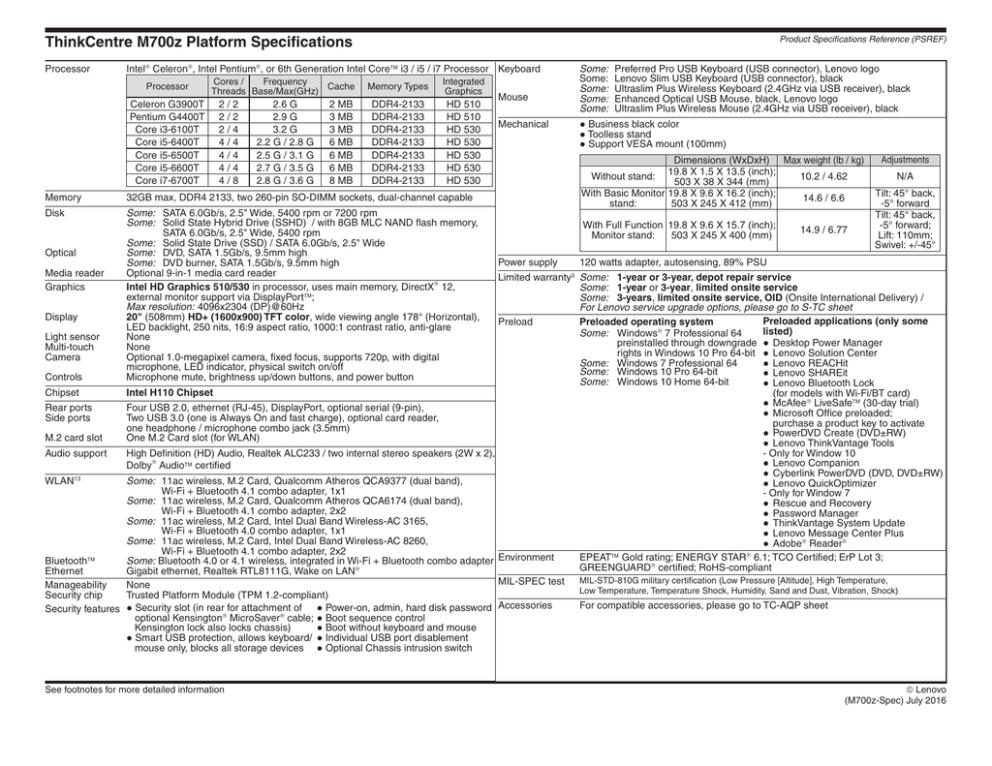 ThinkCentre M700z Platform Specifications - PSRef`s