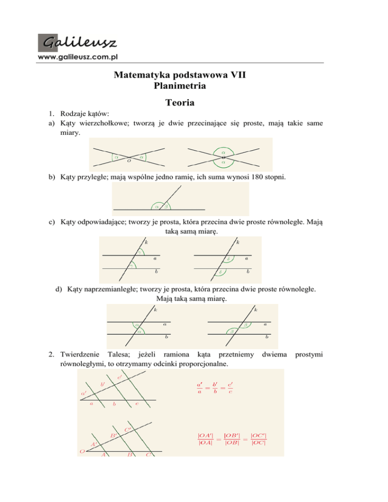Matematyka podstawowa VII Planimetria Teoria 1. Rodzaje kątów: a) Kąty wierzchołkowe; tworzą je dwie przecinające się proste, mają takie same miary. b) Kąty przyległe; mają wspólne jedno ramię, ich suma wynosi 180 stopni. c) Kąty odpowiadające; tworzy je prosta, która przecina dwie proste równoległe. Mają taką samą miarę. d) Kąty naprzemianległe; tworzy je prosta, która przecina dwie proste równoległe. Mają taką samą miarę. 2. Twierdzenie Talesa; jeżeli ramiona kąta przetniemy równoległymi, to otrzymamy odcinki proporcjonalne. dwiema prostymi 3. Oś symetrii figury; prosta względem której ta figura jest do siebie osiowo symetryczna. Oś symetrii dzieli figurę na dwie przystające części. 4. Symetralna odcinka; prosta prostopadła do danego odcinka, która dzieli go na dwie równe części. 5. Długość okręgu i pole koła; 6. Długość łuku i pole wycinka koła 7. Kąty w kręgu 8. Okrąg opisany na trójkącie 9. Okrąg wpisany w trójkąt 10. Wzajemne położenie prostej i okręgu 11. Trójkąt równoboczny 12. Kwadrat 13. Równoległobok 14. Romb Zadania wprowadzające: 1. Przyprostokątne trójkąta prostokątnego mają długości i . Oblicz długość przeciwprostokątnej. 2. Przyprostokątne trójkąta prostokątnego mają długości 6 i 8. Oblicz wysokość opuszczoną na przeciwprostokątną. 3. Środkowe w trójkącie równoramiennym mają długości 12, 12 i 3. Oblicz długości boków tego trójkąta. 4. Przyprostokątne trójkąta prostokątnego mają długości 6 i 8. Oblicz promień okręgu opisanego na tym trójkącie i promień okręgu wpisanego w ten trójkąt. 5. Przyprostokątne trójkąta prostokątnego mają długości i . Oblicz długości odcinków, na jakie wysokość opuszczona z wierzchołka kąta prostego podzieliła przeciwprostokątną. 6. Promień koła opisanego na kwadracie jest o 2 większy od promienia koła wpisanego w ten kwadrat. Oblicz sumę tych promieni. 7. Pole rombu wynosi 6, a jedna z przekątnych tego rombu ma długość 4. Oblicz długość boku i wysokość tego rombu. 8. W trapezie równoramiennym krótsza podstawa i wysokość mają długość 3, a długość przekątnej jest równa 5. Oblicz obwód i pole tego trapezu. 9. Oblicz pole równoległoboku o bokach 5 i 4 oraz kącie ostrym 45 10. Podaj miary kątów i . 11. Wyznacz miarę kąta . 12. Wyznacz długości odcinków i . 13. Oblicz obwód i pole koła o promieniu 3cm. 14. Oblicz średnicę okręgu o długości 6cm. 15. Oblicz obwód koła o średnicy równej 8cm. 16. Co ma większe pole: koło o promieniu 4cm, czy kwadrat o boku 7cm? 17. Na około trawnika w kształcie koła o średnicy d=10m biegnie ścieżka o szerokości 1m. Oblicz pole powierzchni ścieżki. 18. W okręgu o promieniu 4cm narysowano dwa promienie pod kątem 30 . Oblicz długość dwóch łuków, na które okrąg został podzielony. 19. W okręgu poprowadzono cięciwę o długości 6cm odległą od środka okręgu o 3cm. Oblicz długość łuków okręgu, na które dzieli ten okrąg cięciwa. 20. Kąt środkowy i wpisany są oparte na tym samym łuku. Suma ich miar jest równa 150 . Jaka jest miara kąta wpisanego i środkowego? 21. Ostrokątny trójkąt równoramienny ABC o podstawie AB wpisany jest w okrąg o środku S. Kąt ASB ma miarę 100 . Oblicz miary kątów trójkąta. 22. Ostrokątny trójkąt równoramienny ABC o podstawie AB jest wpisany w okrąg o środku S, przy czym kąt SAB ma miarę 40 . Oblicz miarę kąta CAB. 23. Oblicz promień okręgu wpisanego w trójkąt prostokątny o przyprostokątnych 4 i 3. 24. Oblicz promień okręgu wpisanego w trójkąt równoboczny, którego boki mają po 12cm. 25. Oblicz miary kątów w trójkącie, jeżeli ich wzajemny stosunek wynosi 3:2:4. 26. Trójkąt o bokach 2, 5, 6 jest podobny do trójkąta, którego najkrótszy bok wynosi 8cm. Oblicz długości pozostałych boków tego trójkąta. 27. Oblicz pole kwadratu wpisanego wpisanego w okrąg o promieniu 5cm. Zadania: 1. Dany jest równoległobok ABCD. Na przedłużeniu przekątnej AC, wybrano punkt E, tak, że (zobacz rysunek). Uzasadnij, że pole równoległoboku ABCD jest cztery razy większe od pola trójkąta DCE 2. Punkty A, B, C leżą na okręgu o środku S (zobacz rysunek). Miara zaznaczonego kąta wpisanego ACB jest równa a) 65˚ b) 100˚ c) 115˚ d) 130˚ 3. W trójkącie równoramiennym ABC dane są (zobaczy rysunek). Oblicz wysokość AD trójkąta opuszczoną z wierzchołka A na bok BC. 4. Długość boku trójkąta równobocznego jest równa wpisanego w ten trójkąt jest równy a) 36 b) 18 c) 12 d) 6 5. Proste l i k są równoległe oraz długość . Promień okręgu Odcinek OD ma a) 12 b) 18 c) d) 6. Długość ramienia r okręgu opisanego na kwadracie jest równa tego kwadratu ma wartość: a) b) c) . Długość boku d) 7. Przekątna AC prostokąta ABCD ma długość 14. Bok AB tego prostokąta ma długość 6. Długość boku BC jest równa a) 8 b) 4 c) 2 d) 10 8. Jeden kąt trójkąta ma miarę 54˚. Z pozostałych dwóch kątów tego trójkąta jeden jest 6 razy większy od drugiego. Miary pozostałych kątów są równe a) 21˚ i 105˚ b) 11˚ i 66˚ c) 18˚ i 108˚ d) 16˚ i 96˚ 9. Dany jest romb, którego kąt ostry ma miarę 45˚, a jego pole jest równe 50 . Oblicz wysokość tego rombu. 10. Pięciokąt ABCDE jest foremny. Wskaż trójkąt przystający do trójkąta ECD. a) ABF b) CAB c) IHD d) ABD 11. Podstawy trapezu prostokątnego mają długości 6 i 10 oraz tangens jego kąta ostrego jest równy 3. Oblicz pole tego trapezu. 12. Punkty A, B, C, D dzielą okrąg na 4 równe łuki. Miara zaznaczonego na rysunku kąta wpisanego ACD jest równa a) 90˚ b) 60˚ c) 45˚ d) 30˚ 13. Pole kwadratu wpisanego w okrąg o promieniu 5 jest równe a) 25 b) 50 c) 75 d) 100 14. W trójkącie ABC poprowadzono dwusieczne kątów A i B. Dwusieczne te przecinają się w punkcie P. Uzasadnij, że kąt APB jest rozwarty 15. Odcinki AB i CD są równoległe i (z