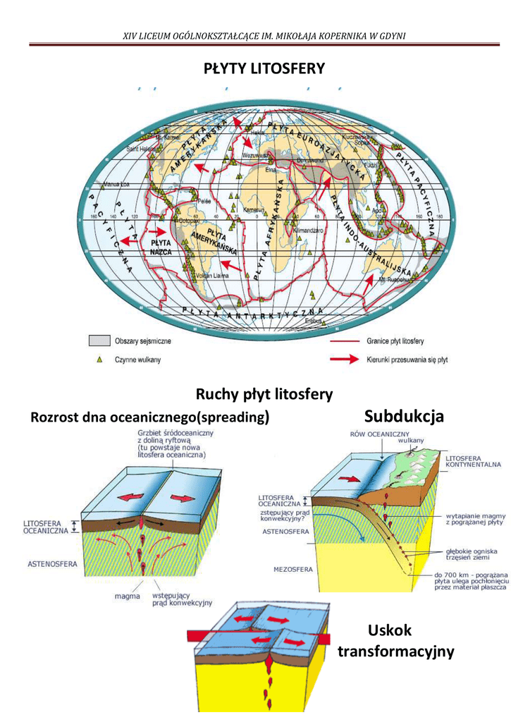 XIV LICEUM OGÓLNOKSZTAŁCĄCE IM. MIKOŁAJA KOPERNIKA W GDYNI PŁYTY LITOSFERY Ruchy płyt litosfery Rozrost dna oceanicznego(spreading) Subdukcja Uskok transformacyjny XIV LICEUM OGÓLNOKSZTAŁCĄCE IM. MIKOŁAJA KOPERNIKA W GDYNI Subdukcja: zagłębianie się płyt w płaszczu Ziemi Płyta oceaniczna wsuwa się pod drugą płytę oceaniczną tworząc ciąg rowów oceanicznych wysp wulkanicznych np. Płyta Pacyficzna i Płyta Euroazjatycka – utworzenie wysp japońskich i rowu japońskiego Płyta oceaniczna wsuwa się pod płytę kontynentalną tworząc rów oceaniczny blisko brzegu i wypiętrzając góry np. Płyta Nasca i Płyta Amerykańska – utworzenie Rowu Atacamskiego i Andów Kolizja dwóch płyt kontynentalnych i wypiętrzenie gór np. kolizja Płyty Indo-australijskiej i Euroazjatyckiej i utworzenie Himalajów XIV LICEUM OGÓLNOKSZTAŁCĄCE IM. MIKOŁAJA KOPERNIKA W GDYNI WULKANIZM Produkty wybuchu wulkanów: Materiał piroklastyczny – ciała stałe (ogniste kamienie) bomby wulkaniczne, lappile scoria, popioły wulkaniczne, fragmenty większych skał, potoki piroklasyczne (spływy) – mieszanina popiołów LAWY – ciała ciekłe stop krzemianowy, oddający do atmosfery składniki lotne np. parę wodną i dwutlenek węgla. Lawy osiągają temperaturę 1000 - 1400°C a krzepną w temperaturze 600 - 700°C kwaśne , zasadowe , poduszkowe Gazy wulkaniczne: Chmury gorejące, Solfatary, Fumarole, mofety Wyróżniamy kilka klasyfikacji wulkanów: 1) podział ze względu na występowanie: Wulkany podmorskie – w dnie oceanicznym, Wulkany kontynentalne 2) podział ze względu na charakter erupcji: Wulkany efuzywne: erupcja przebiega łagodnie i polega przede wszystkim na wylewach rzadkich law bazaltowych. Krater wulkanu wypełnia się powoli lawą powstaje „jezioro ognia” z pióropuszami lawy. Gdy krater zupełnie wypełni się lawą spływa ona po zboczach wulkanu tworząc tzw. „rzeki ognia”. Do takich wulkanów należą wulkany Hawajów Wulkany eksplozywne – erupcja przebiega gwałtownie a głównymi produktami erupcji jest materiał piroklastyczny. Wulkany tego typu są na ogół wulkanami stożkowymi. Stożek jest usypany z materiałów piroklastycznych. Przykładem tego typu wulkanów jest Fudżi – jama Stratowulkany – należą do najczęściej występujących wulkanów i do tego najbardziej niebezpiecznych. Są to wulkany mieszane, których głównym produktem erupcji są lawy kwaśne, materiał piroklastyczny oraz gazy. Erupcję często poprzedzają wstrząsy sejsmiczne spowodowane sprężeniem gazów wulkanicznych, które nie mogą się wydostać na powierzchnię dzięki zakrzepłej lawie. Podczas erupcji często dochodzi do gwałtownego wybuchu stożka, który wylatuje w powietrze lub zapada się tworząc kalderę. Do wulkanów tego typu należą: Święta Helena, Wezuwiusz 3) podział wulkanów ze względu na budowę: Wulkany stożkowe: wysokie wulkany zbudowane z gęstej lawy kwaśnej, o gwałtownym przebiegu wybuchu. Np. Wezuwiusz wulkany tarczowe – mają mniej strome zbocza i powstają przede wszystkim na oceanach. Są to wulkany efuzywne (lawa bazaltowa powstaje w miejscach, gdzie topi się dno oceaniczne – sima).do takich wulkanów należą wulkany Islandii np. Hekla; Hawajów – Mauna Kea, Kilauea, Mauna Loa 4) podział wulkanów ze względu na rodzaj erupcji: erupcja centralna – ciała wulkaniczne wydostają się z krateru na szczycie stożka erupcja linijna – ciała wulkaniczne wydostają się ze szczeliny, której długość może osiągać kilkadziesiąt kilometrów. Takie wulkany występują przede wszystkim w obrębie grzbietów oceanicznych (na uskokach) , na Islandii (wulkan 5) podział wulkanów ze względu na działalność: wulkany czynne – takie, które działają w czasach nam współczesnych np. Św.Helena, Wezuwiusz, Unzen, Popocatepetl, Etna, Ruapehu. Obecnie na świecie jest ok. 1500 czynnych wulkanów wulkany drzemiące – takie, które wybuchały w czasach historycznych i wzmianki o ich działalności zamieszczono w kronikach. Do takich wulkanów należy Fudżi, który ostatni raz wybuchł w 1772 roku. Wulkany wygasłe – góry o budowie wulkanicznej, które nie wybuchały wczasach historycznych. Są to np. wulkany Owernii XIV LICEUM OGÓLNOKSZTAŁCĄCE IM. MIKOŁAJA KOPERNIKA W GDYNI RUCHY GÓROTWÓRCZE Góry powstają w czasie orogenezy (to okres powstawania gór) Większość orogenez miała miejsce w prekambrze. W dzisiejszej rzeźbie kontynentów możemy wyróżnić góry, które powstały później – w 3 orogenezach a) orogeneza kaledońska – miała miejsce w erze paleozoicznej na przełomie syluru i dewonu. Góry, które wówczas powstały nazywamy Kaledoniami. Są to m.in. G. Skandynawskie, G. Kaledońskie, G. Grampian, Sajany b) orogeneza hercyńska (=waryscyjska) – miała miejsce w Paleozoiku w karbonie. Do hercynidów możemy zaliczyć m.in. Gory Harz, Sudety, G. Świętokrzyskie, Reńskie Góry Łupkowe, Wogezy, Schwarzwald, Appalachy, Wielkie GóryWododziałowe. c) orogeneza alpejska – miała miejsce na przełomie Mezozoiku i Kenozoiku (od końca kredy do połowy trzeciorzędu). Alpidy to najwyższe góry świata i najmłodsze. Zaliczamy do nich: Góry Betyckie, Pireneje, Alpy, Apeniny, Góry Dynarskie, Karpaty, Góry Pontyjskie, Zagros , Kaukaz, Kopet Dag, Pamir, Hindukusz, Karakorum, Himalaje, Andy RODZAJE GÓR a) fałdowe – zbudowane są ze struktur fałdowych (patrz lekcja o typach ułożenia warstw skalnych). Są to młode góry fałdowe, czyli alpidy np. Himalaje, Alpy, Andy b) zrębowe – zbudowane są ze struktur zrębowych (zrębów i rowów tektonicznych). Do tej grupy należą głównie hercynidy np. Wogezy i Schwarzwald rozdzielone rowem tektonicznym Renu czy Sudety c) wulkaniczne – chodzi o wulkany np. Kilimandżaro – najwyższy szczyt Afryki RUCHY IZOSTATYCZNE I EPEJROGENICZNE Ruchy epejrogeniczne i izostatyczne dotyczą pionowego ruchu płyt litosfery lub tylko ich części.