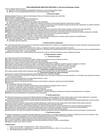 REGULAMIN MIEJSKIEJ BIBLIOTEKI PUBLICZNEJ im. Hieronima Derdowskiego w Redzie Ilekroć w niniejszym tekście jest mowa o: a) „Regulaminie” oznacza to Regulamin Miejskiej Biblioteki Publicznej im. Hieronima Derdowskiego w Redzie. b) „Bibliotece” oznacza to Miejską Bibliotekę Publiczną im. Hieronima Derdowskiego w Redzie. I. Postanowienia ogólne. §1 Miejska Biblioteka Publiczna im. Hieronima Derdowskiego w Redzie swoim działaniem obejmuje teren miasta Redy. §2 Zbiory Biblioteki są ogólnie dostępne. §3 Do korzystania z usług Biblioteki upoważnia karta biblioteczna. §4 Przy zapisie do Biblioteki osoba zgłaszająca się powinna: a) okazać dokument stwierdzający tożsamość oraz aktualny adres zamieszkania, b) wypełnić kartę zapisu i po zapoznaniu się z Regulaminem potwierdzić zobowiązanie do przestrzegania Regulaminu własnoręcznym podpisem. §5 Osoby niepełnoletnie może zapisać rodzic lub opiekun prawny, na podstawie tymczasowego dowodu osobistego lub legitymacji szkolnej osoby niepełnoletniej. Za czytelnika niepełnoletniego podpisuje zobowiązanie i ponosi odpowiedzialność jedno z rodziców lub opiekun prawny. §6 Za kartę biblioteczną pobiera się opłatę w wysokości 2,00 zł /dwa złote 00/100/ §7 Użytkownik zobowiązany jest do zgłoszenia Bibliotece faktu utraty karty bibliotecznej. Za wykonanie wtórnika pobiera się opłatę w wysokości 2,00 zł /dwa złote 00/100/. §8 Biblioteka nie ponosi odpowiedzialności za posługiwanie się kartą biblioteczną przez osobę trzecią do czasu złożenia zastrzeżenia przez jej właściciela. §9 Podpisem na karcie zapisu użytkownik wyraża zgodę na wykorzystywanie jego danych osobowych w celach statystycznych oraz związanych ze zwrotem wypożyczonych materiałów bibliotecznych, dochodzeniem ewentualnego odszkodowania. Niniejsze nie narusza ustawy o ochronie danych osobowych. §10 Użytkownik ma obowiązek informować Bibliotekę o zmianie nazwiska, miejsca zamieszkania. §11 Materiały biblioteczne udostępniane są: na miejscu, w czytelni, poprzez wypożyczenia indywidualne na zewnątrz, poprzez wypożyczenia międzybiblioteczne. §12 Ze zbiorów poszczególnych agend, ze względu na ich charakter, korzystać mogą: a) wypożyczalni dla Dorosłych – osoby, które ukończyły 18 lat, b) z pozostałych agend bez ograniczeń. II. Zasady korzystania z wypożyczalni. §1 Z wypożyczalni jednorazowo można wypożyczyć 3 egzemplarze materiałów bibliotecznych. Użytkownicy nie posiadający zameldowania na terenie miasta Redy mogą wypożyczyć jednorazowo 1 egzemplarz materiałów bibliotecznych. §2 Z księgozbioru podręcznego Biblioteki korzysta się tylko na miejscu, w wyjątkowych wypadkach wypożycza się książkę na 24 godziny. §3 Materiały biblioteczne wypożycza się na okres nieprzekraczający 30 dni. Jeżeli jednak zwrot materiałów bibliotecznych przypada na święto, dzień wolny od pracy to materiały biblioteczne należy zwrócić przed tym dniem – w dniu pracy Biblioteki. §4 Bibliotekarz może żądać zwrotu materiałów bibliotecznych przed terminem ustalonym w §3, jeżeli stanowią one pozycje szczególnie poszukiwane. III. Zasady korzystania z czytelni. A. Postanowienia ogólne. §1 Z czytelni może korzystać każdy zainteresowany. §2 W czytelni obowiązuje cisza, zakaz spożywania napojów i posiłków oraz prowadzenia rozmów przez telefony komórkowe. §3 Wnoszone do czytelni materiały własne należy zgłosić u dyżurnego bibliotekarza. §4 Zabrania się wynoszenia materiałów bibliotecznych będących własnością Biblioteki, poza jej siedzibę. §5 Z księgozbioru czytelni korzysta się wyłącznie na miejscu i za pośrednictwem bibliotekarza, w wyjątkowych wypadkach wypożycza się książkę na 24 godziny. §6 Na prośbę czytelnika, Biblioteka może sprowadzić książki z innych bibliotek. Materiały sprowadzone udostępniane są wyłącznie w czytelni. §7 Czytelnik może zwracać się do dyżurnego bibliotekarza o informacje dotyczące książek, czasopism, o pomoc w korzystaniu z katalogów. §8 Pracownicy Biblioteki są uprawnieni do dokonywania kontroli sposobu korzystania z materiałów bibliotecznych przez użytkownika. B. Postanowienia szczególne dla czytelni czasopism. §1 W czytelni czasopism czytelnik wybiera samodzielnie jedynie bieżące numery czasopism i prasy, po czym informuje o tym pracownika biblioteki. C. Postanowienia szczególne dla czytelni internetowej. §1 Korzystanie ze sprzętu informatycznego będącego własnością Biblioteki, w tym z Internetu jest bezpłatne. §2 Czas pracy na komputerach jest ograniczony i w danym dniu może trwać 60 minut. Czas pracy na komputerze może zostać przedłużony, o ile nie będzie innych użytkowników oczekujących na dostęp do komputera. §3 Przy jednym stanowisku komputerowym nie mogą przebywać więcej niż 1 osoba. §4 Praca na komputerach Biblioteki jest monitorowana. §5 Informacji wyszukanych w licencjonowanych bazach danych nie można edytować, przetwarzać, zapisywać na komputerach Biblioteki. §6 Zabrania się: a) samodzielnego instalowania oprogramowania, b) otwierania stron zawierających nielegalne oprogramowanie, treści pornograficzne, propagujące przemoc, rasizm itp., c) korzystania z wszelkich gier, zabaw komputerowych, komunikatorów internetowych, d) podłączania przenośnych komputerów do bibliotecznej sieci komputerowej, e) wykonywania samodzielnie jakichkolwiek napraw i konfiguracji sprzętu komputerowego. §7 Użytkownik jest zobowiązany do poinformowania pracownika Biblioteki o wszystkich zauważonych uszkodzeniach komputera lub nieprawidłowościach w ich działaniu. §8 Biblioteka nie ponosi odpowiedzialności za pozostawione dane w komputerach. IV. Sankcje regulaminowe. §1 Użytkownik jest obowiązany do poszanowania materiałów bibliotecznych będących własnością Biblioteki. Powinien zwrócić uwagę na ich stan przed udostępnieniem, a zauważ