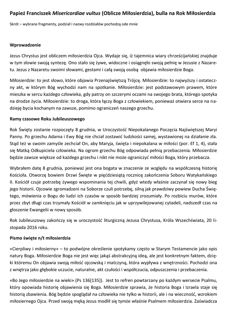 Papież Franciszek Misericordiae vultus (Oblicze Miłosierdzia), bulla na Rok Miłosierdzia Skrót – wybrane fragmenty, podział i nazwy rozdziałów pochodzą ode mnie Wprowadzenie Jezus Chrystus jest obliczem miłosierdzia Ojca. Wydaje się, iż tajemnica wiary chrześcijańskiej znajduje w tym słowie swoją syntezę. Ono stało się żywe, widoczne i osiągnęło swoją pełnię w Jezusie z Nazaretu. Jezus z Nazaretu swoimi słowami, gestami i całą swoją osobą objawia miłosierdzie Boga. Miłosierdzie: to jest słowo, które objawia Przenajświętszą Trójcę. Miłosierdzie: to najwyższy i ostateczny akt, w którym Bóg wychodzi nam na spotkanie. Miłosierdzie: jest podstawowym prawem, które mieszka w sercu każdego człowieka, gdy patrzy on szczerymi oczami na swojego brata, którego spotyka na drodze życia. Miłosierdzie: to droga, która łączy Boga z człowiekiem, ponieważ otwiera serce na nadzieję bycia kochanym na zawsze, pomimo ograniczeń naszego grzechu. Ramy czasowe Roku Jubileuszowego Rok Święty zostanie rozpoczęty 8 grudnia, w Uroczystość Niepokalanego Poczęcia Najświętszej Maryi Panny. Po grzechu Adama i Ewy Bóg nie chciał zostawić ludzkości samej, wystawionej na działanie zła. Stąd też w swoim zamyśle zechciał On, aby Maryja, święta i niepokalana w miłości (por. Ef 1, 4), stała się Matką Odkupiciela człowieka. Na ogrom grzechu Bóg odpowiada pełnią przebaczenia. Miłosierdzie będzie zawsze większe od każdego grzechu i nikt nie może ograniczyć miłości Boga, który przebacza. Wybrałem datę 8 grudnia, ponieważ jest ona bogata w znaczenie ze względu na współczesną historię Kościoła. Otworzę bowiem Drzwi Święte w pięćdziesiątą rocznicę zakończenia Soboru Watykańskiego II. Kościół czuje potrzebę żywego wspominania tej chwili, gdyż wtedy właśnie zaczynał się nowy bieg jego historii. Ojcowie zgromadzeni na Soborze czuli potrzebę, silną jak prawdziwy powiew Ducha Świętego, mówienia o Bogu do ludzi ich czasów w sposób bardziej zrozumiały. Po rozbiciu murów, które przez zbyt długi czas trzymały Kościół w zamknięciu jak w uprzywilejowanej cytadeli, nadszedł czas na głoszenie Ewangelii w nowy sposób. Rok Jubileuszowy zakończy się w uroczystość liturgiczną Jezusa Chrystusa, Króla Wszechświata, 20 listopada 2016 roku. Pismo święte n/t miłosierdzia «Cierpliwy i miłosierny» – to podwójne określenie spotykamy często w Starym Testamencie jako opis natury Boga. Miłosierdzie Boga nie jest więc jakąś abstrakcyjną ideą, ale jest konkretnym faktem, dzięki któremu On objawia swoją miłość ojcowską i matczyną, która wypływa z wnętrzności. Pochodzi ona z wnętrza jako głębokie uczucie, naturalne, akt czułości i współczucia, odpuszczenia i przebaczenia. «Bo Jego miłosierdzie na wieki» (Ps 136[135]). Jest to refren powtarzany po każdym wersecie Psalmu, który opowiada historię objawienia się Boga. Miłosierdzie sprawia, że historia Boga i Izraela staje się historią zbawienia. Bóg będzie spoglądał na człowieka nie tylko w historii, ale i na wieczność, wzrokiem miłosiernego Ojca. Przed swoją męką Jezus modlił się tymże właśnie Psalmem miłosierdzia. Zaświadcza o tym Ewangelista Mateusz, gdy pisze, że «po odśpiewaniu hymnu» (Mt 26, 30) Jezus wraz z uczniami wyszli w stronę Góry Oliwnej. Podczas, gdy Jezus odprawiał po raz pierwszy Eucharystię, jako Wieczną Pamiątkę swojej realnej obecności pomiędzy nami, umiejscawiał symbolicznie ten najwyższy akt Objawienia w świetle miłosierdzia. W tymże samym horyzoncie miłosierdzia Jezus przeżywał swoją mękę i śmierć, świadomy wielkiej tajemnicy miłości, która wypełniła się na krzyżu. Świadomość, że sam Jezus modlił się tym Psalmem, czyni go dla nas chrześcijan jeszcze ważniejszym i sprawia, że powinien stać się on naszą modlitwą uwielbienia: «Bo Jego miłosierdzie na wieki». Osoba Jezusa jest niczym innym jak tylko miłością. To miłość, która się daje za darmo. Znaki, które czyni przede wszystkim w stosunku do grzeszników, do biednych, wyłączonych, chorych i cierpiących, są naznaczone miłosierdziem. Wszystko w Nim mówi o miłosierdziu. Nie ma też w Nim czegoś, co byłoby pozbawione współczucia. W przypowieściach poświęconych miłosierdziu Jezus objawia naturę Boga jako naturę Ojca, który nigdy nie uważa się za zwyciężonego dopóki nie sprawi, że poprzez współczucie i miłosierdzie zniknie grzech i pokonane zostanie odrzucenie. Znajdujemy w nich istotę Ewangelii oraz naszej wiary, ponieważ miłosierdzie jest ukazane jako siła, która zwycięża wszystko, która wypełnia serce miłością i pociesza przebaczeniem. W innej przypowieści natomiast otrzymujemy naukę dotyczącą naszego chrześcijańskiego stylu życia. Sprowokowany pytaniem Piotra, ile razy należałoby przebaczyć, Jezus odpowiedział: «Nie mówię ci, że aż siedem razy, lecz aż siedemdziesiąt siedem razy» (Mt 18, 22) i opowiedział przypowieść o „nielitościwym dłużniku”. Ta przypowieść zawiera głęboką naukę dla każdego z nas. Jezus stwierdza, że miłosierdzie to nie jest tylko działanie Ojca, lecz staje się kryterium potrzebnym do zrozumienia, kim są Jego prawdziwi synowie. Jesteśmy więc wezwani do życia miłosierdziem, ponieważ to nam zostało najpierw udzielone miłosierdzie. Przebaczenie zniewag staje się najbardziej ewidentnym wyrazem miłości miłosiernej, a dla nas chrześcijan jest nakazem, którego nie możemy pominąć. Jakże wydaje się nieraz trudne to przebaczenie! A jednak jest ono narzędziem złożonym w nasze ręce, abyśmy byli w stanie osiągnąć spokój serca. Tak, jak kocha Ojciec, tak też powinni kochać i synowie. Jak On jest miłosierny, tak też i my jesteśmy wezwani, by być miłosierni: jedni wobec drugich. Kościół i miłosierdzie Główną belką, na której wspiera się życie Kościoła,